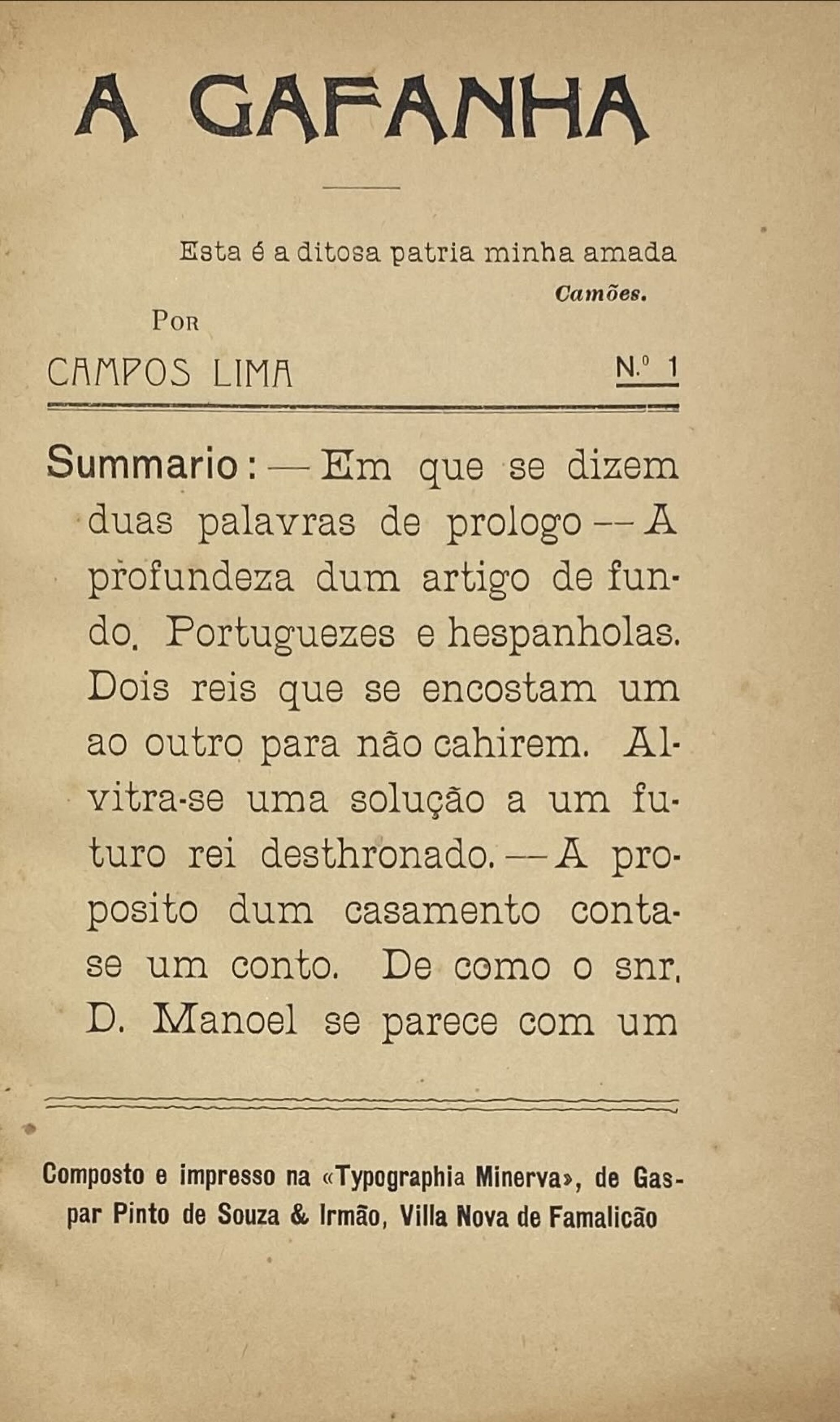 GAFANHA (A). Director: Campos Lima. Nº1 (ao Nº8). Vila Nova de Famalicão. Typ. Minerva. (1909). 8 nos. In-8º Encs. em 1