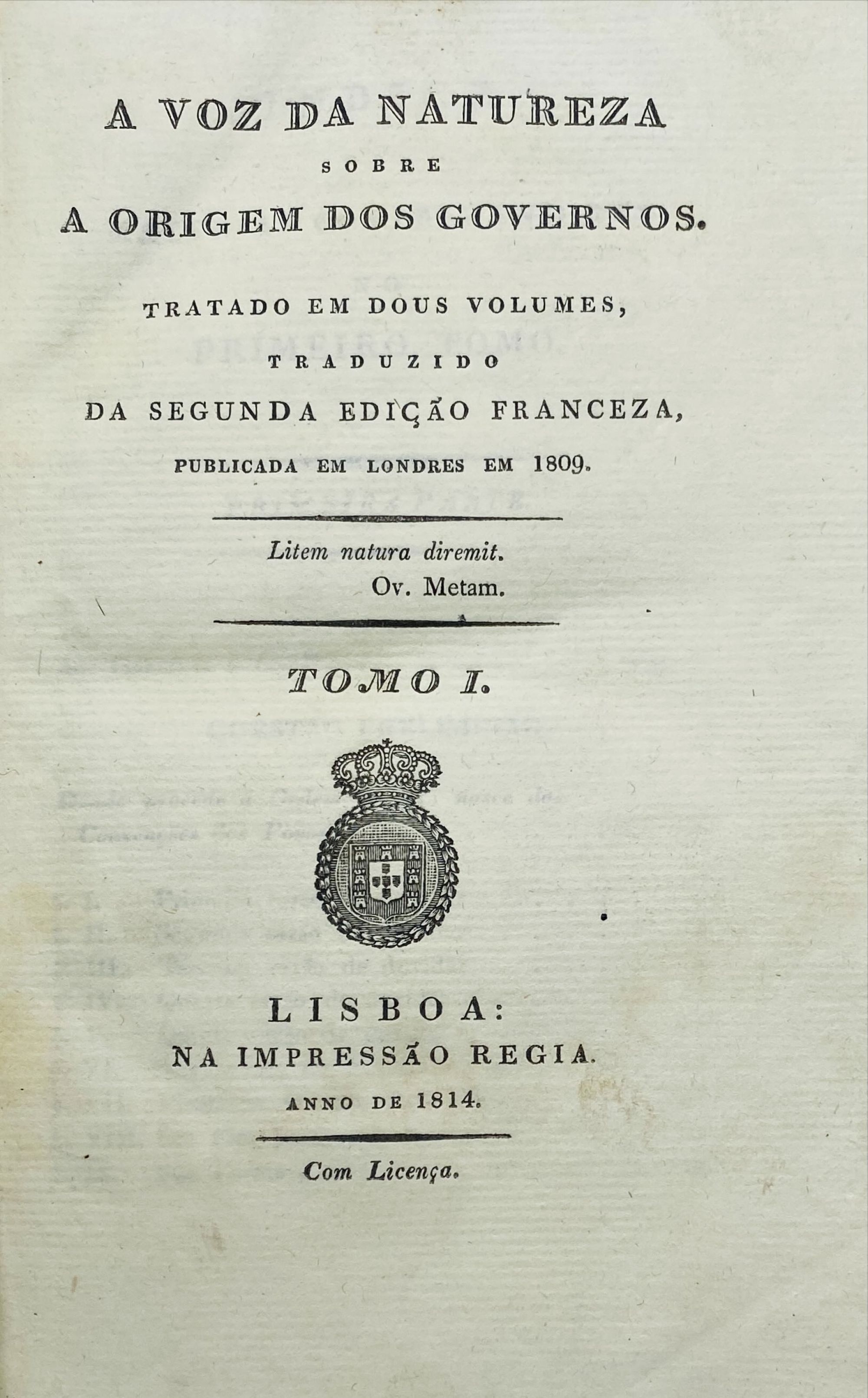 GALVÃO, Joaquim de Santo Agostinho Brito França. - A VOZ DA NATUREZA SOBRE A ORIGEM DOS GOVERNOS. Tratado em dous volumes. Traduzido da segunda edição francesa. Tomo I (e II).