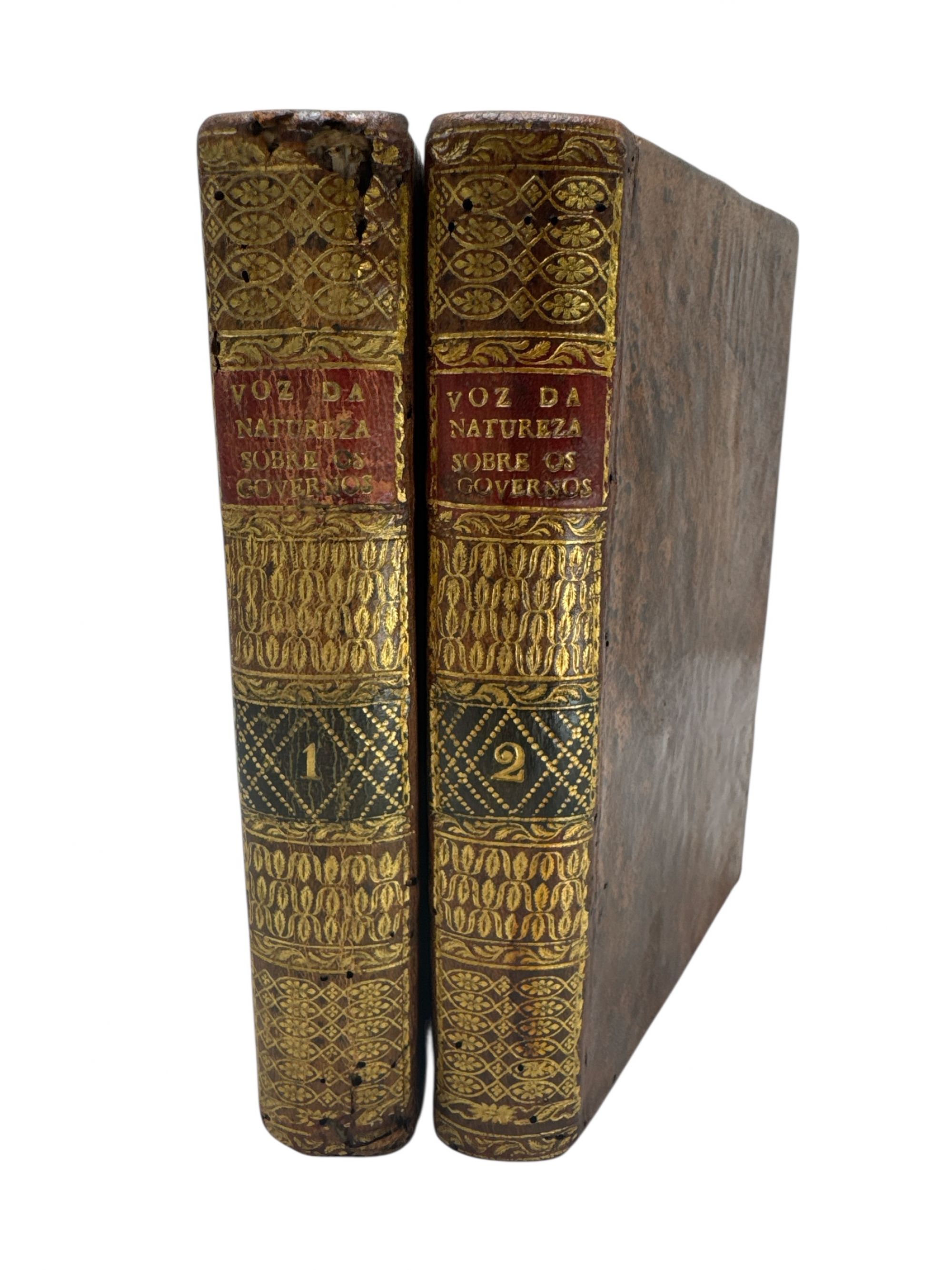 GALVÃO, Joaquim de Santo Agostinho Brito França. - A VOZ DA NATUREZA SOBRE A ORIGEM DOS GOVERNOS. Tratado em dous volumes. Traduzido da segunda edição francesa. Tomo I (e II). Lisboa. Impressão Regia. 1814. 2 Vols. In-8º Encs.