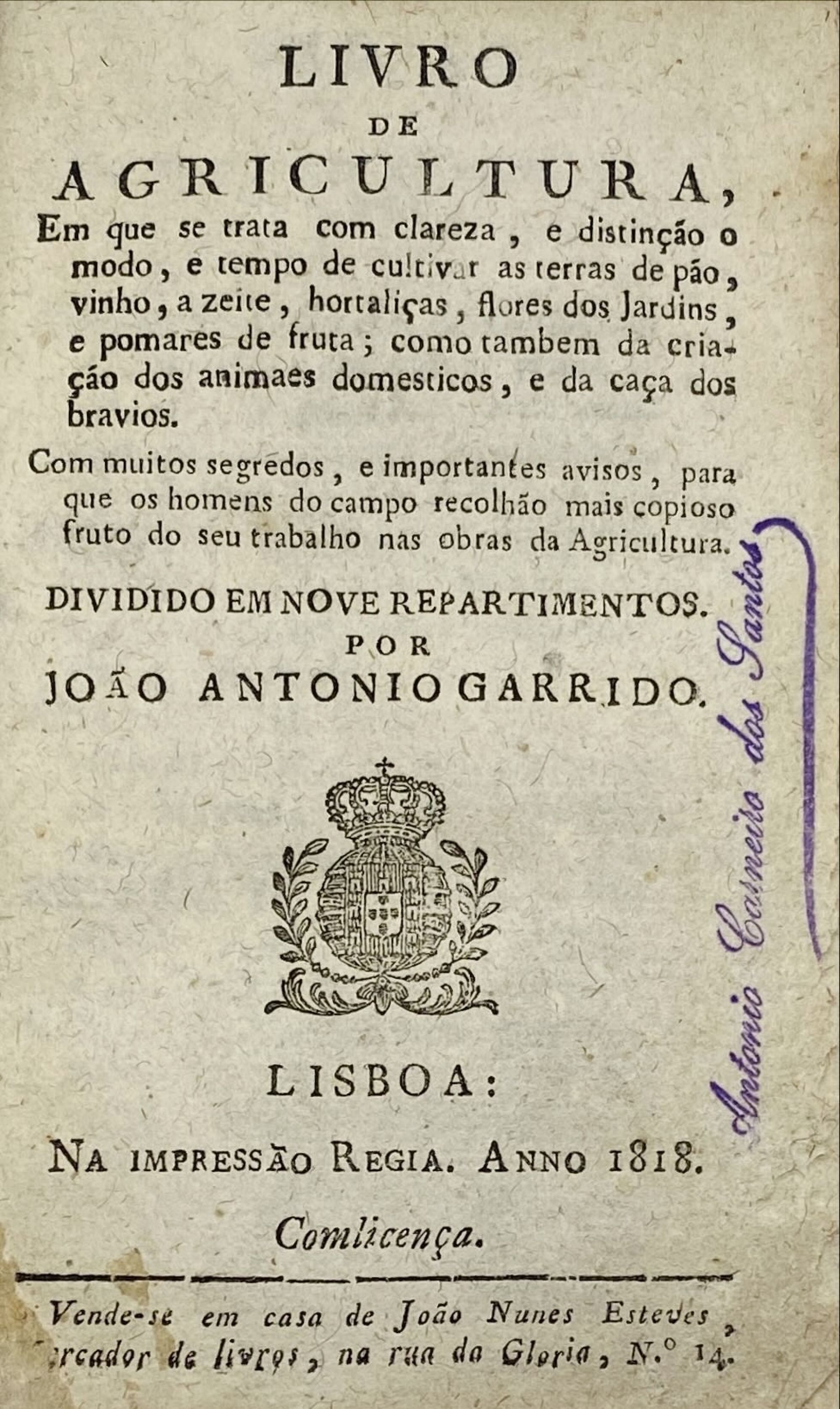 GARRIDO, João António. - LIVRO DE AGRICULTURA EM QUE SE TRATA COM CLAREZA, E distinção do modo, e tempo de cultivar as terras de Pão, Vinho, Azeite, Hortaliças, Flores dos Jardins, e Pumares de fruta; como tambem da Criação dos Animaes domesticos, e da cassa dos bravios. Com muitos segredos, e importantes avizos, para que os homens do Campo colhão mais copioso fruto do seu trabalho nas obras da Agricultura. Dividido em nove Repartimentos Lisboa. Na impressão Regia. 1808. In-8º de 180 págs. Enc.