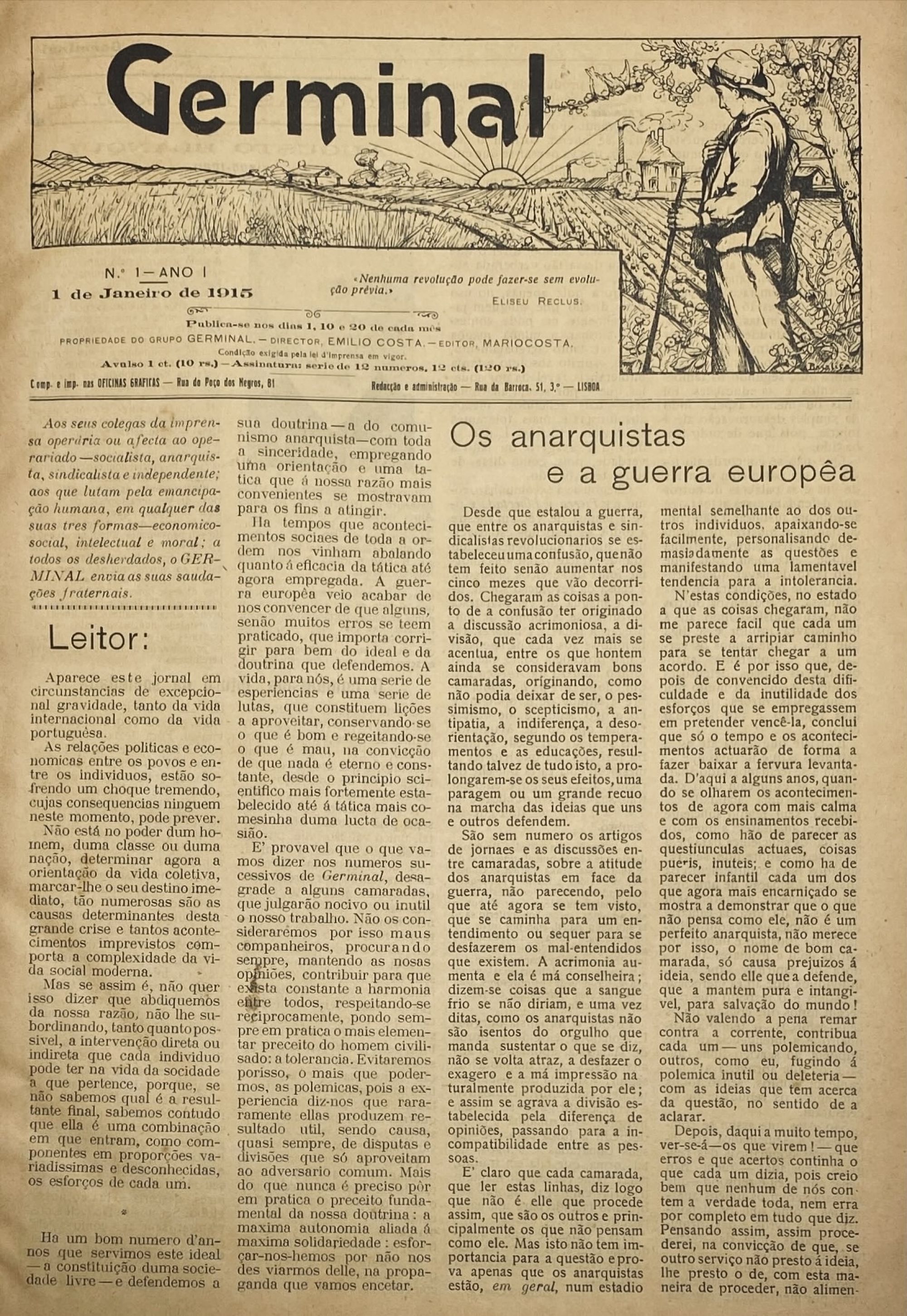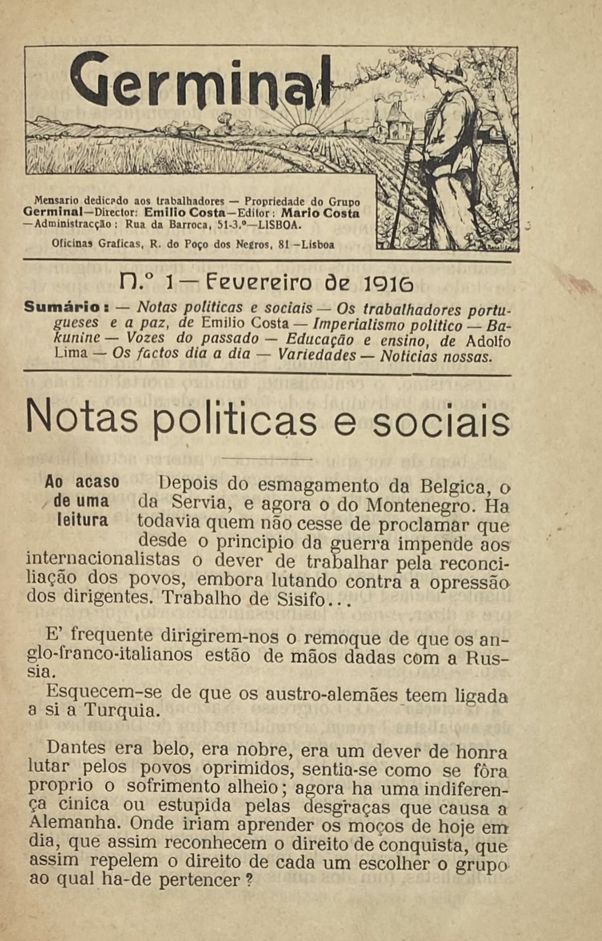 GERMINAL. Mensário dedicado aos trabalhadores. Director: Emilio Costa. Editor: Mario Costa.