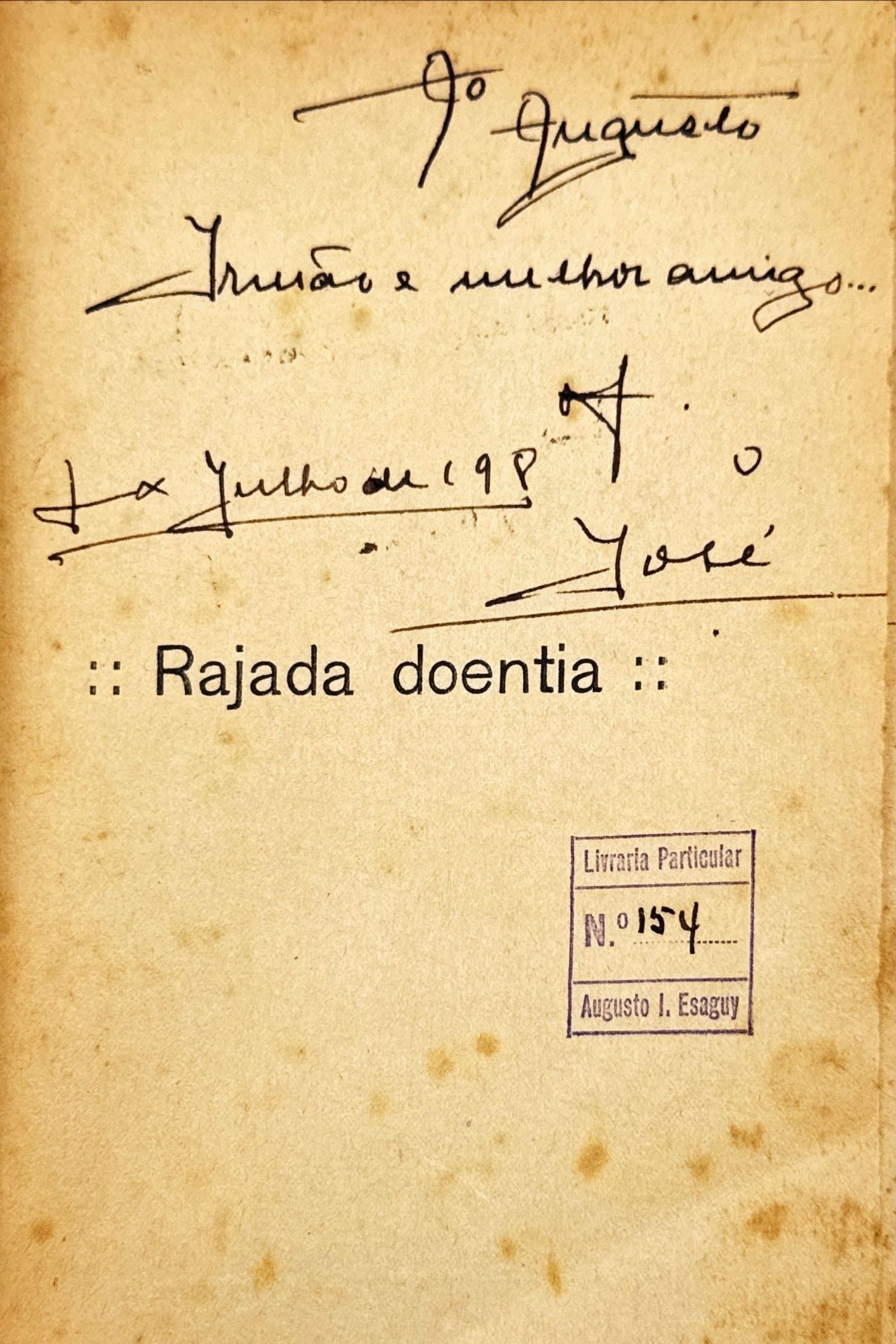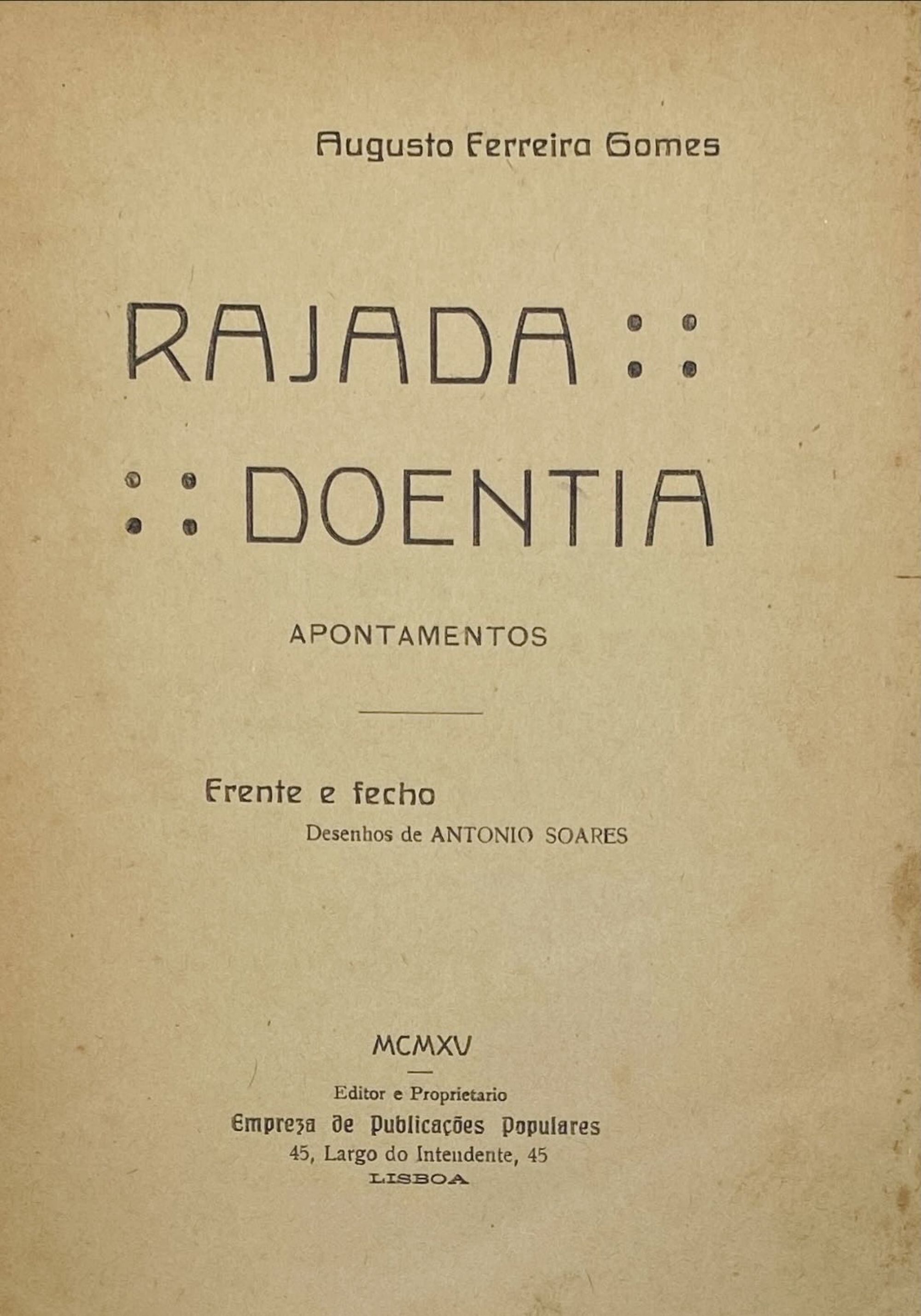 GOMES, Augusto Ferreira. - RAJADA DOENTIA. Apontamentos. Desenhos de António Soares. Lisboa. Empreza de publicações Populares. 1915. In-8º de 109, [1] págs. Br.