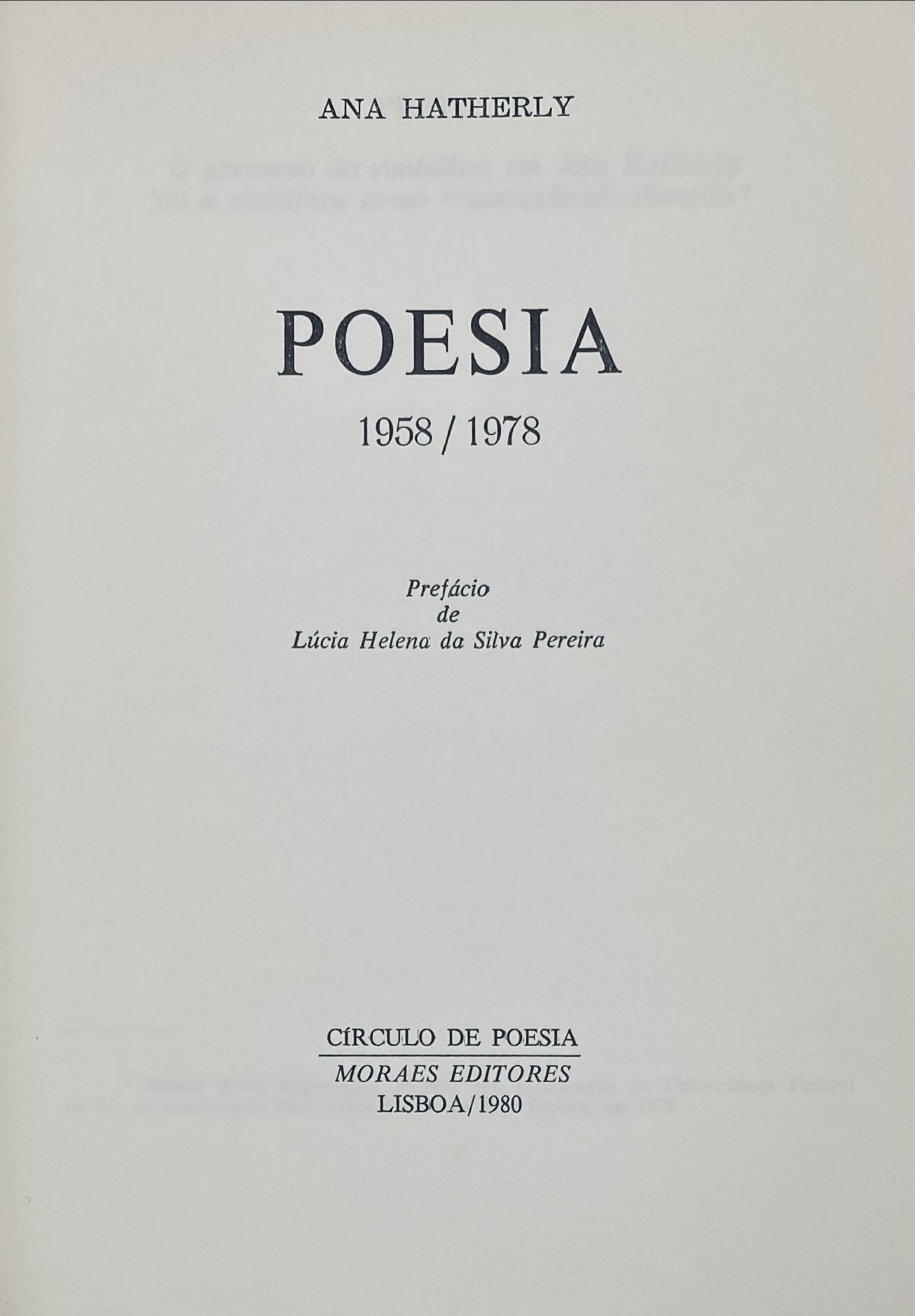 HATHERLY, Ana. - POESIA. (1958-1978). Prefácio de Lúcia Helena da Silva Pereira. Lisboa. Moraes Editores. 1980. In-8º de [1] págs. Br.