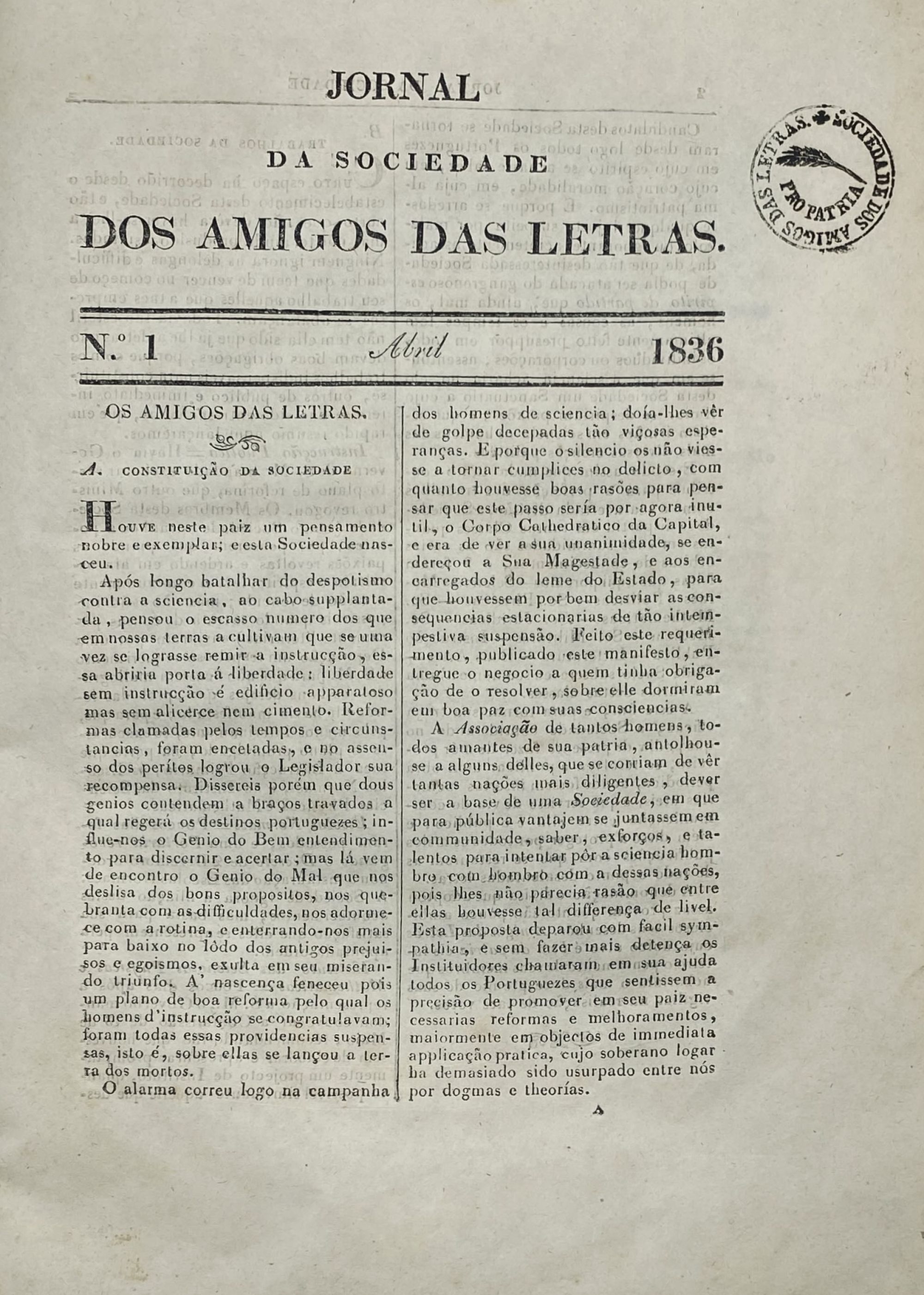 JORNAL DA SOCIEDADE DOS AMIGOS DAS LETRAS. Nº1 - abril de 1836 (ao Nº5 - agosto de 1836).