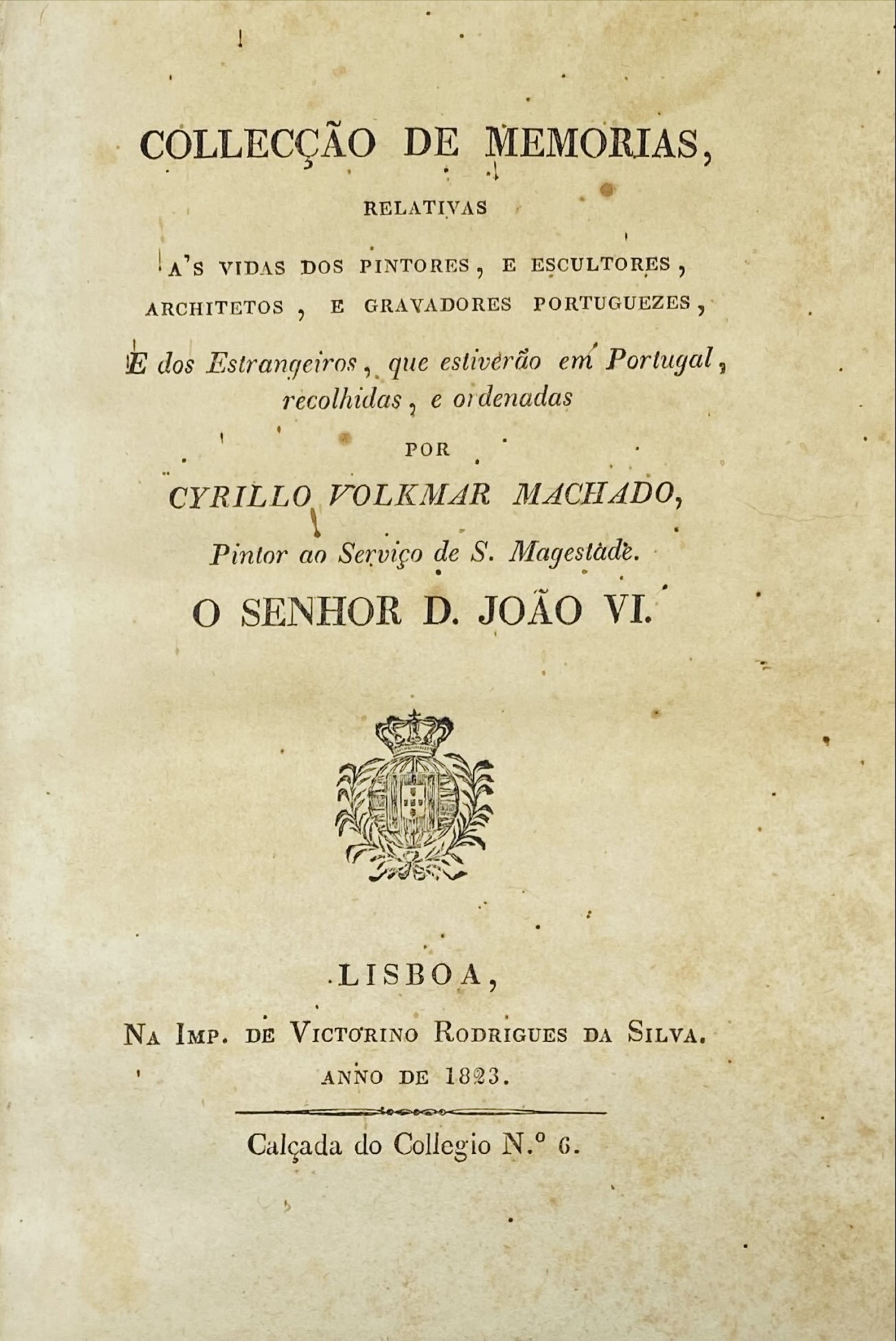 MACHADO, Cyrillo Wolkmar. - COLLECÇÃO DE MEMORIAS RELATIVAS ÁS VIDAS DOS PINTORES, E ESCULTORES, ARCHITETOS, E GRAVADORES PORTUGUEZES, e dos Estrangeiros, que estiveram em Portugal, recolhidas e ordenadas por... Lisboa. Na Imp. De Victorino Rodrigues da Silva. 1823. In-8º de 330 págs. Enc.