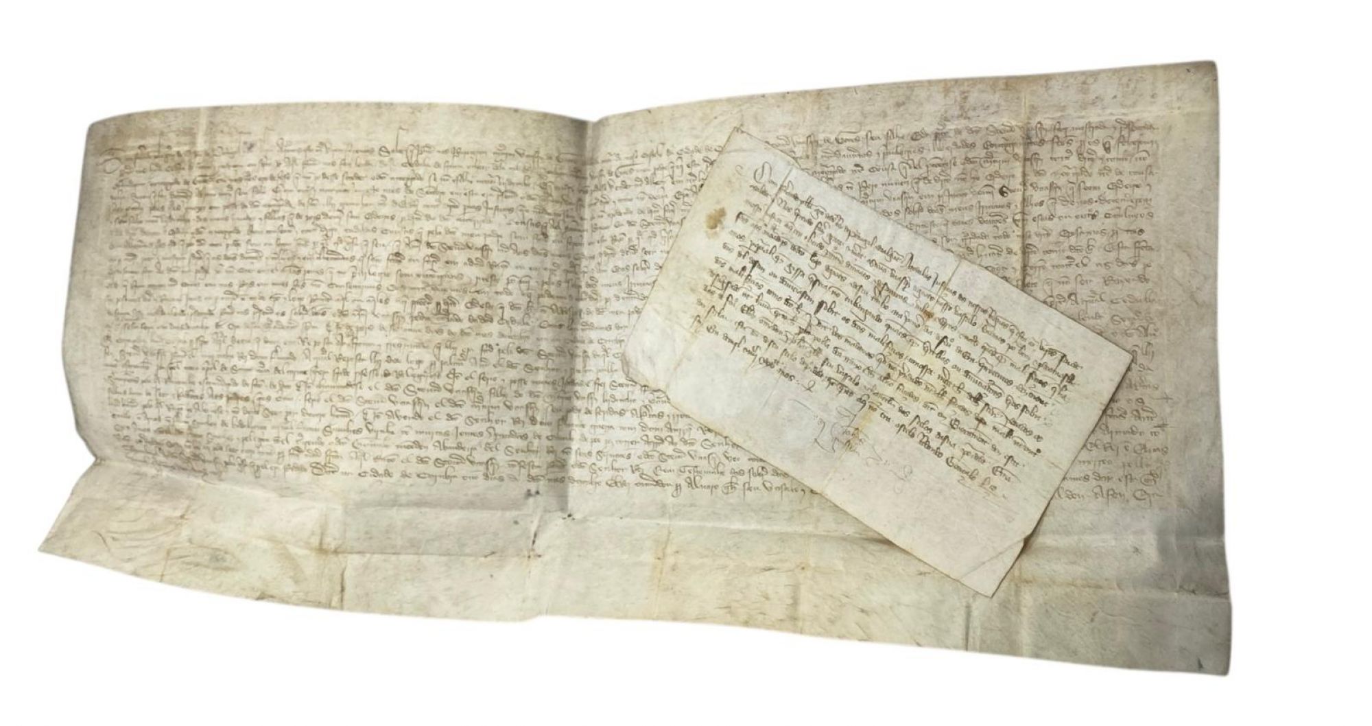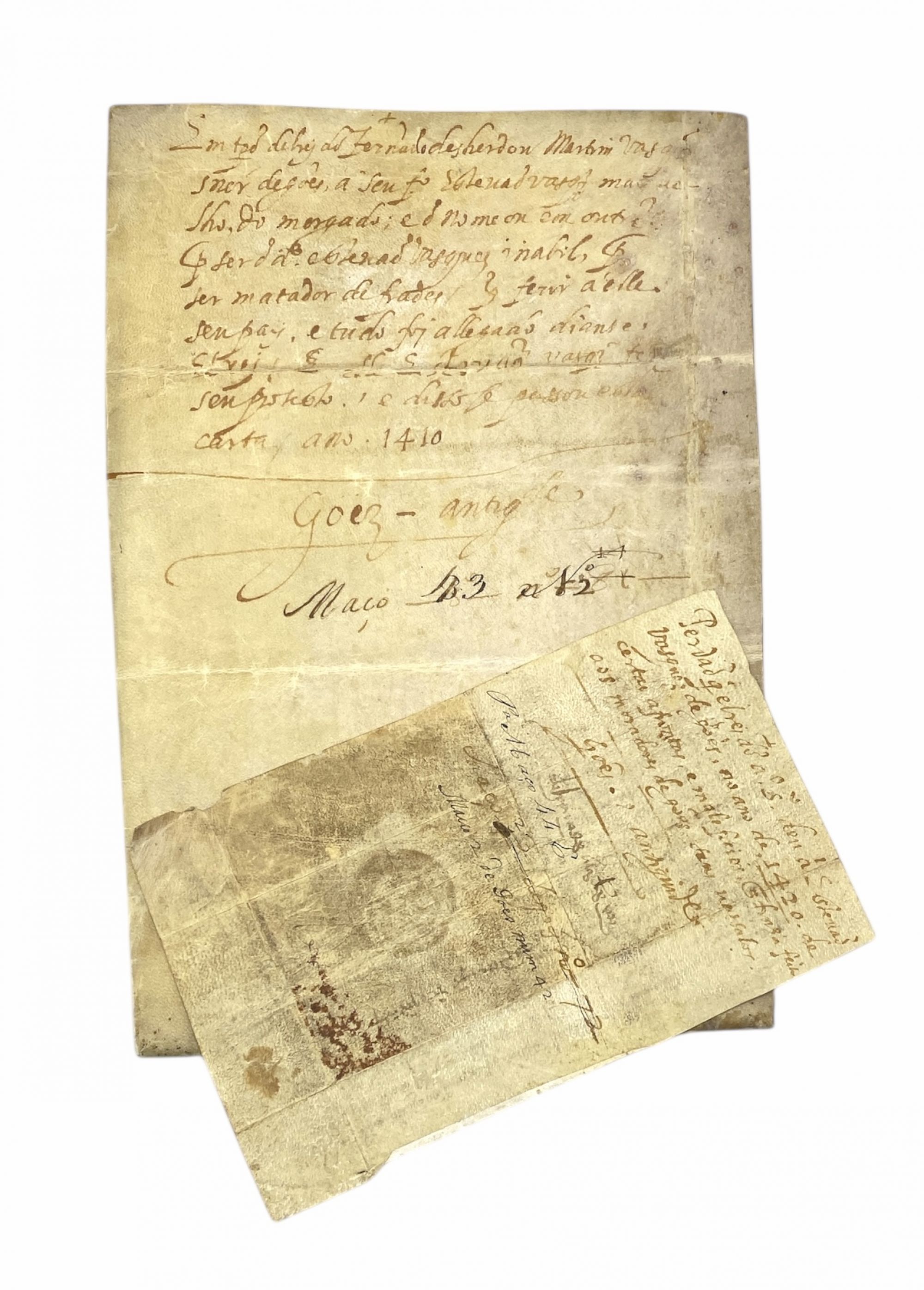 Conjunto de 2 curiosas manuscritos de El-Rei D. Fernando. O primeiro em 1410 a favor de Martim Vasquez de Gois, alcaide mor do nosso Castelo da Cidade de Coimbra para deserdar o seu filho Estevão Vasquez para que não possa suceder ao seu morgado e as suas terras.