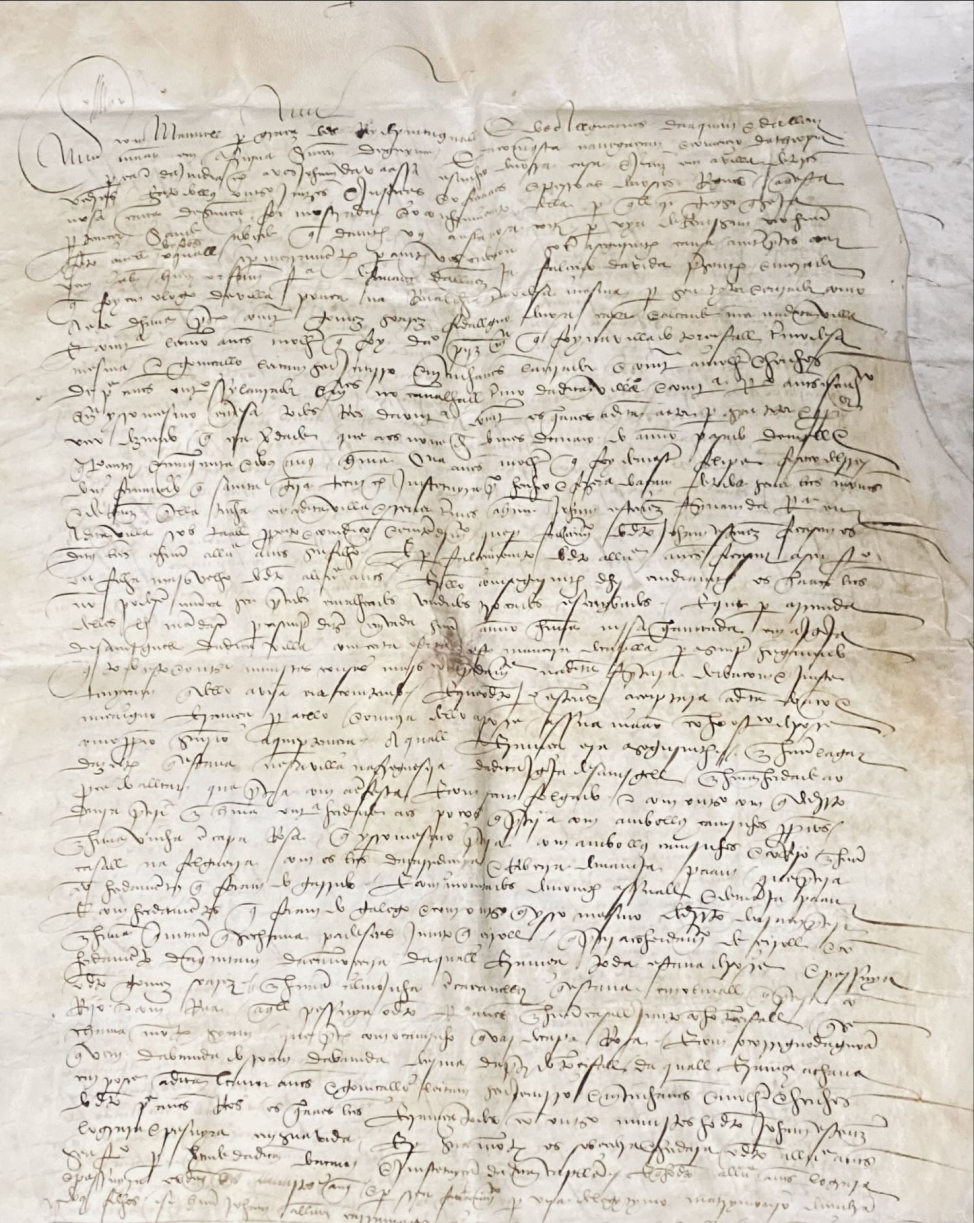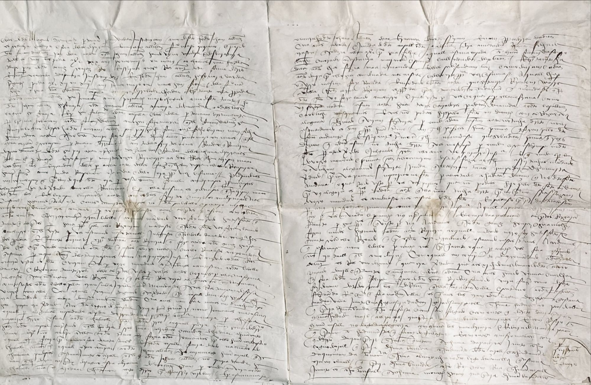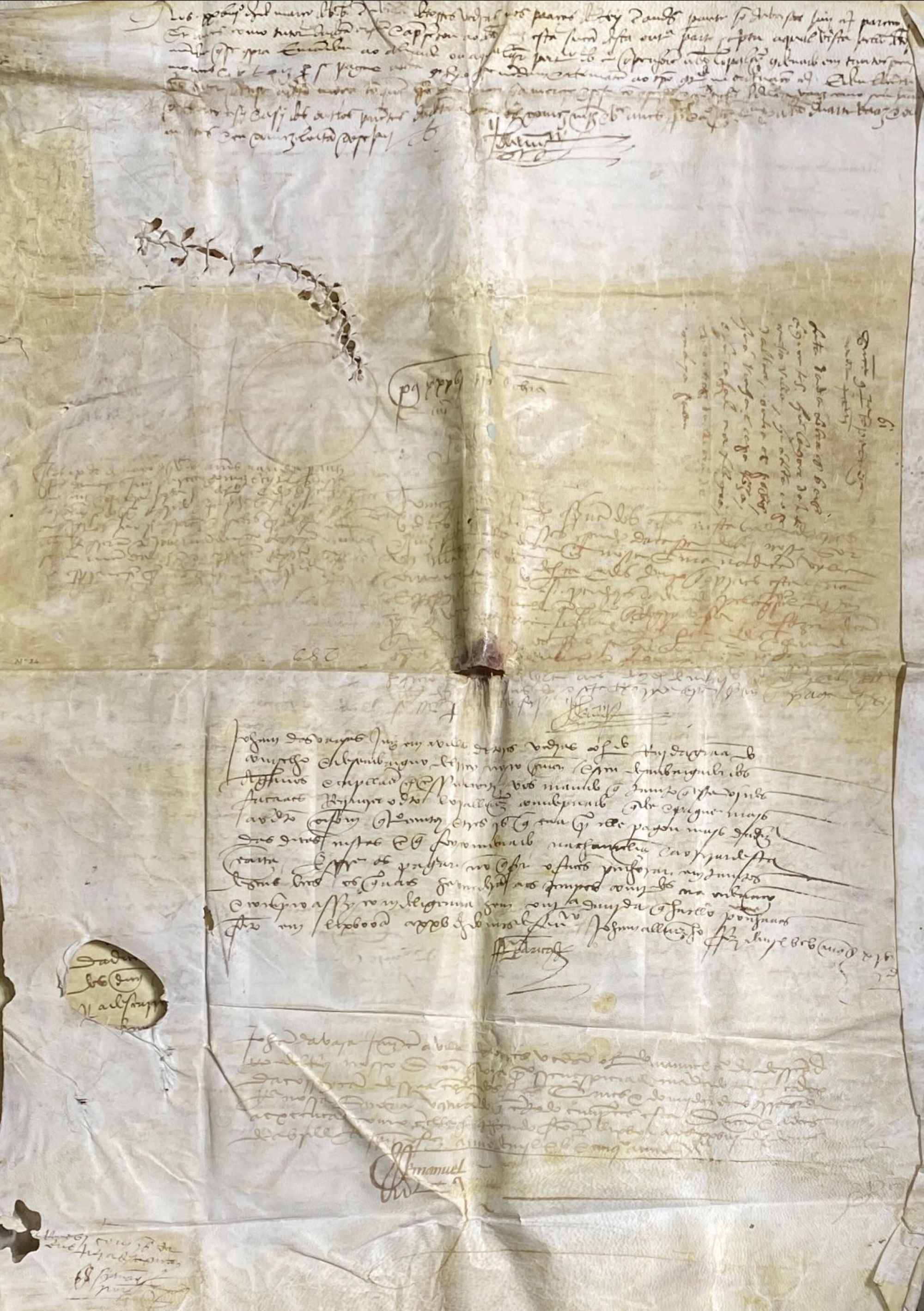 Manuscrito de grandes dimensões de 3 folhas em pergaminho de bela caligrafia. O manuscrito apresenta na folha 2 e 3 furos de possíveis selos reais que foram retirados, apresenta também um restauro antigo cozido com linha