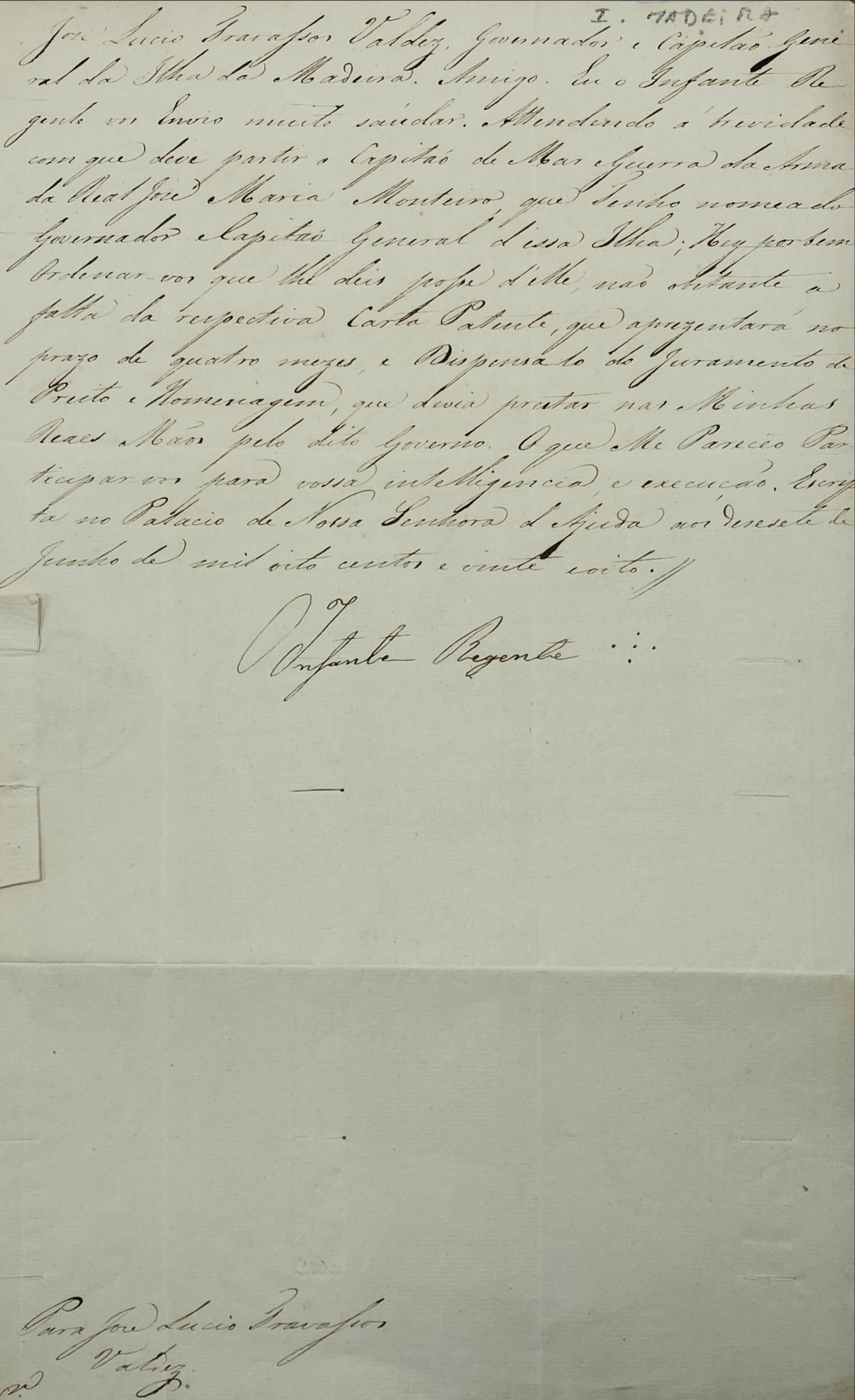 Carta dirigida a José Lúcio Travassos Valdez (Conde do Bonfim). Governador e Capitão General da Ilha da Madeira.