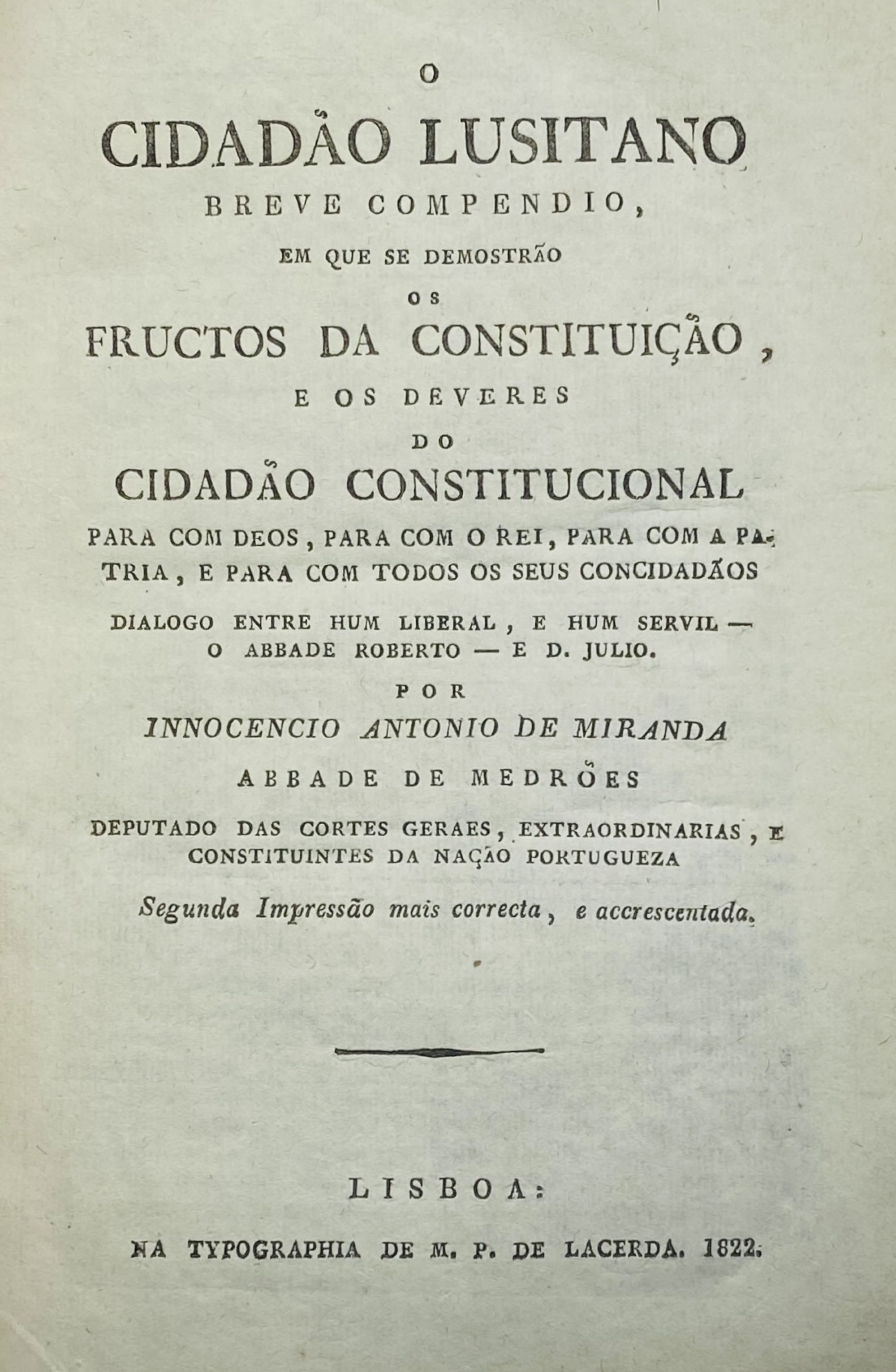 MIRANDA, Inocencio António de. - O CIDADÃO LUSITANO. Breve compendio, em que se demonstrão os fructos da Constituição, e os deveres do Cidadão Constitucional para com deos, para com o rei, para com a patria, e para com todos os seus concidadãos. Dialogo entre hum liberal, e hum servil - o Abade Roberto e D. Julio. Segunda impressão mais correcta, e accrescentada. Lisboa. Na Typographia de M. P. de Lacerda. 1822. In-8º de 143, [1],23, [1] págs. Br.