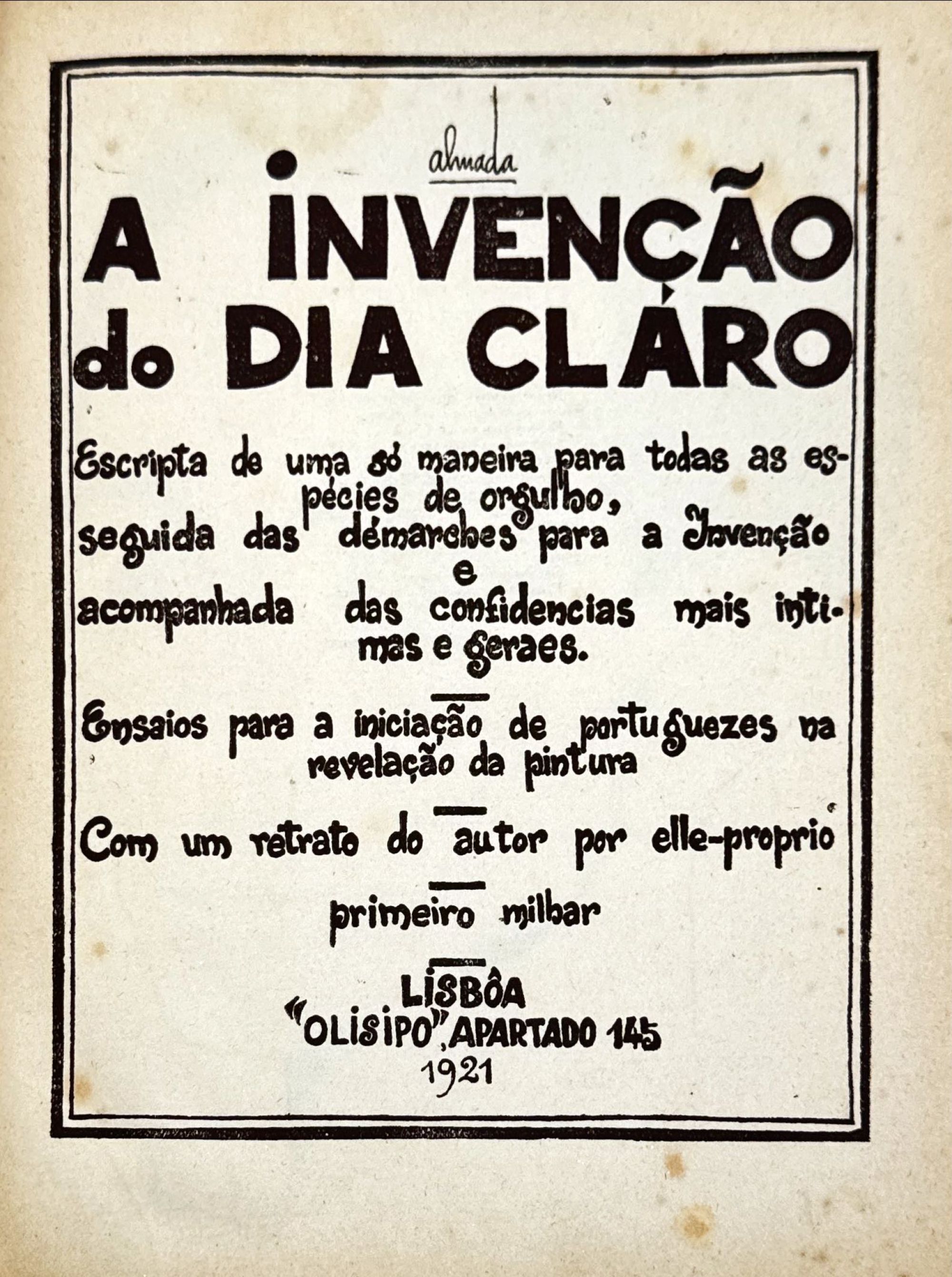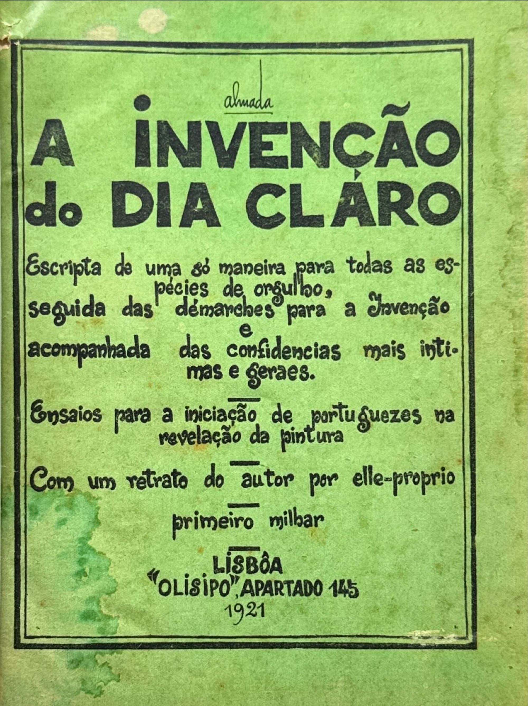 NEGREIROS, José de Almada. - A INVENÇÃO DO DIA CLARO. Escrita por uma só maneira para todas as espécies de orgulho, seguida das démarches para a Invenção e acompanhada das confidencias mais intimas e geraes. Ensaios para a iniciação de portuguezes na revelação da pintura. Com um retrato do autpor por elle-proprio. Primeiro milhar. Lisboa. Olisipo. 1921. In-4º de 45, [3] págs. Enc.