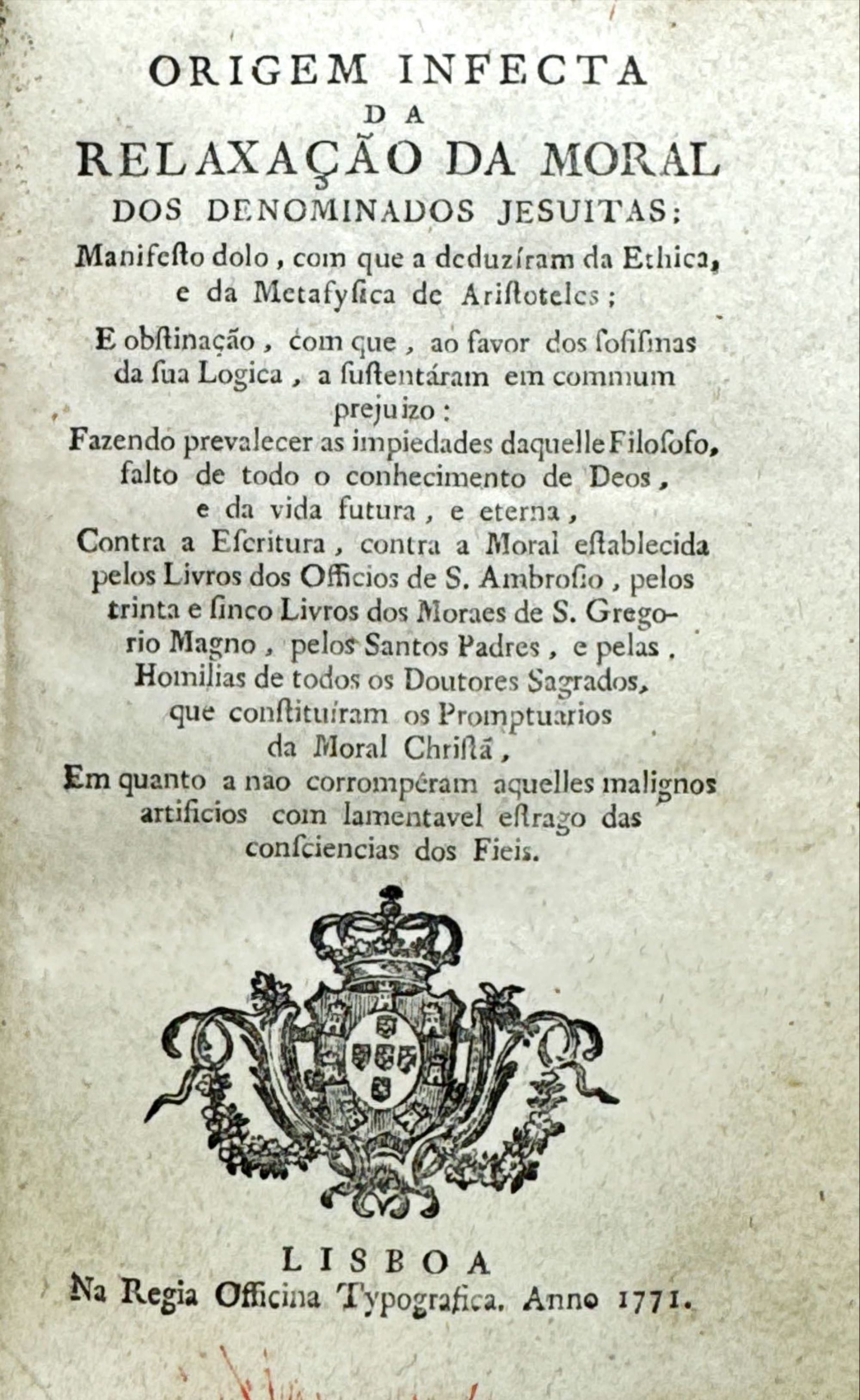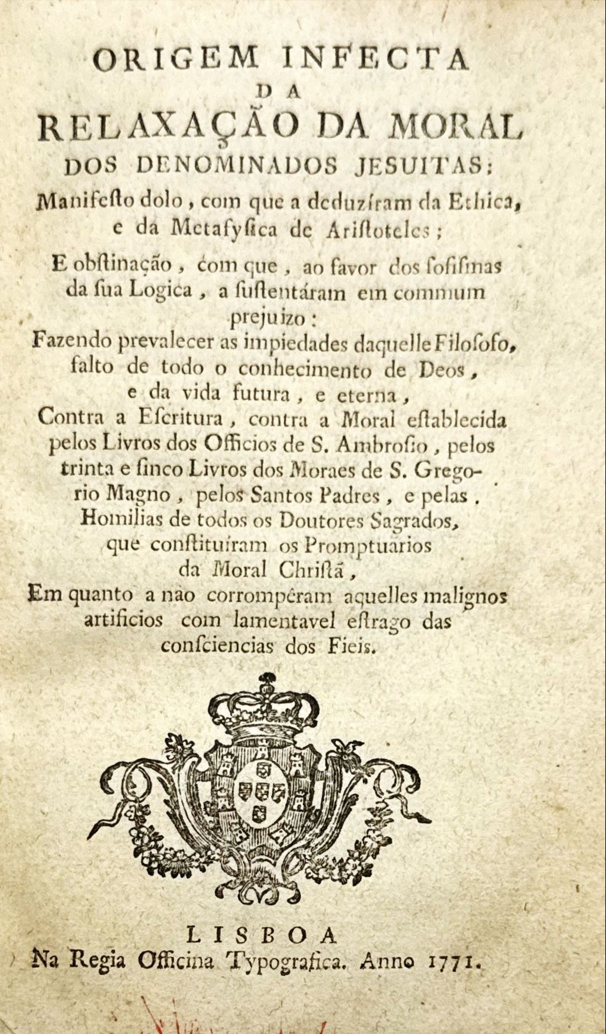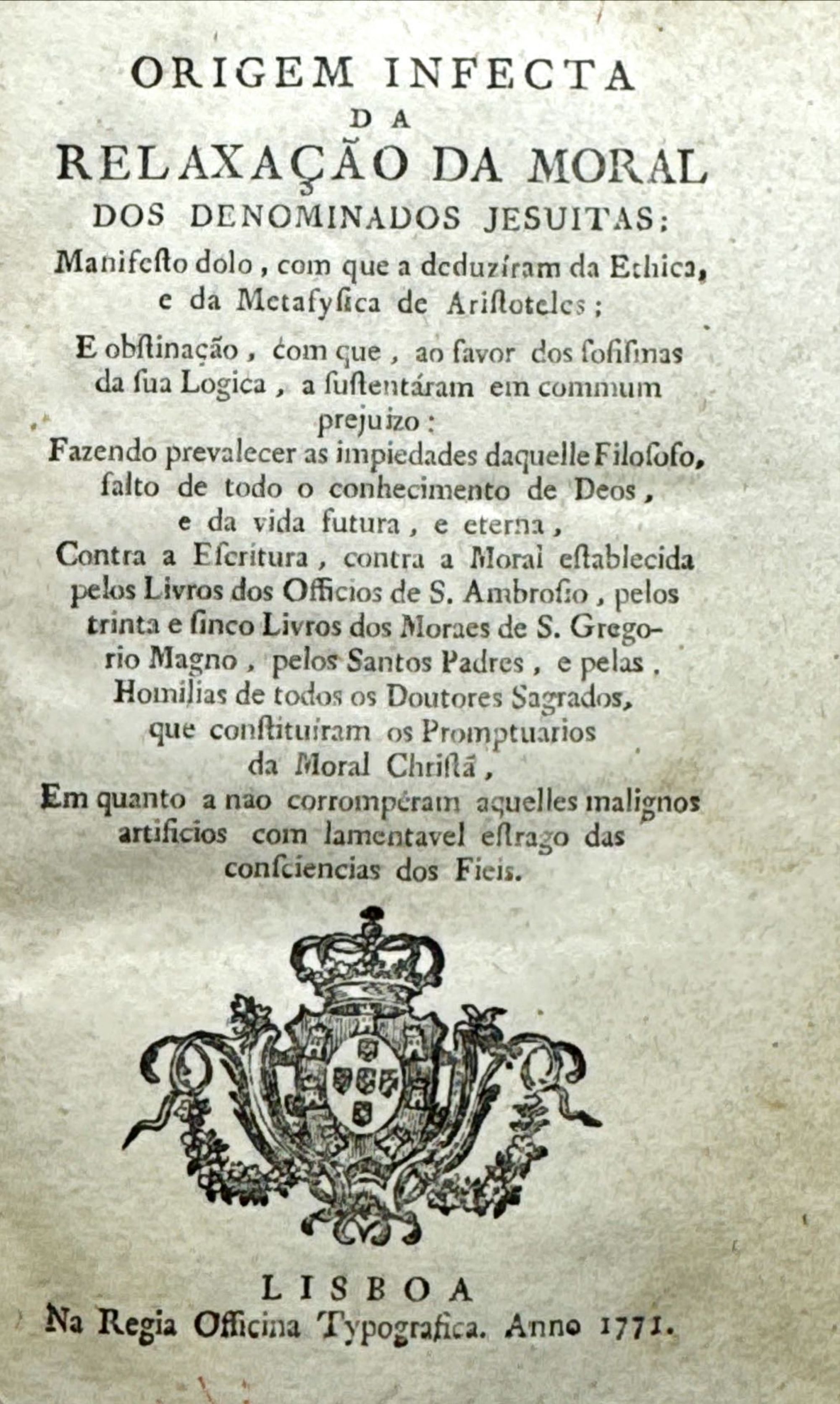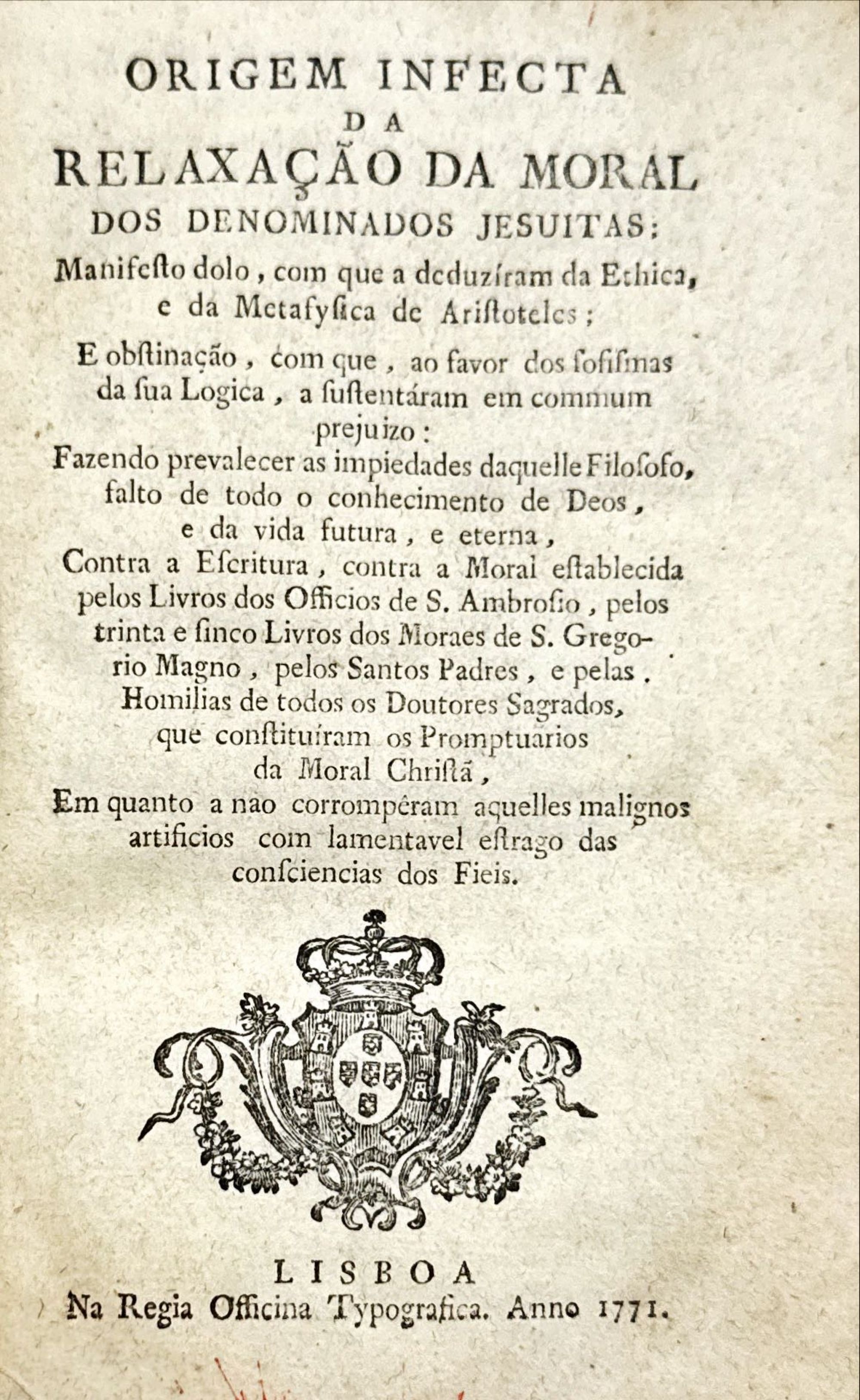 ORIGEM INFECTA DA RELAXAÇÃO DA MORAL DOS DENOMINADOS JESUITAS: Manifesto dolo, com que a deduziram da Ethica, e da Metafysica de Aristoteles. Lisboa. Na Regia Officina Typografica. 1771. In-8º de 446 págs. Enc.