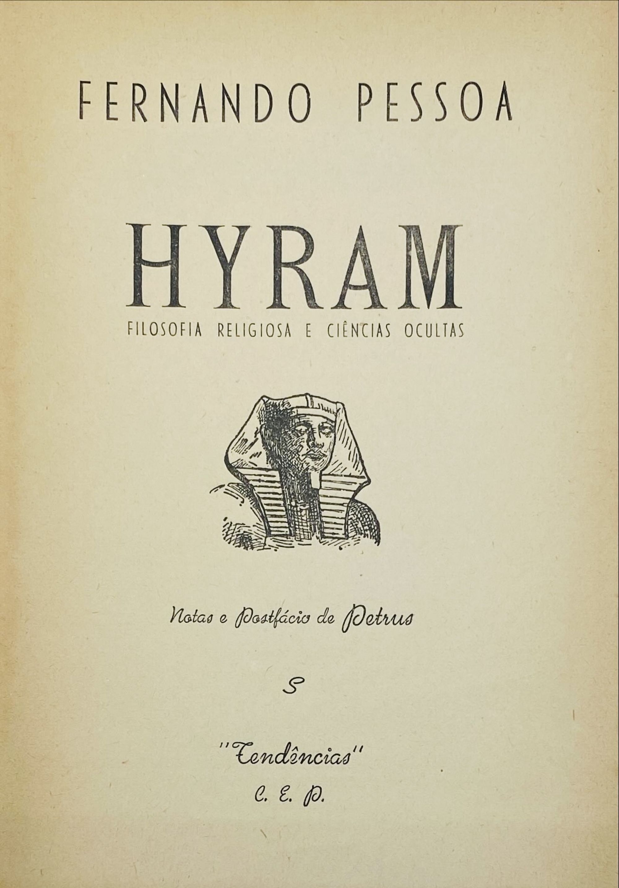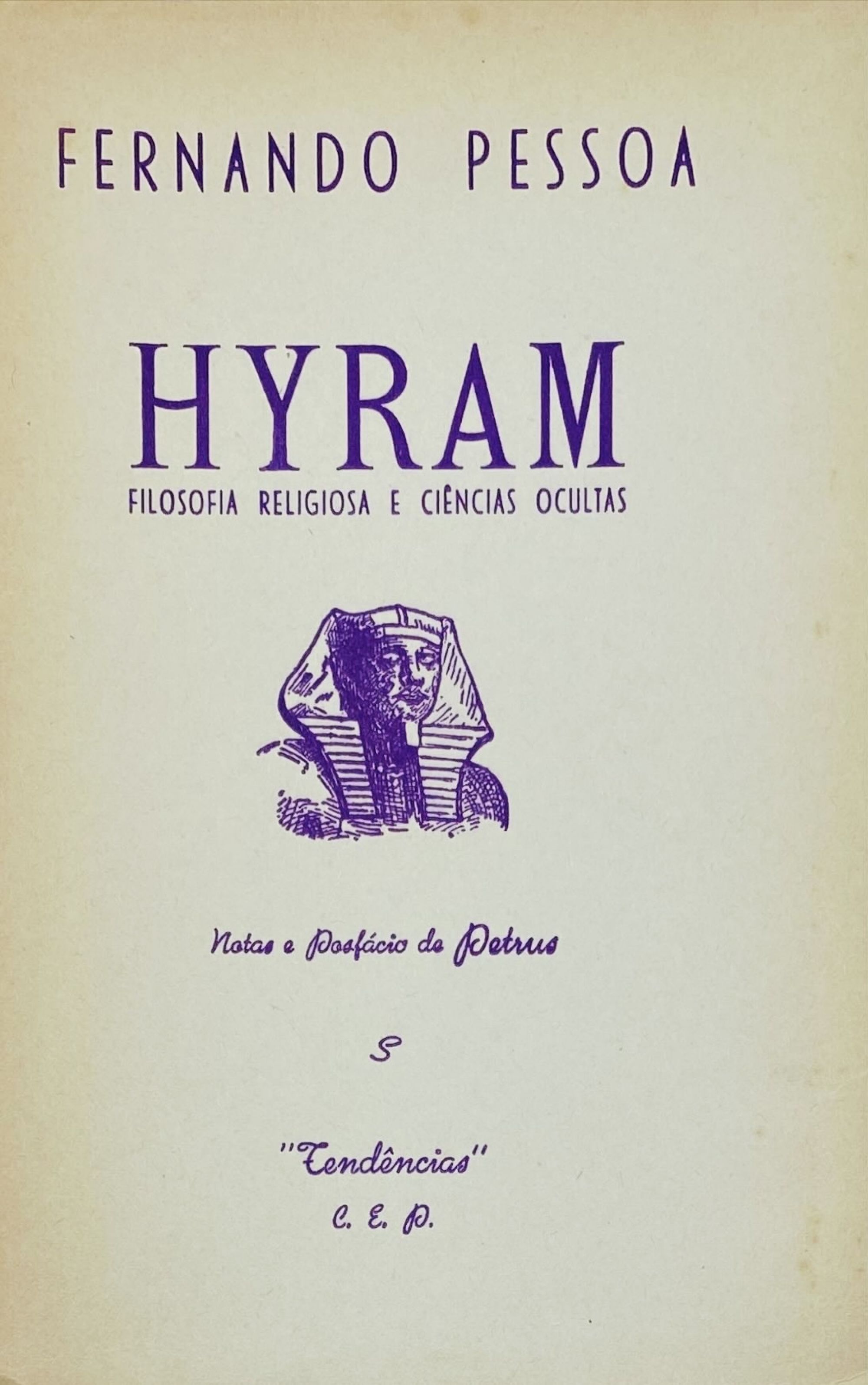 PESSOA, Fernando. - HYRAM. Filosofia Religiosa e Ciências Ocultas. Notas e Posfácio de Petrus. Porto. C.E.P. S. data. In-8º de 231 págs. Br.