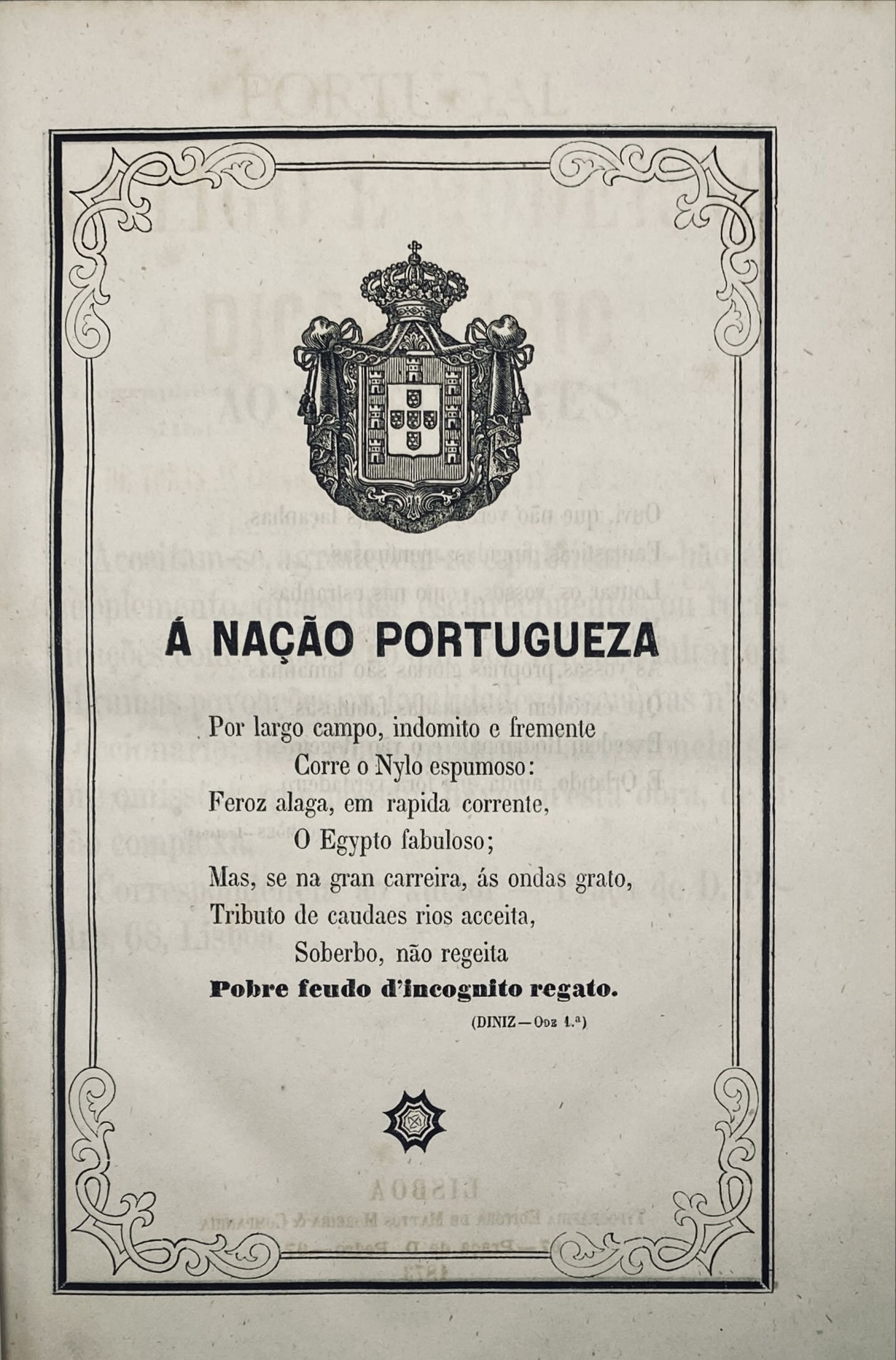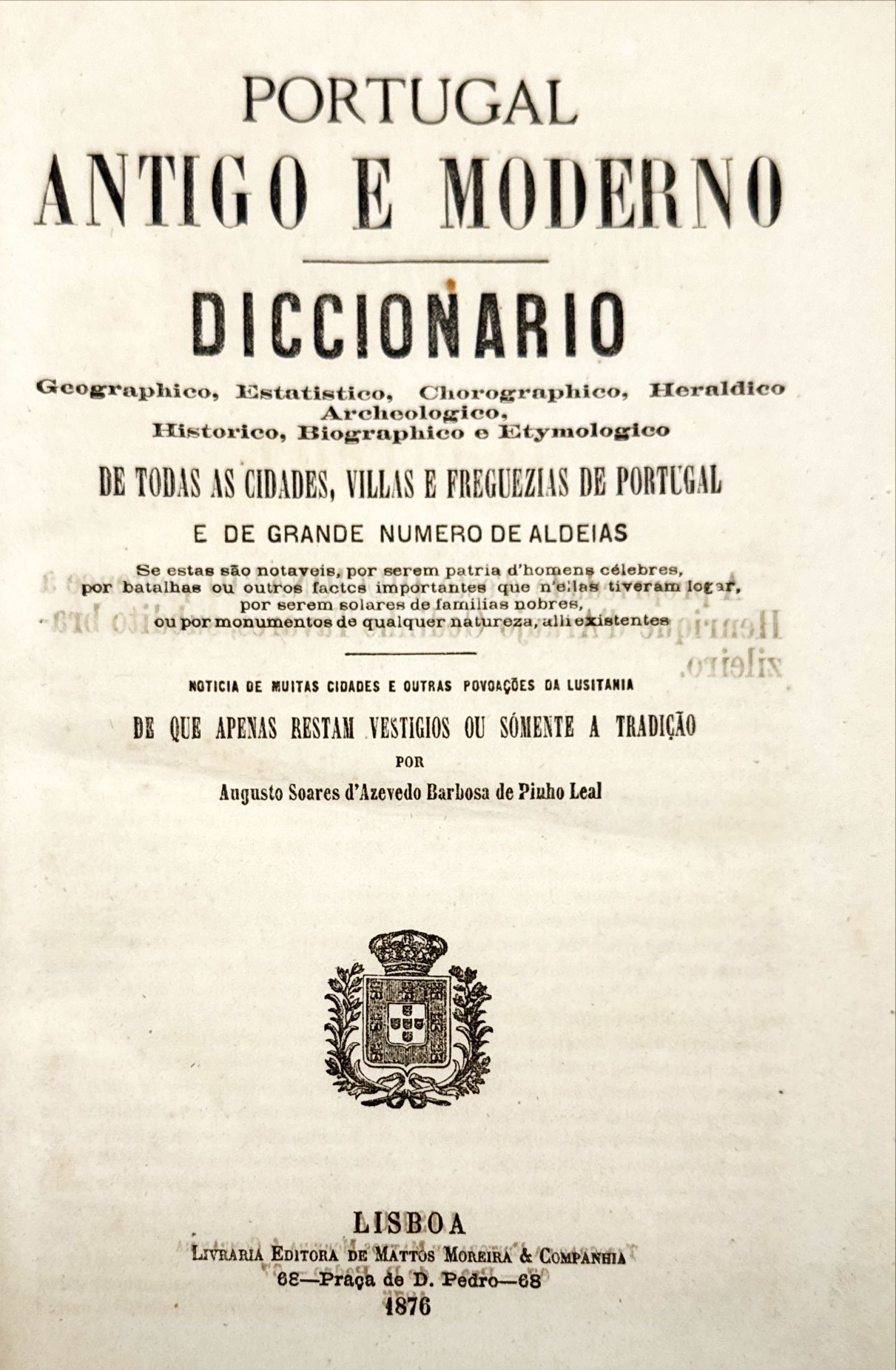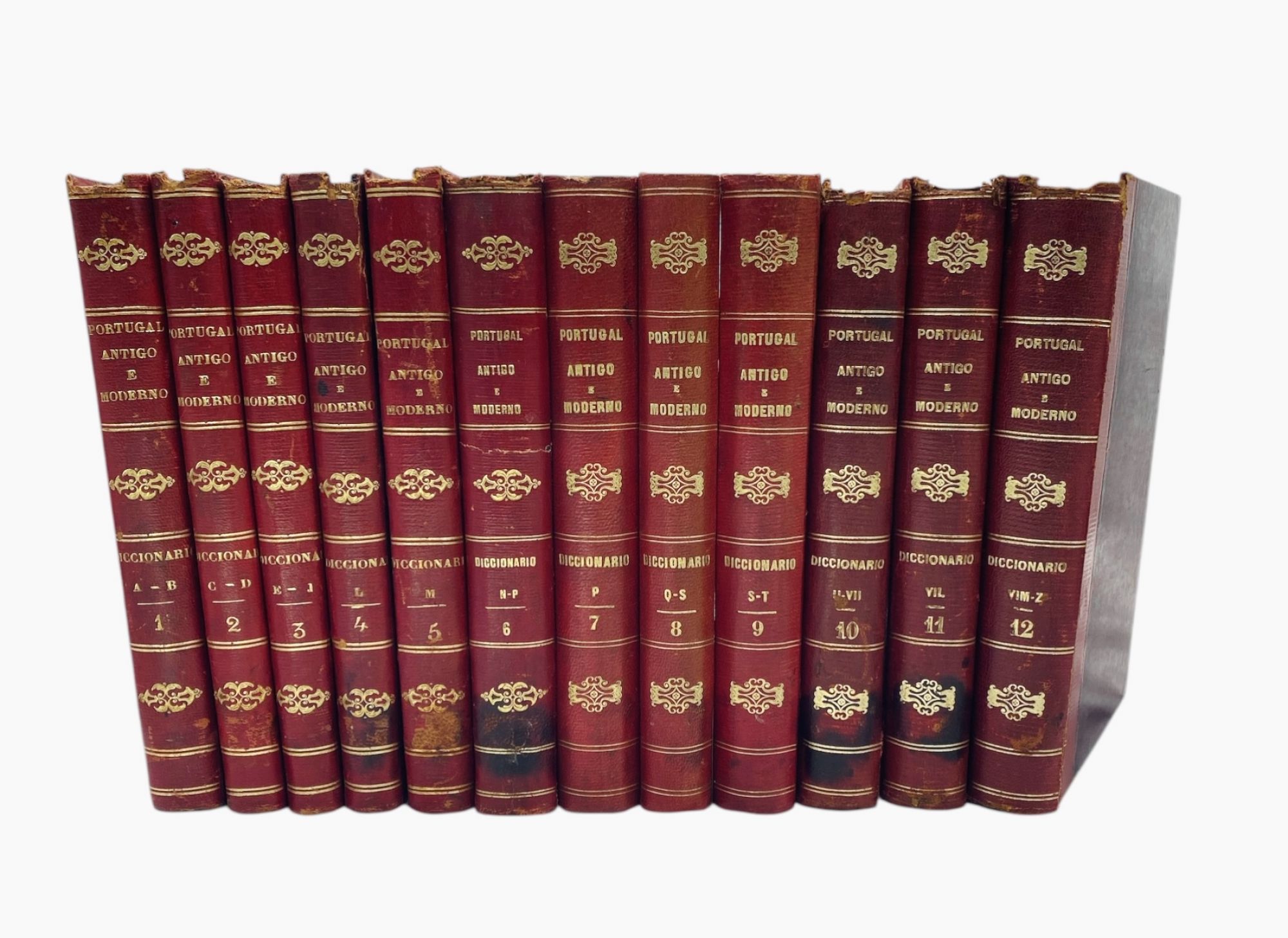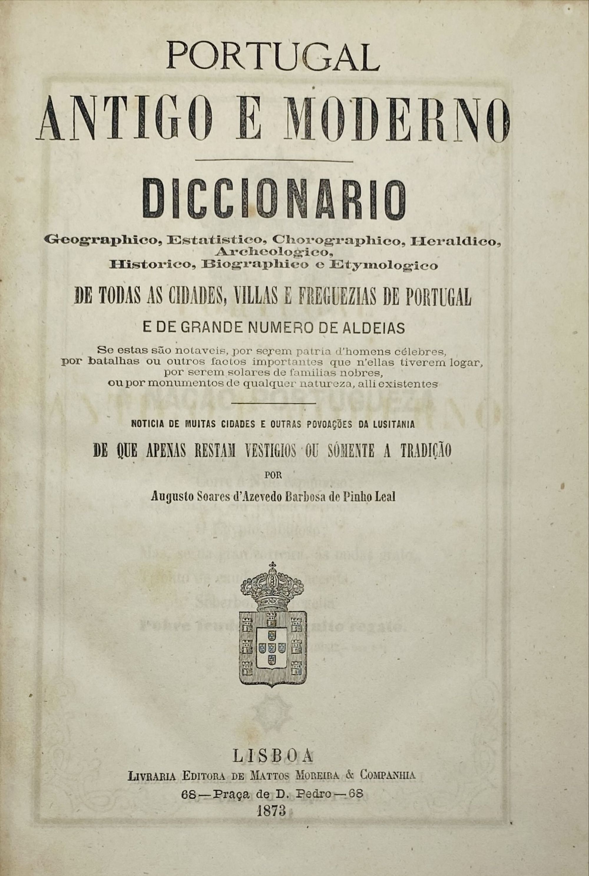PINHO LEAL, Augusto Soares de Azevedo Barbosa de. - PORTUGAL ANTIGO E MODERNO. Diccionario Geographico, Estatistico, Chorografico, Heraldico, Archeologico, Historico, Biographico e Etymologico de todas as cidades, villas e freguezias de Portugal e de grande número de aldeias se estas são notáveis, por serem pátria d'homens celebres, por batalhas ou noutros factos importantes que nellas tiveram logar, por serem solares de famílias nobres, ou por monumentos de qualquer natureza, alli existentes. Noticia de muitas cidades e outras povoações da Lusitânia de que apenas restam vestígios ou somente a tradição. Lisboa. Livraria de Mattos Moreira & Companhia. 1873-1890. 12 Vols. In-8º. Encs.