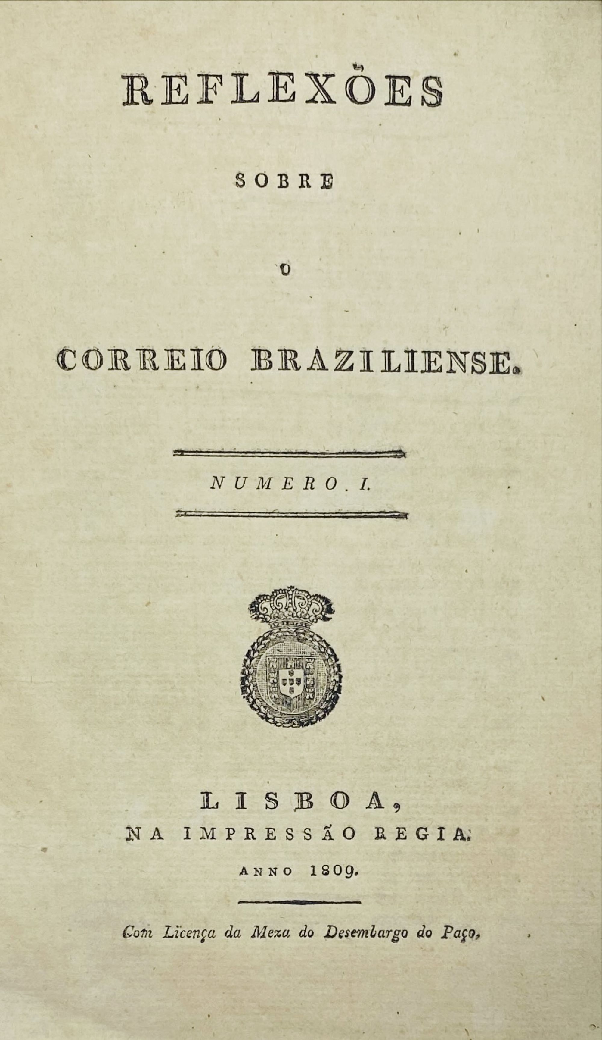 REFLEXÕES SOBRE O CORREIO BRAZILIENSE. Nº1 (ao 18). Lisboa. Na Impressão Regia. 1809. In-8º de 311, [1] págs. Br.