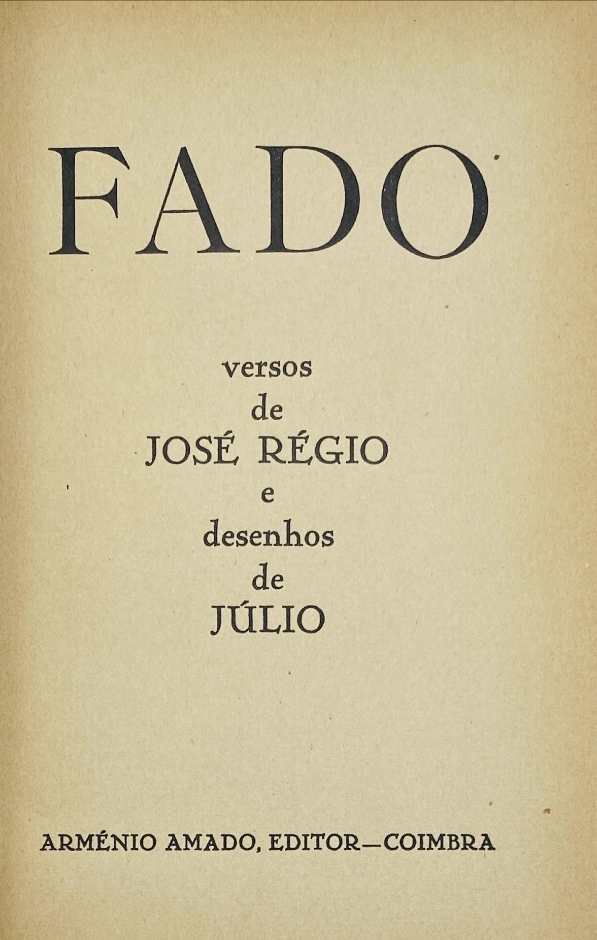 RÉGIO, José. - FADO. Versos de... e desenhos de Júlio. Coimbra. Arménio Amado, Editor. (1941). In-8º de 173, [2] págs. Enc.