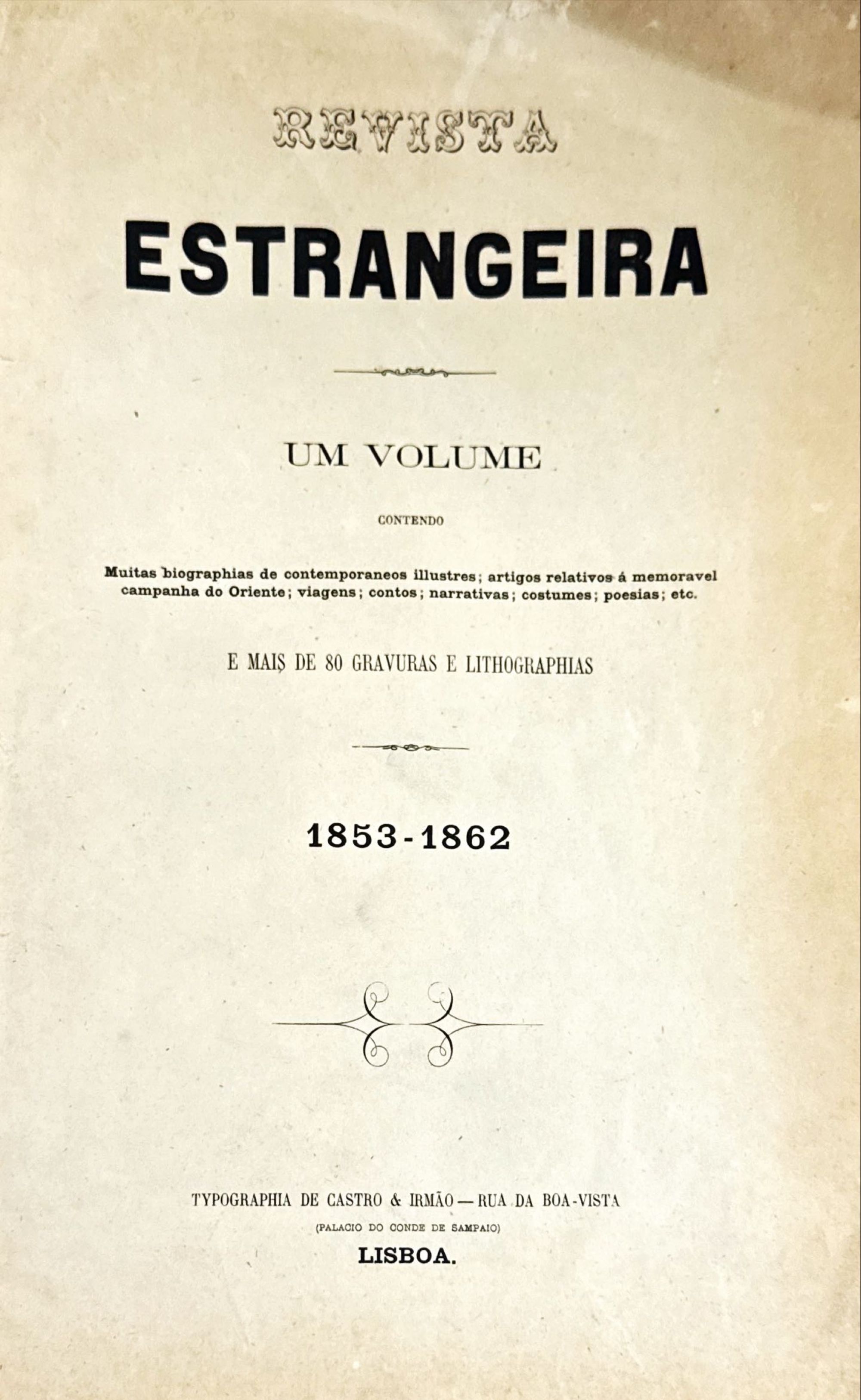 REVISTA ESTRANGEIRA. Um Volume contendo muitas biographias de contemporaneos illustres; artigos relativos á memorável campanha do Oriente; viagens; contos; narrativas; costumes; poesias; etc. E mais de 80 gravuras e lithographias. 1853-1862. Lisboa. Typographia de Castro & Irmão. 1853-1862. In-4º de 406 págs. Enc.