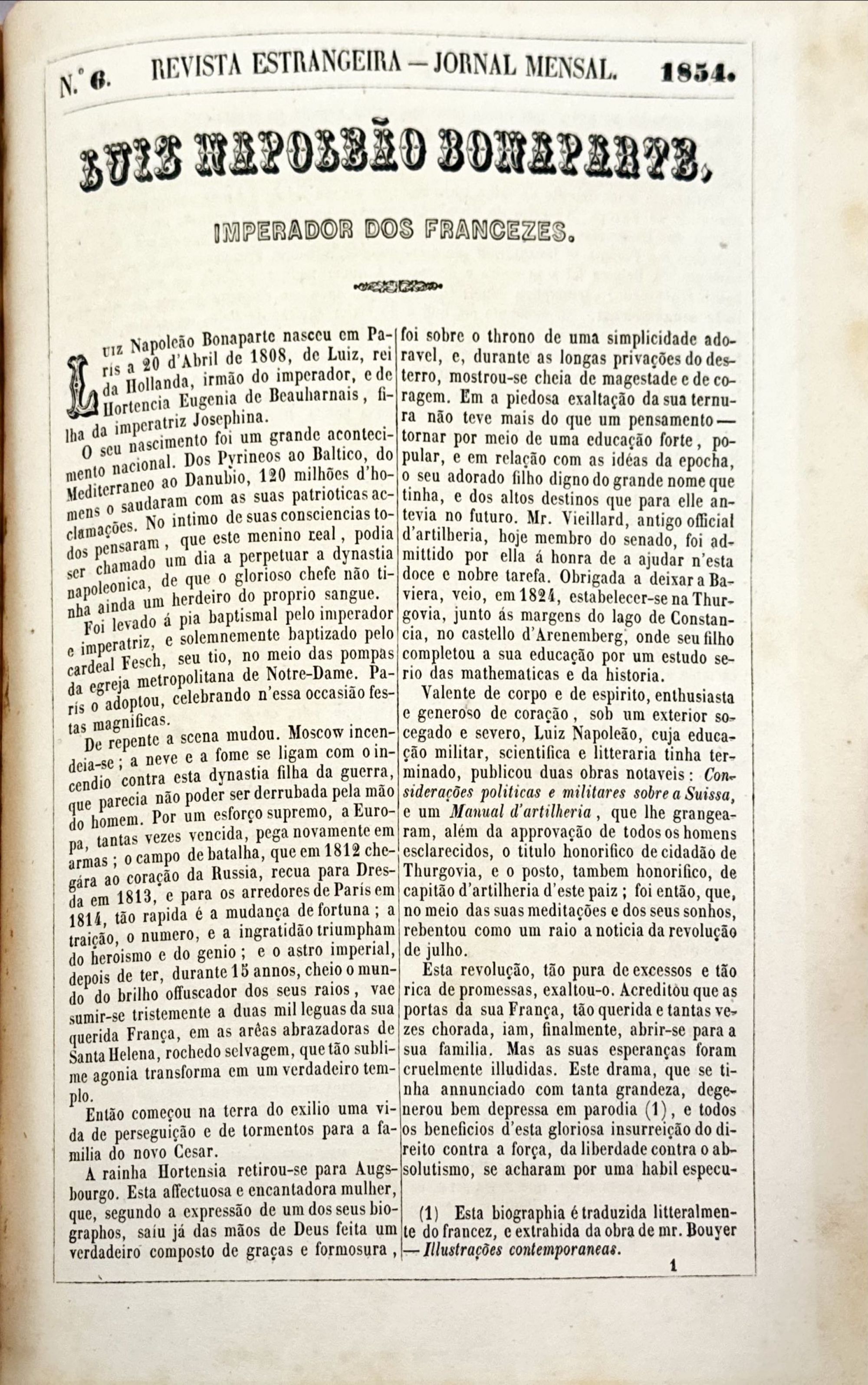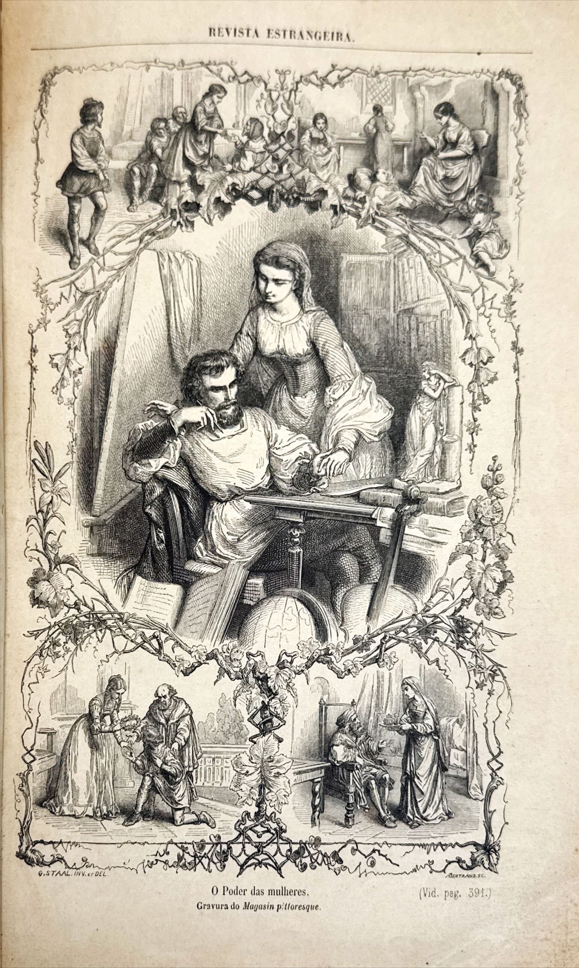 Coleção completa e rara, composta de 12 fascículos. Revista de grande interesse literário, apresentando nas suas páginas biografias de homens ilustres, contos, narrativas, costumes, poesia, viagens, teatro, etc. Reportagens da guerra do Oriente, viagem da Rainha Victória a França e a Exposição Universal de Paris. Ilustrada com gravuras, retratos, figurinos, etc. Gravuras com acidez. Encadernação meia de pele.