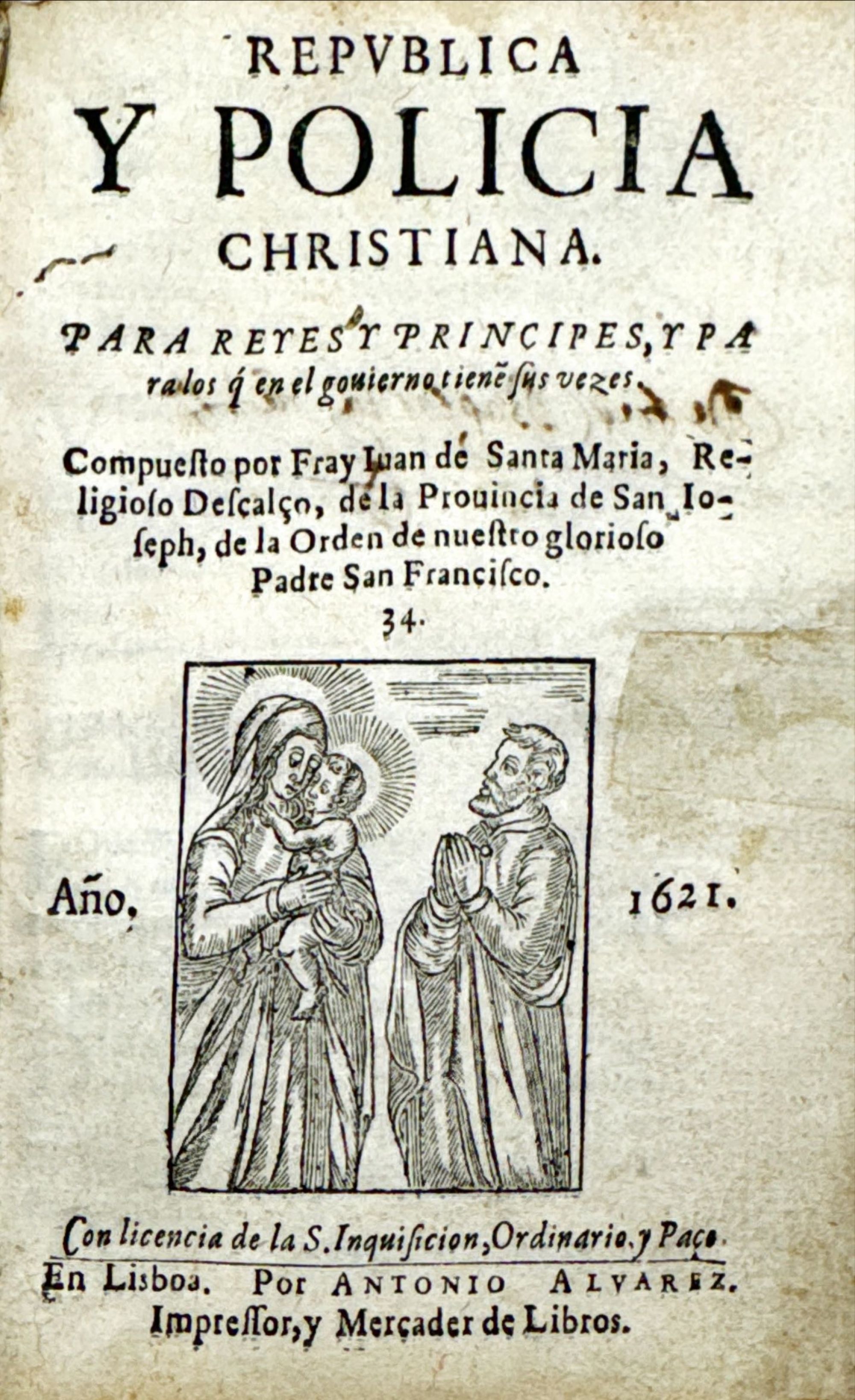 SANTA MARIA, João de. - REPVBLICA Y POLICIA CHRISTIANA. Para reyes y príncipes, y para los que en el govierno tienen sus vezes. Lisboa. Antonio Alvarez. 1621. In-8º de (8), 265, [1] fls. Enc.