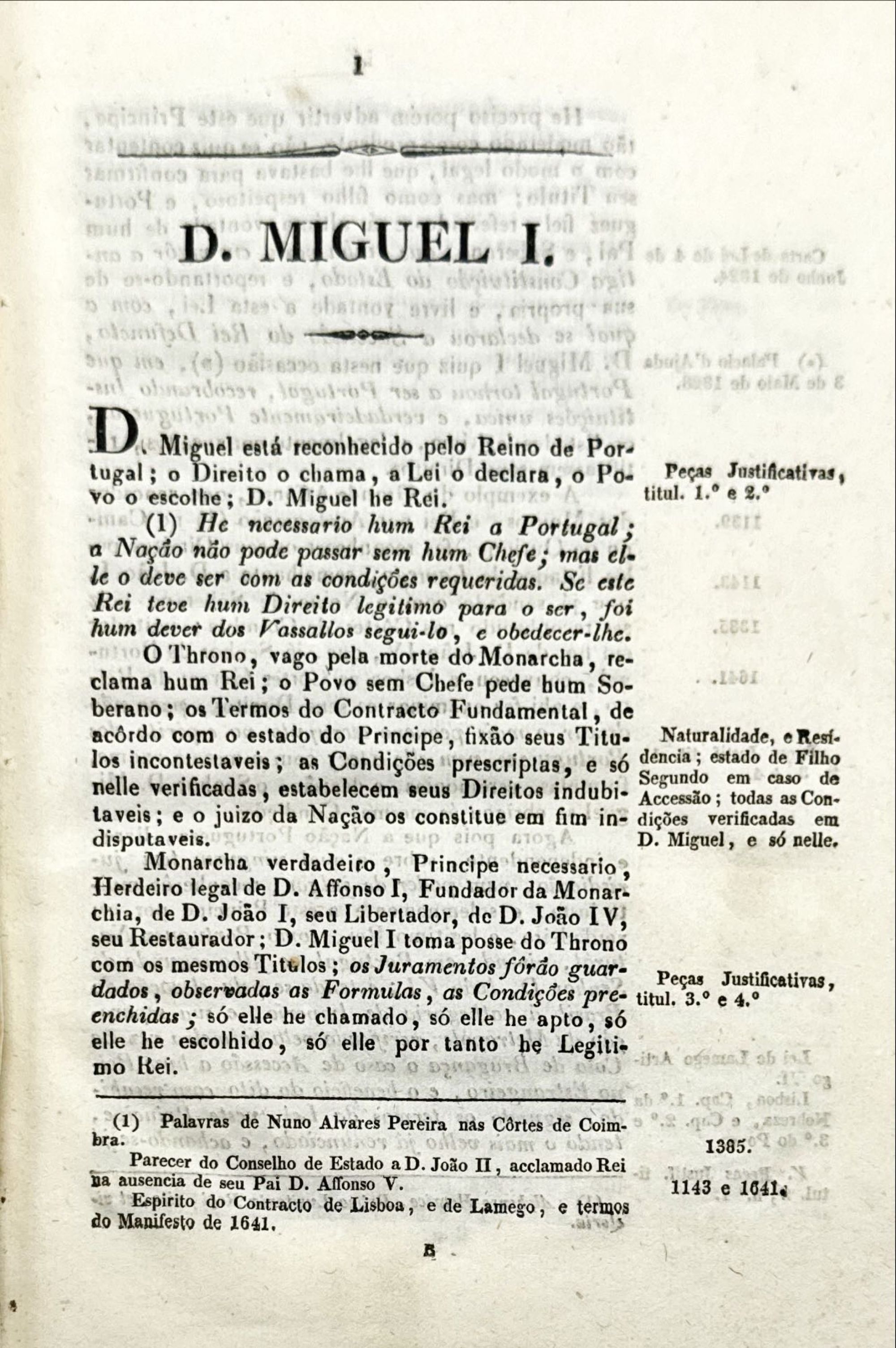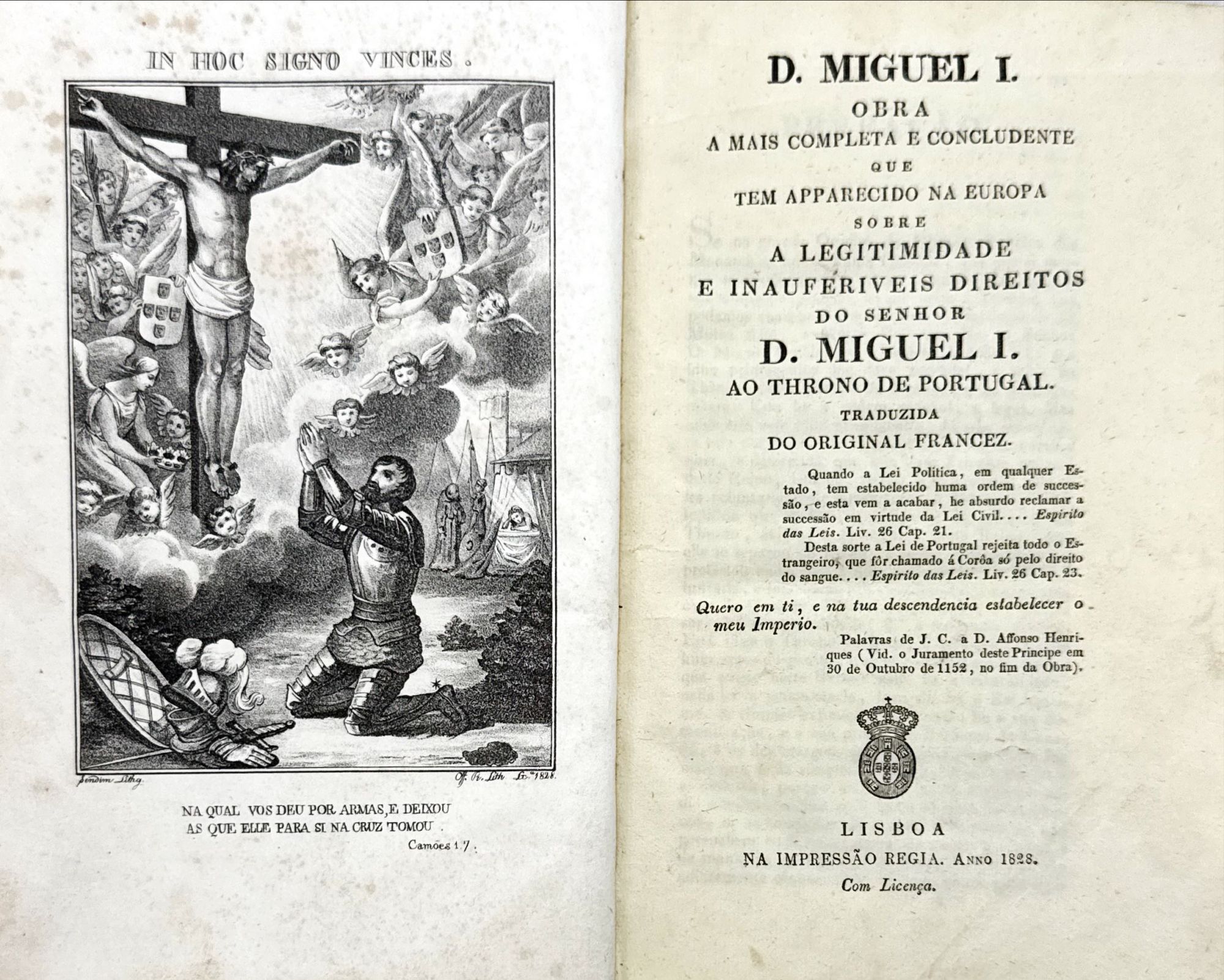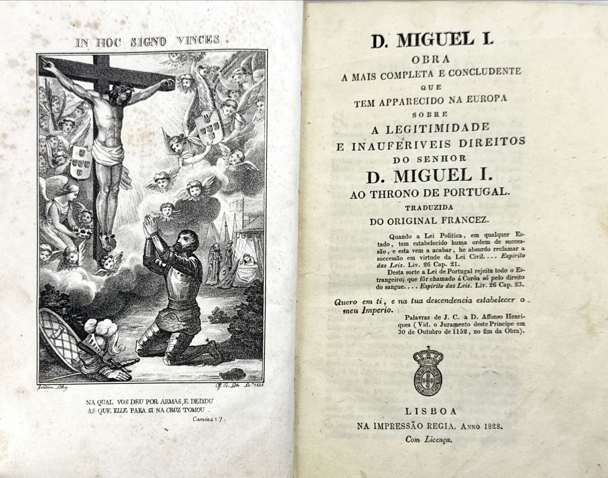 SARAIVA, António Ribeiro. - D. MIGUEL I. Obra a mais completa e concludente que tem apparecido na Europa sobre a legitimidade e inauferiveis direitos do Senhor D. Miguel I. Traduzido do original francez. Lisboa. Na Impressão Regia. Anno de VIII, 1829. In-8º de 140 págs. Enc.