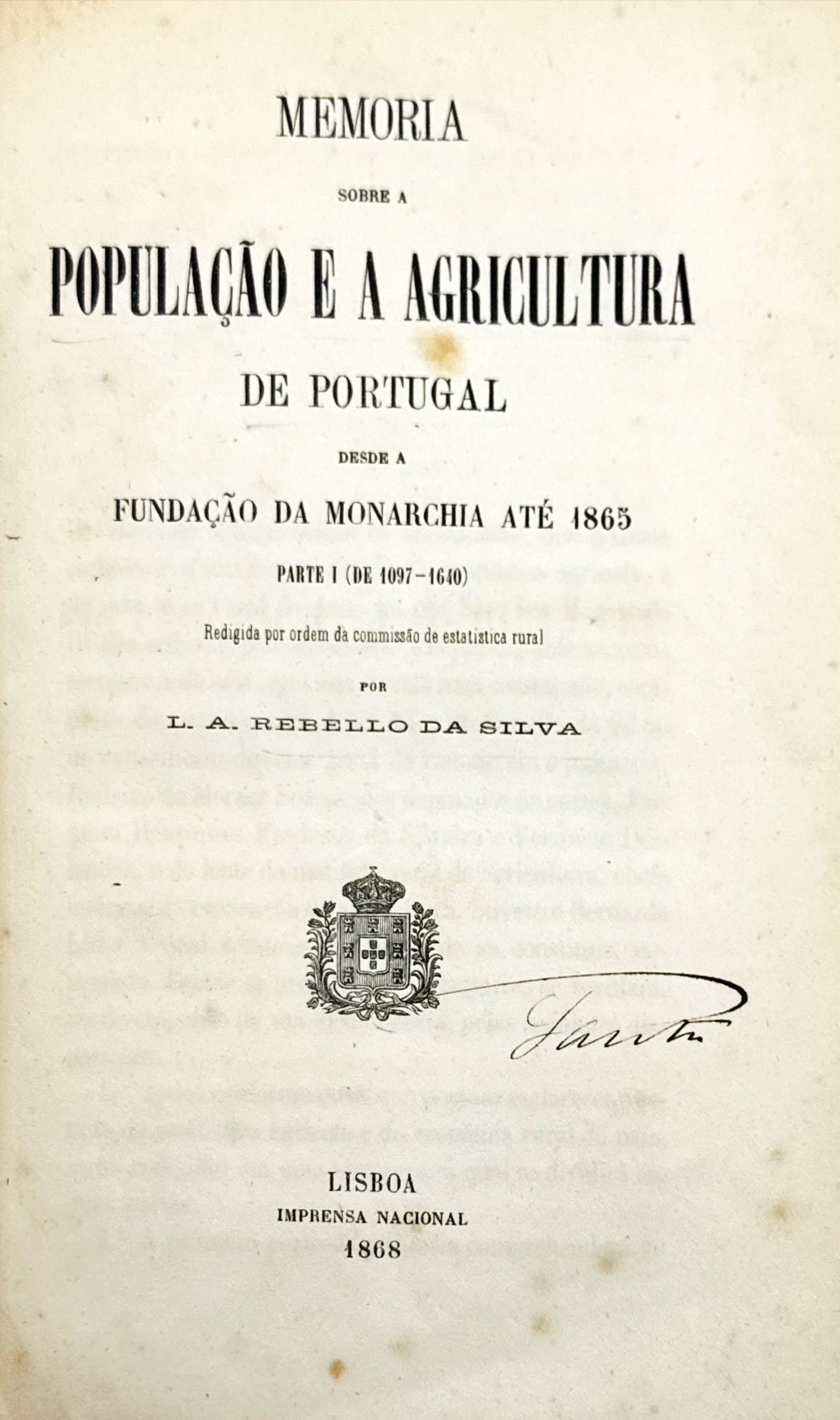 SILVA, Luis Augusto Rebello da. - MEMORIA SOBRE A POPULAÇÃO E A AGRICULTURA DE PORTUGAL. Desde a fundação da Monarchia até 1865. Redigida por ordem da Commissão de estatística rural. Lisboa. Imprensa Nacional. 1868. In-8º de XL, 333 págs. Enc.