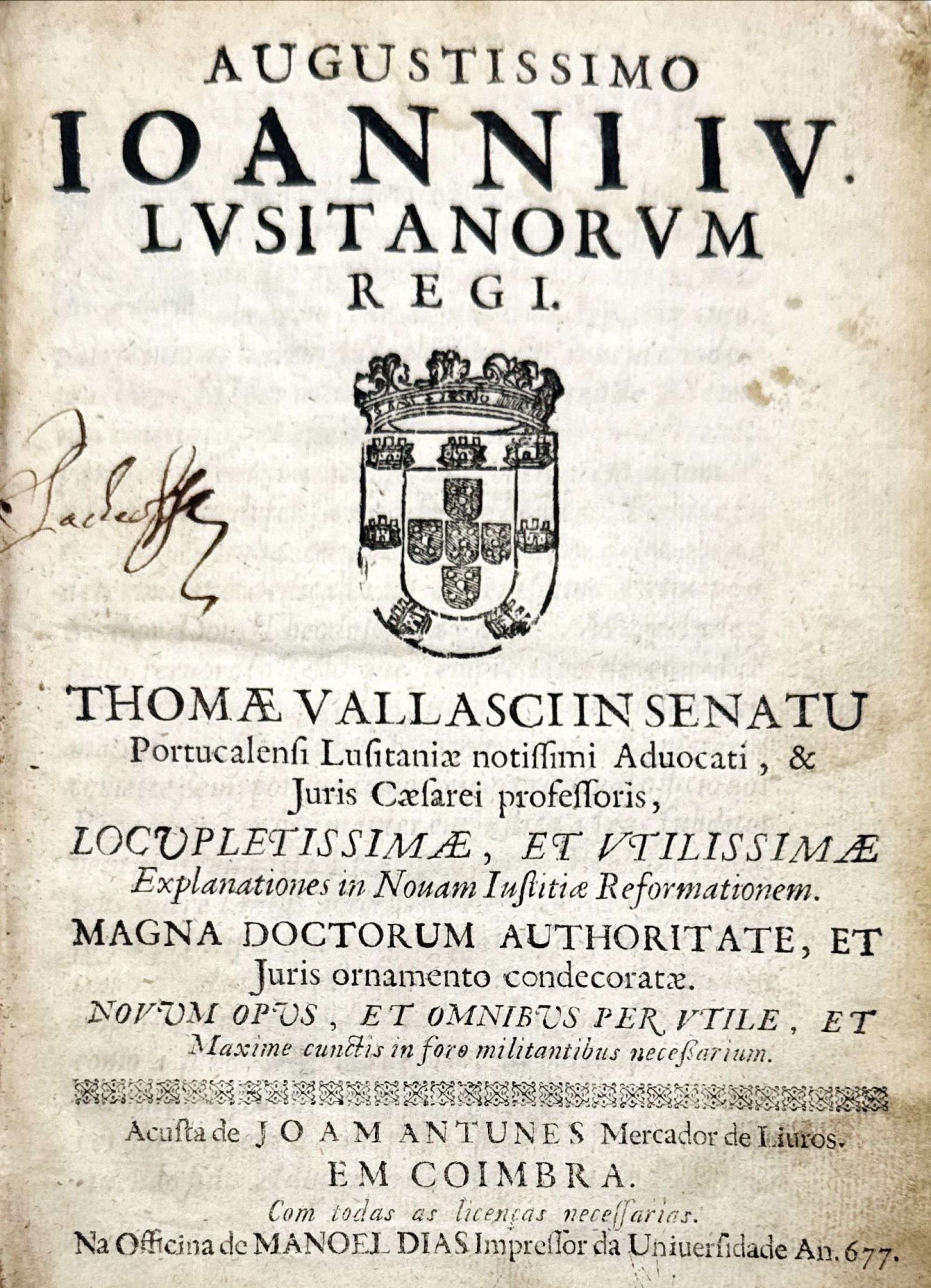 VALASCO, Tomé. - AUGUSTISSIMO IOANNI IV LVSITANORVM REGI THOMAE VALLASCI IN SENATV Portucalensi Lusitaniae notissimi aduocati, & Juris Caesarei prosessoris locupletissima, et vtilissimae explanationes in Nouam Iustitiae Reformationem.