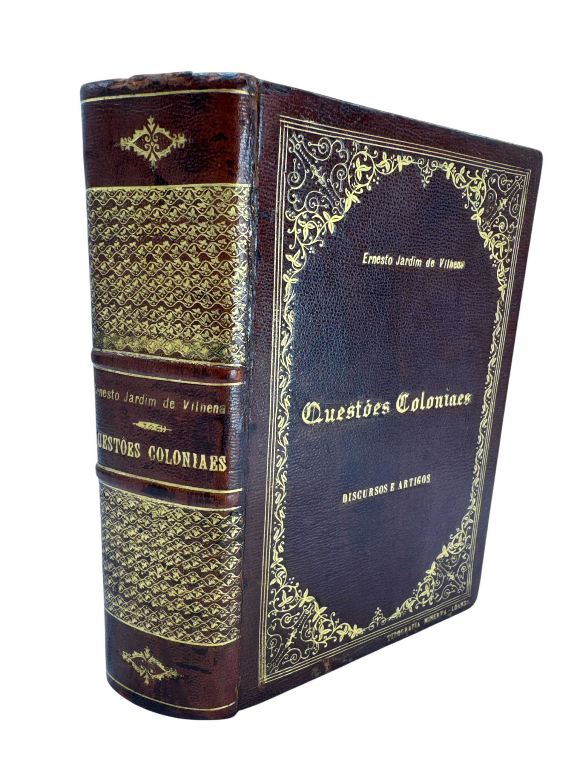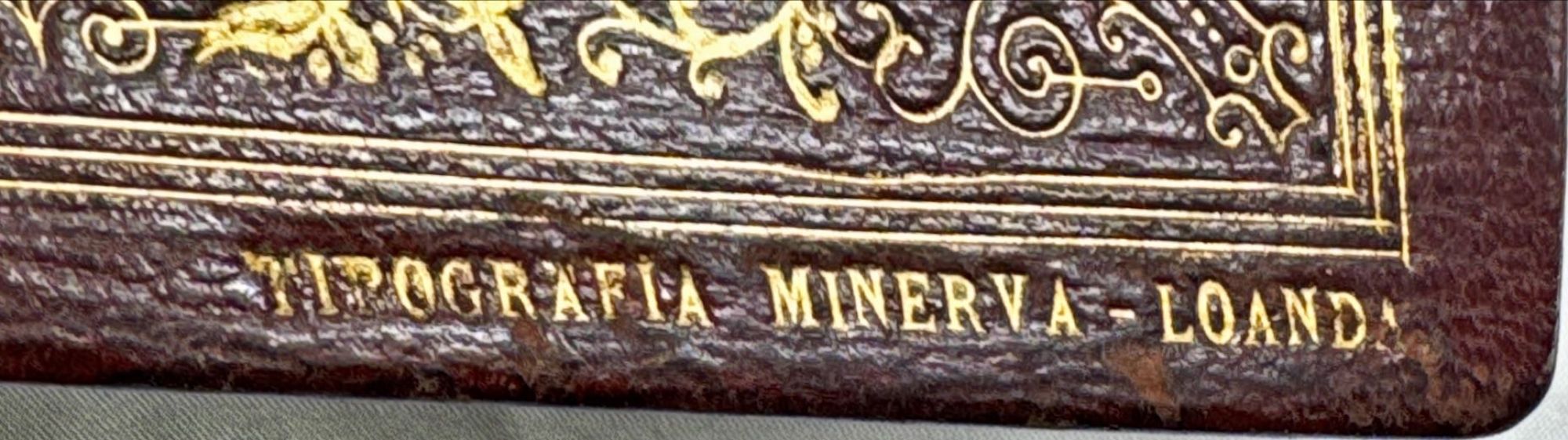 Pouco vulgar. Encadernação artística inteira de pele, com ferros a ouro nas pastas, lombada e seixas. Assinada pela "Tipografia Minerva – Loanda”.