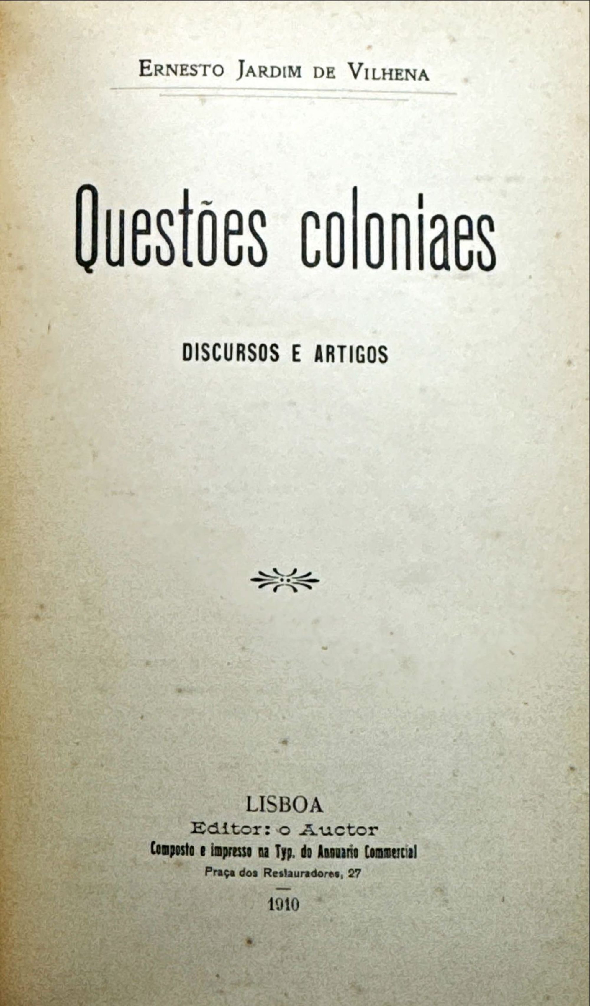 VILHENA, Ernesto Jardim de. - QUESTÕES COLONIAES. Discursos e Artigos. Lisboa. Typ. do Annuario commercial. 1910. In-8º de 580, [1] págs. Enc.
