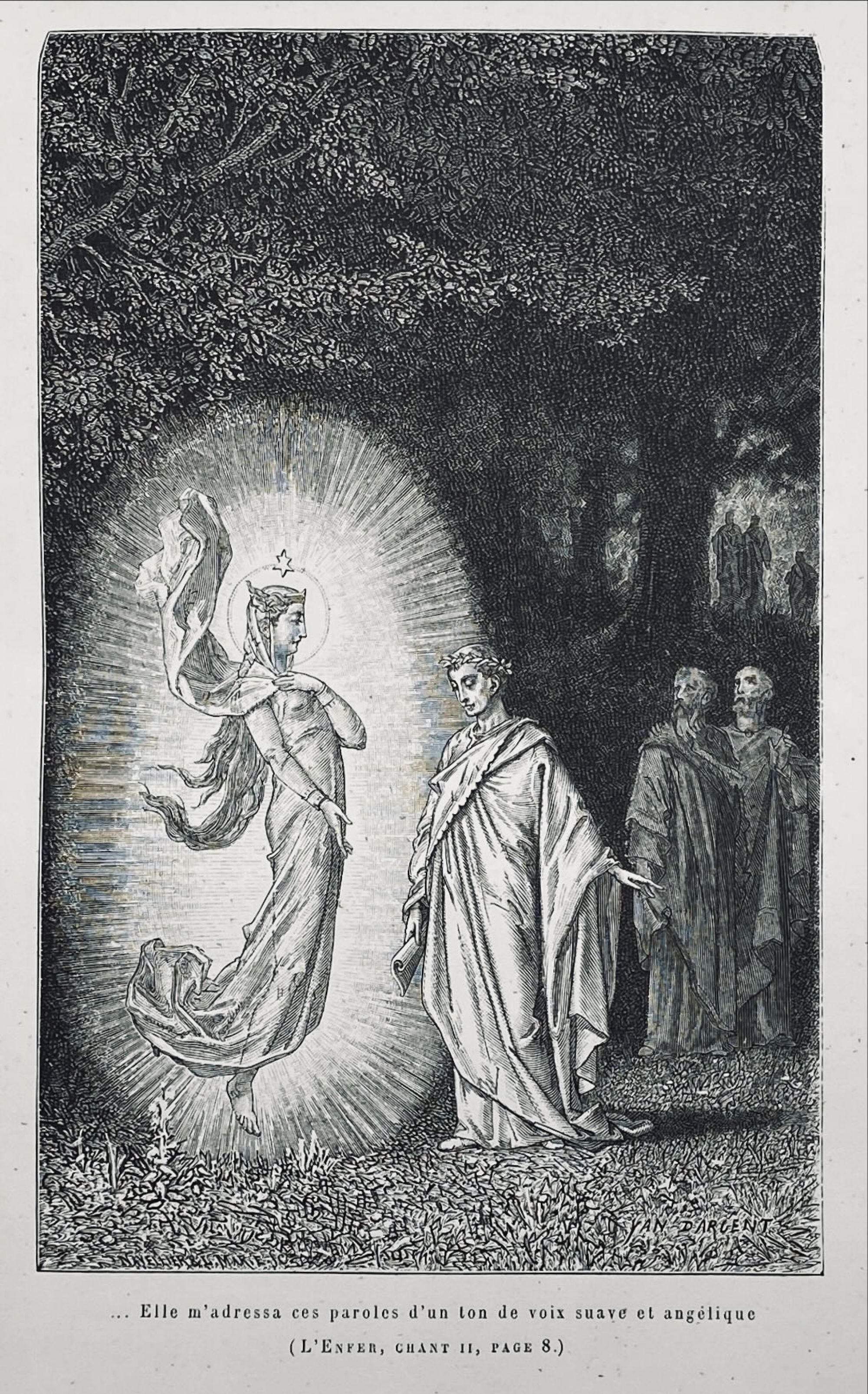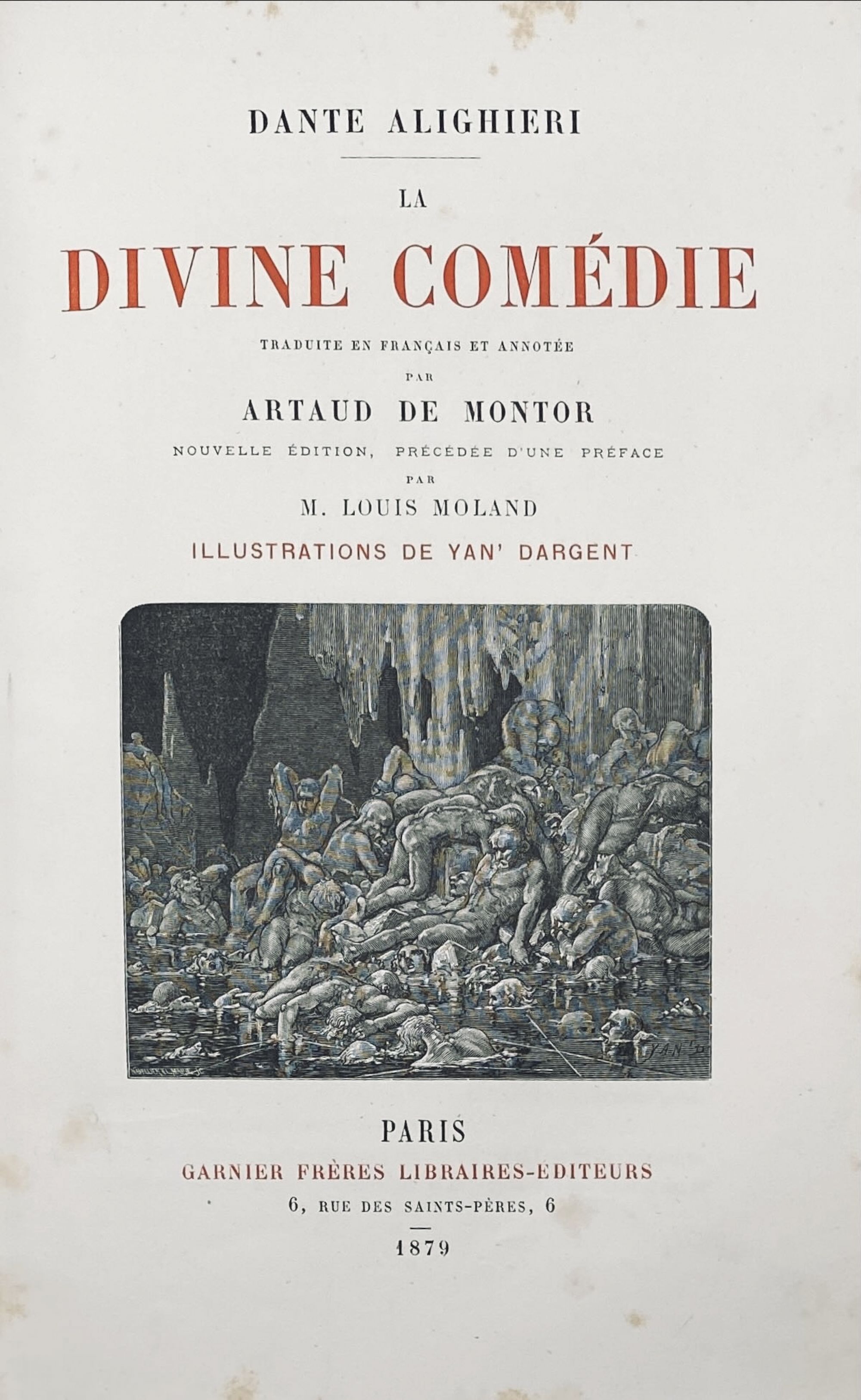 Traduzida para francês e anotada por Artaud de Montor. Prefácio de Louis Moland. Ilustrado pelo pintor francês Jean-Édouard Dargent mais conhecido por Yan' Dargent, com belíssimas gravuras no texto e com 37 em extratexto impressas sobre papel mais encorpado. Junto à folha de rosto um retrato do autor. As gravuras estão legendadas e com indicações das páginas a que dizem respeito. O início e o fim de cada canto estão decorados com motivos vegetalistas e gravuras alegóricas. Exemplar com alguns picos de acidez. Encadernação da época em pele.