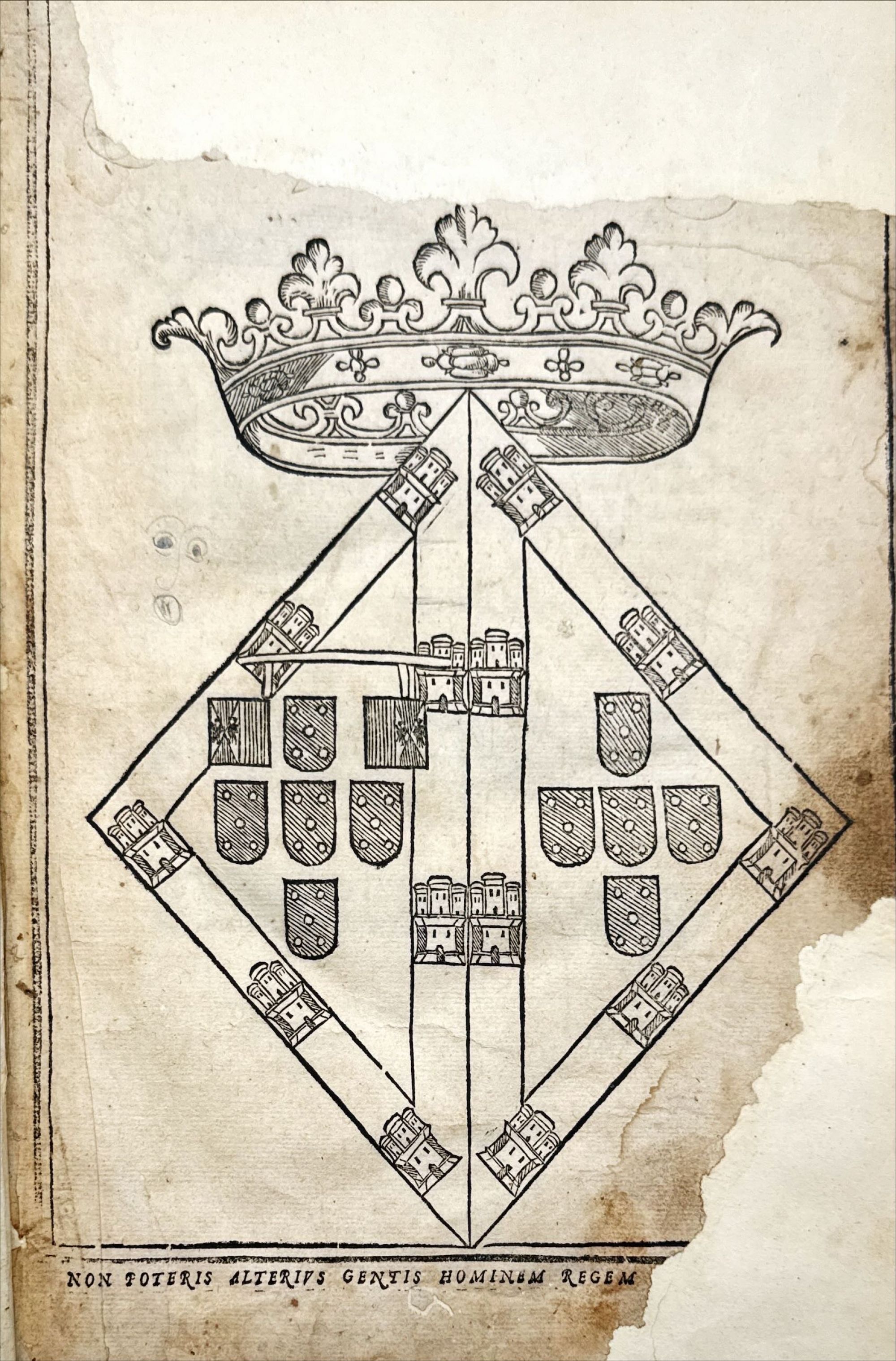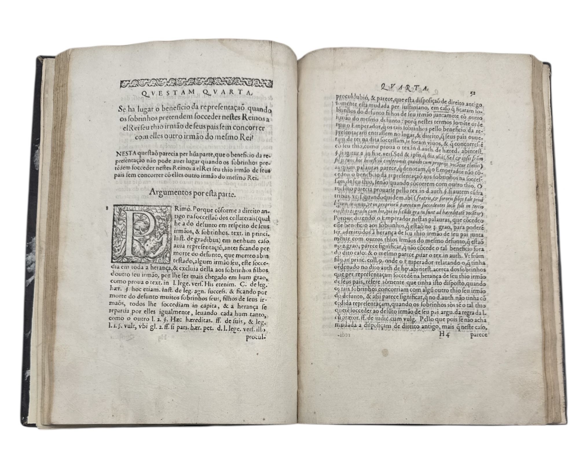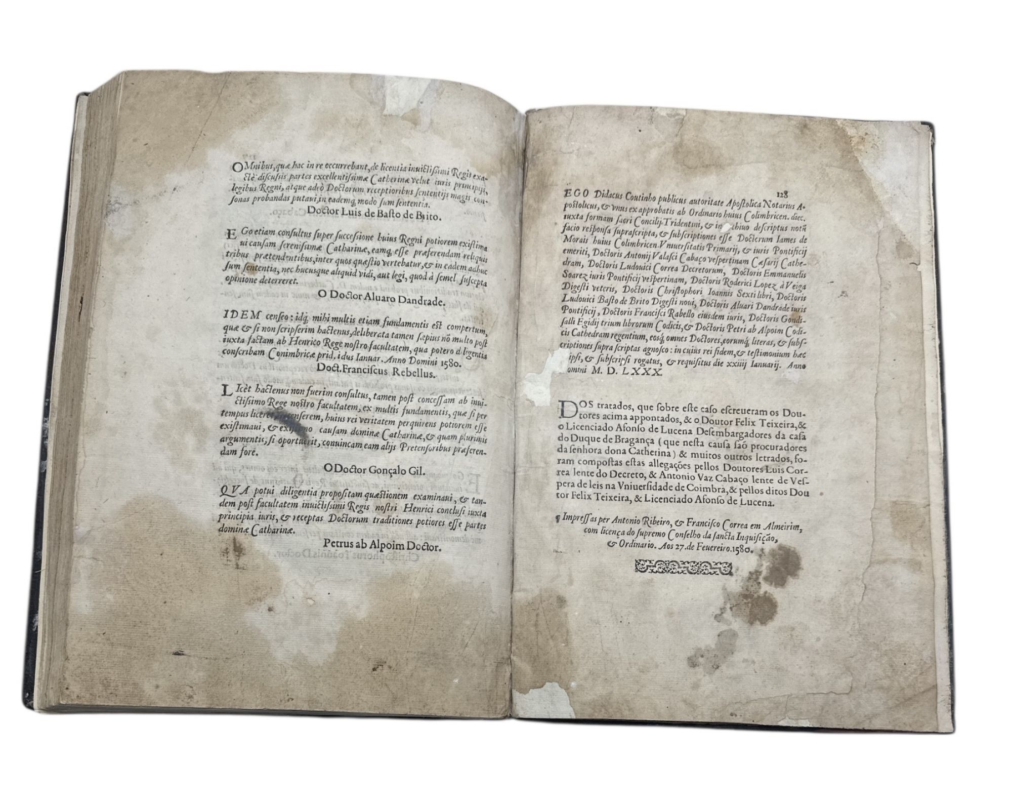 Exemplar imperfeito da raríssima edição quinhentista das alegações impressa em Almeirim. Faltam as folhas 44 e 45 (G4 e G5). Cerca de metade das folhas apresentam restauros marginais que, no caso das duas gravuras e do frontispício, afetam a mancha tipográfica. Algumas manchas nas folhas finais e última folha reforçada. É, contudo, espécie importante da bibliografia quinhentista portuguesa, nomeadamente por ter sido impressa em Almeirim e também por que a maioria dos exemplares que se conhecem, estão imperfeitos. Ostenta o ex-libris de António Cupertino de Miranda. Encadernação em carneira com alguns defeitos e restauros.