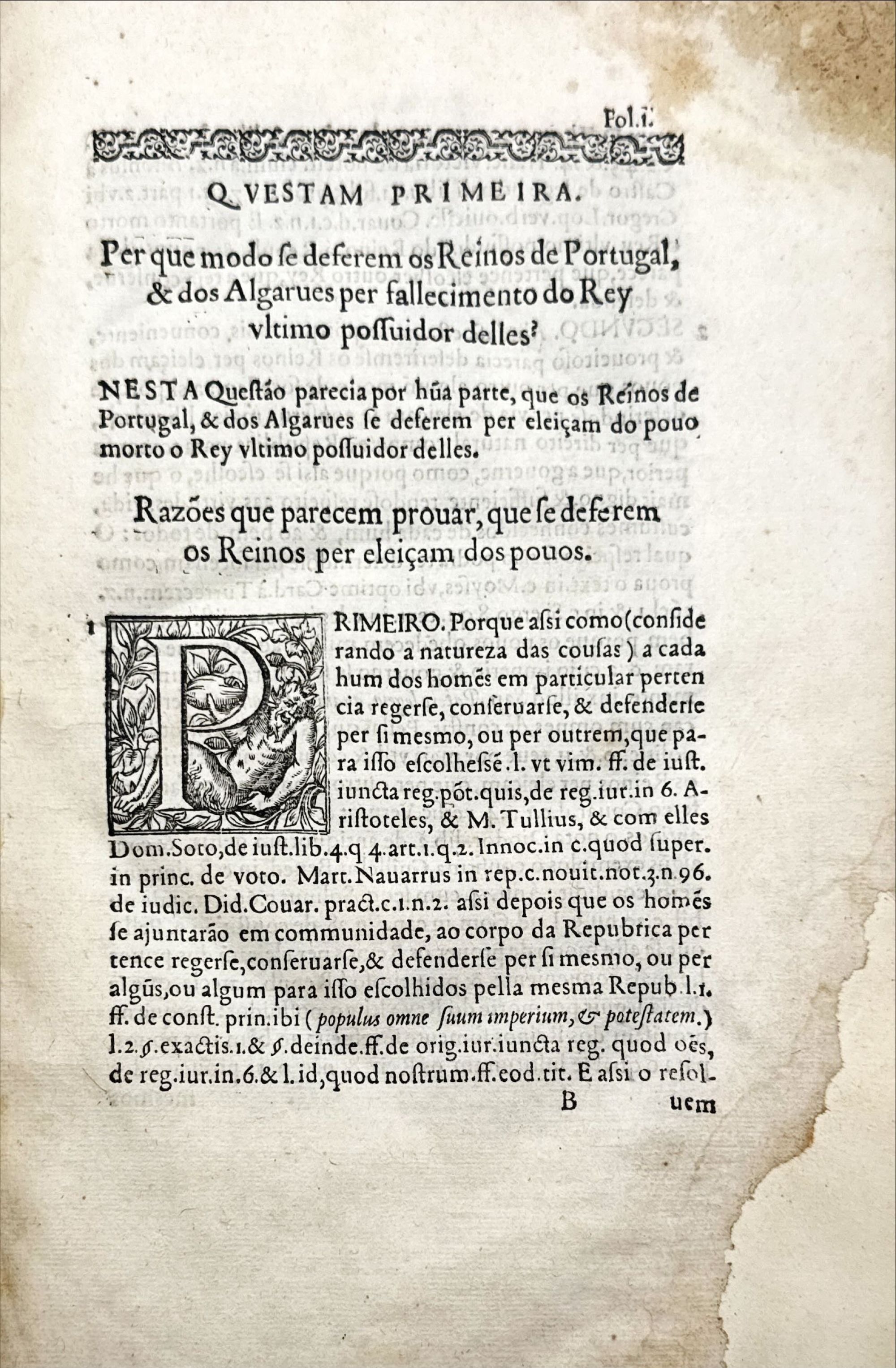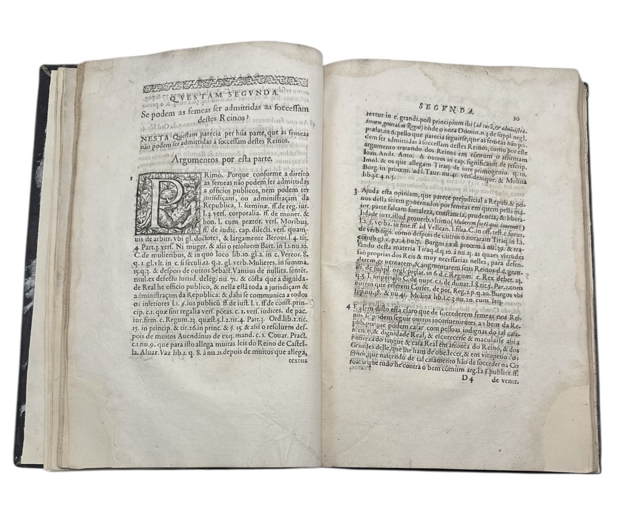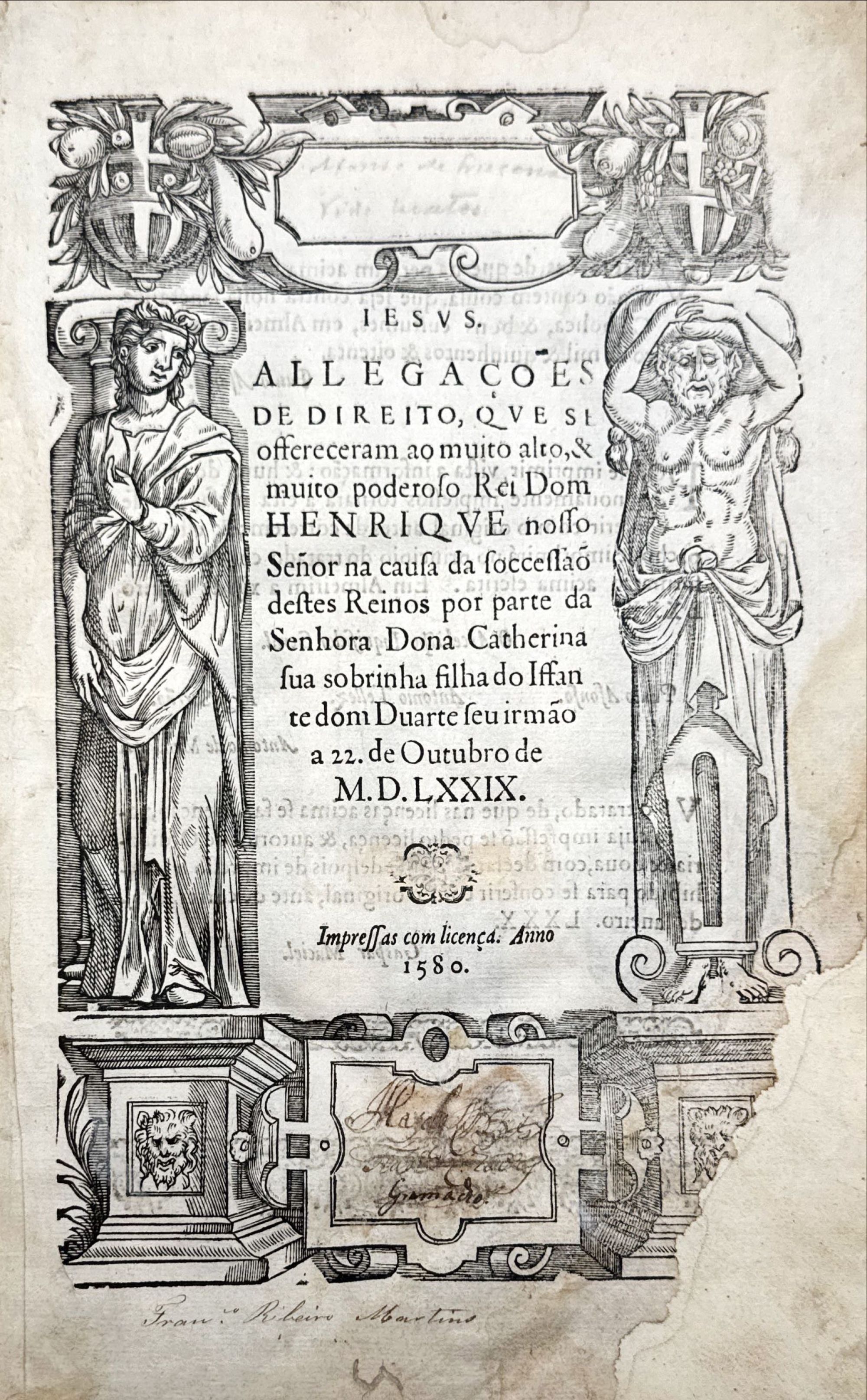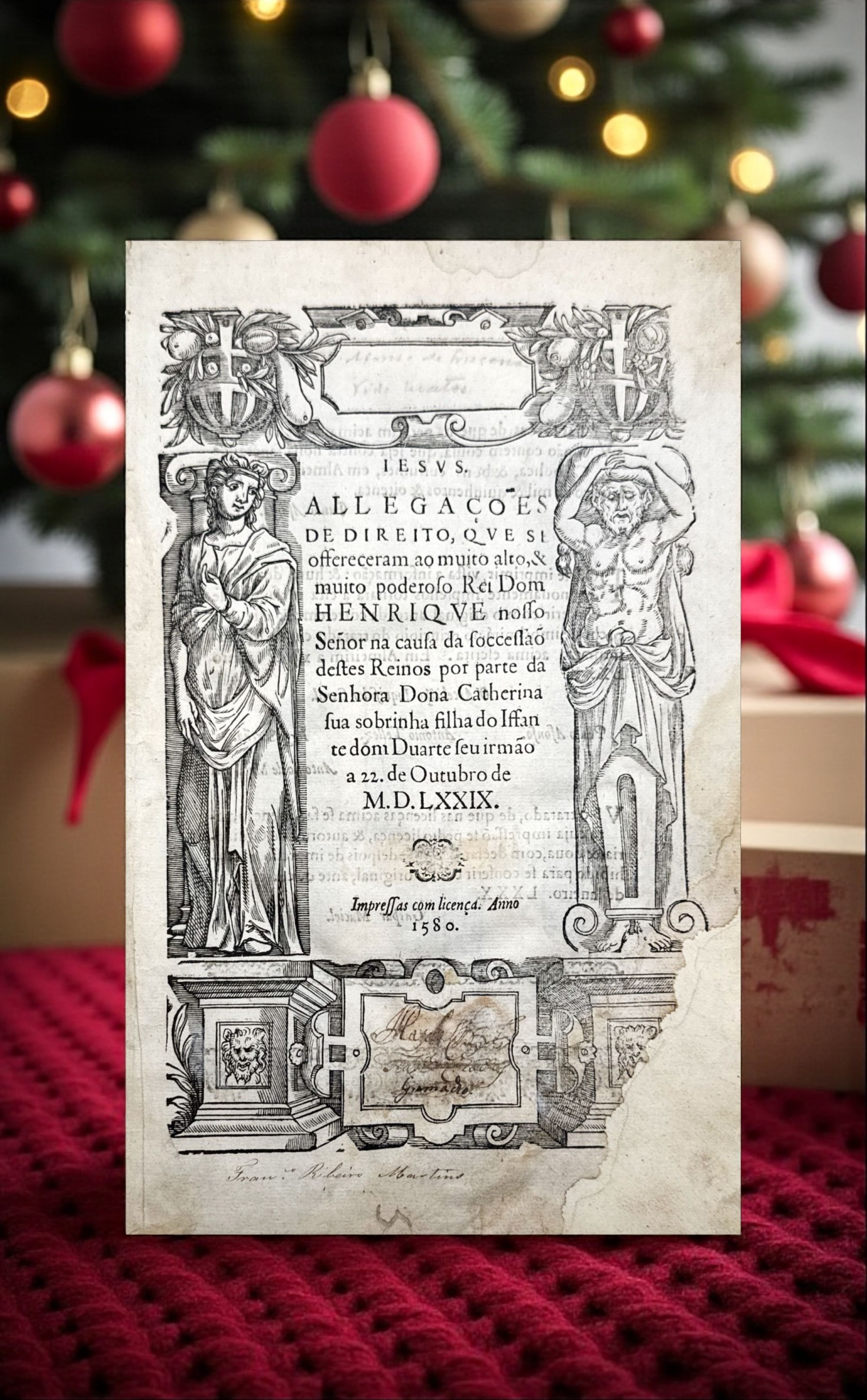 ALLEGAÇOENS DE DIREITO QVE SI offereceram ao alto & muito poderoso rei Dom HENRIQVE nosso Senhor na causa da soccessa destes Reinos por parte da Senhora Dona Catherina sua sobrinha filha do Iffante dom Duarte seu irmão a 22 de Outubro de M.D.LXXIX. ALMEIRIM. Per Antonio Ribeiro & Francisco Correa, 1580. In-4º de [6], 128 fls. (aliás 126). Enc.