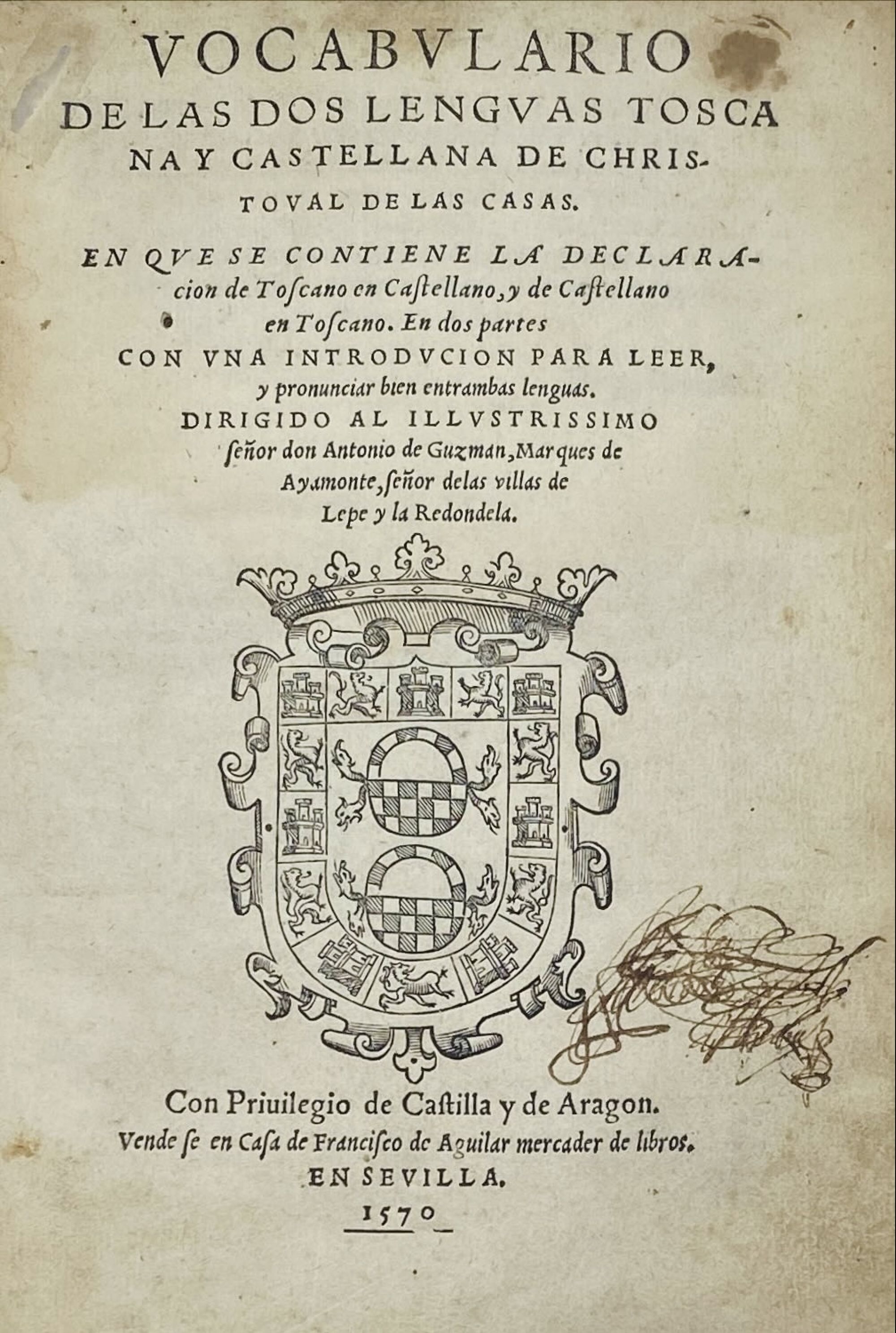 CASAS, Cristóbal de las. - VOCABVLARIO DE LAS DOS LENGVAS TOSCA NA Y CASTELLANA DE CHRISTOVAL DE LAS CASAS. EN QVE SE CONTIENE LA declaracion de Toscano en Castellano, de Castellano en Toscano. Em dos partes. Com vna introdvcion para leer, y pronunciar bien entrambas lenguas. Sevilla. En Casa de Francisco de Aguilar. 1570. 2 Partes. In-8º de 248 Fls. Enc. em 1.
