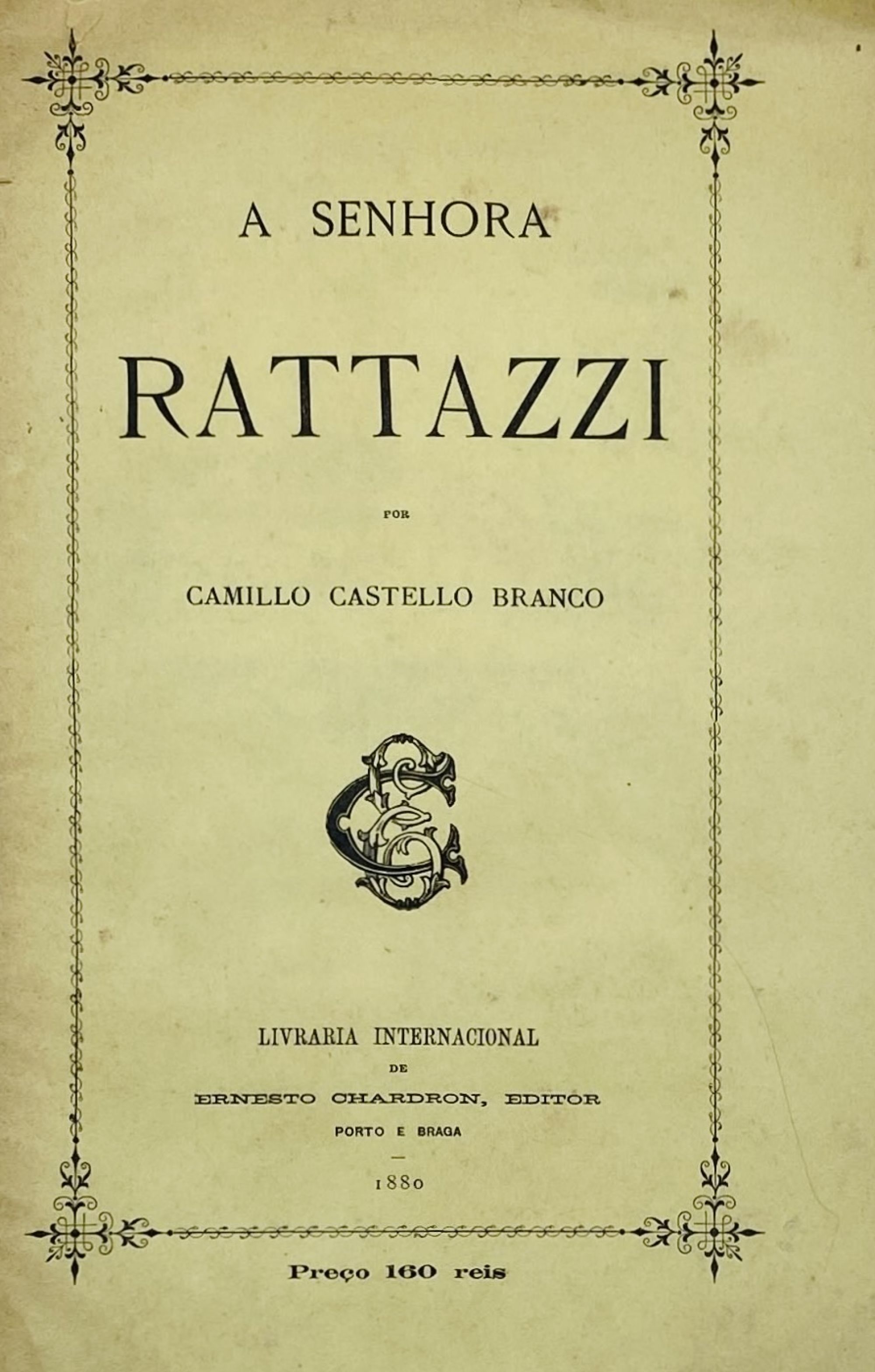 CASTELLO BRANCO, Camillo. - A SENHORA RATTAZZI. Porto e Braga. Livraria Internacional de Ernesto Chardron, Editor. 1880. In-8º de 30, [1] págs. Br.