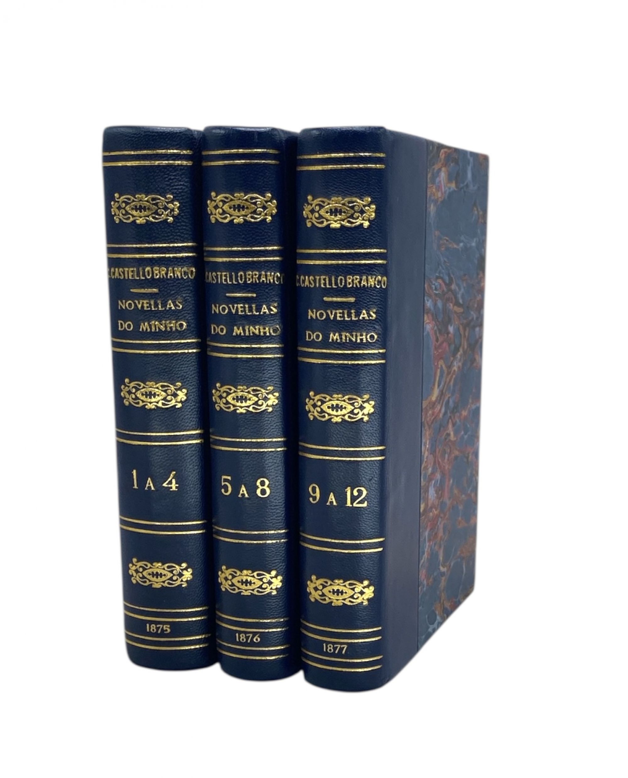 CASTELLO BRANCO, Camillo. - NOVELLAS DO MINHO. Publicação Mensal. Nº1 (ao 12). Lisboa. Livraria Editora de Mattos Moreira. 1875 (a 1877). 12 Vols. In-8º Encs. em 3.
