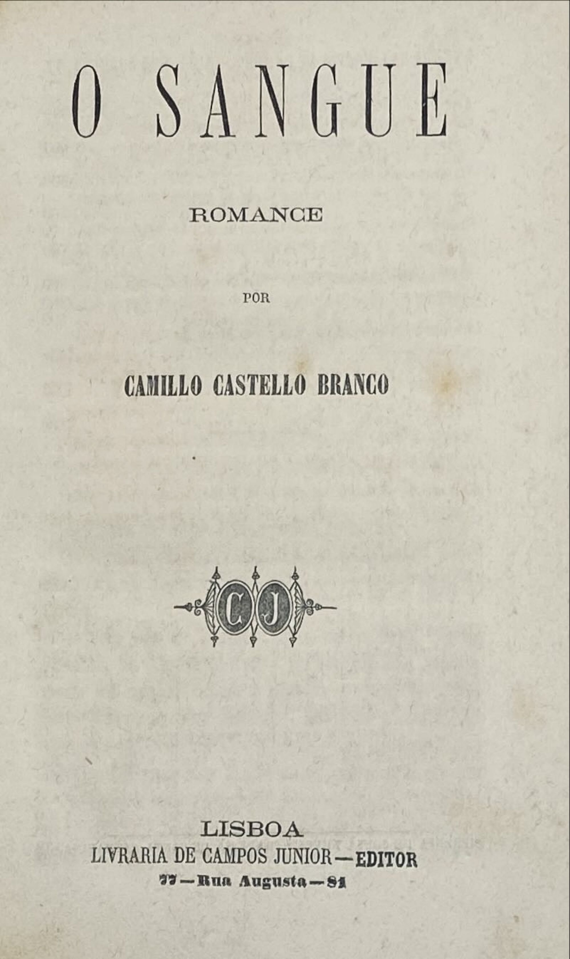 CASTELLO BRANCO, Camillo. - O SANGUE. Romance. Lisboa. Livraria de Campos Junior - Editor. S. data (1868). In-8º de 255, [1] págs. Enc.