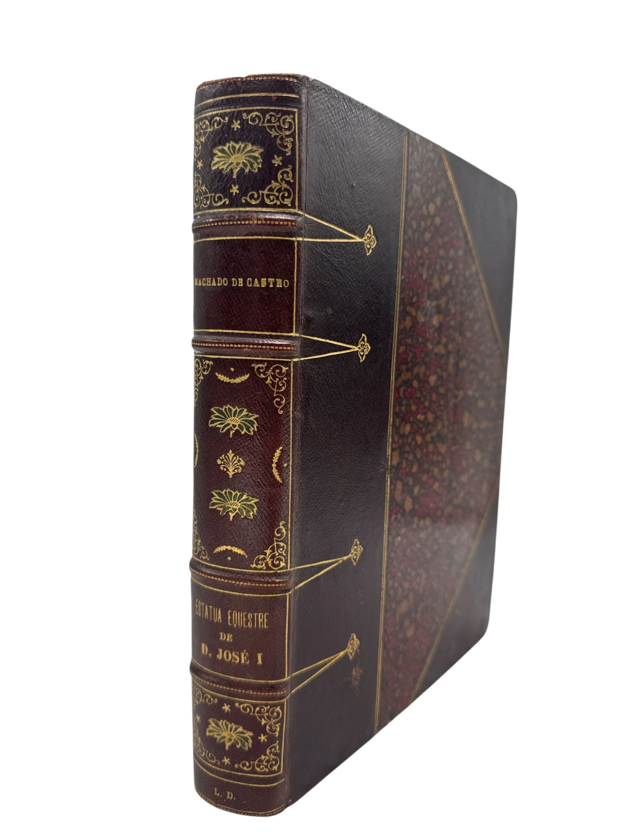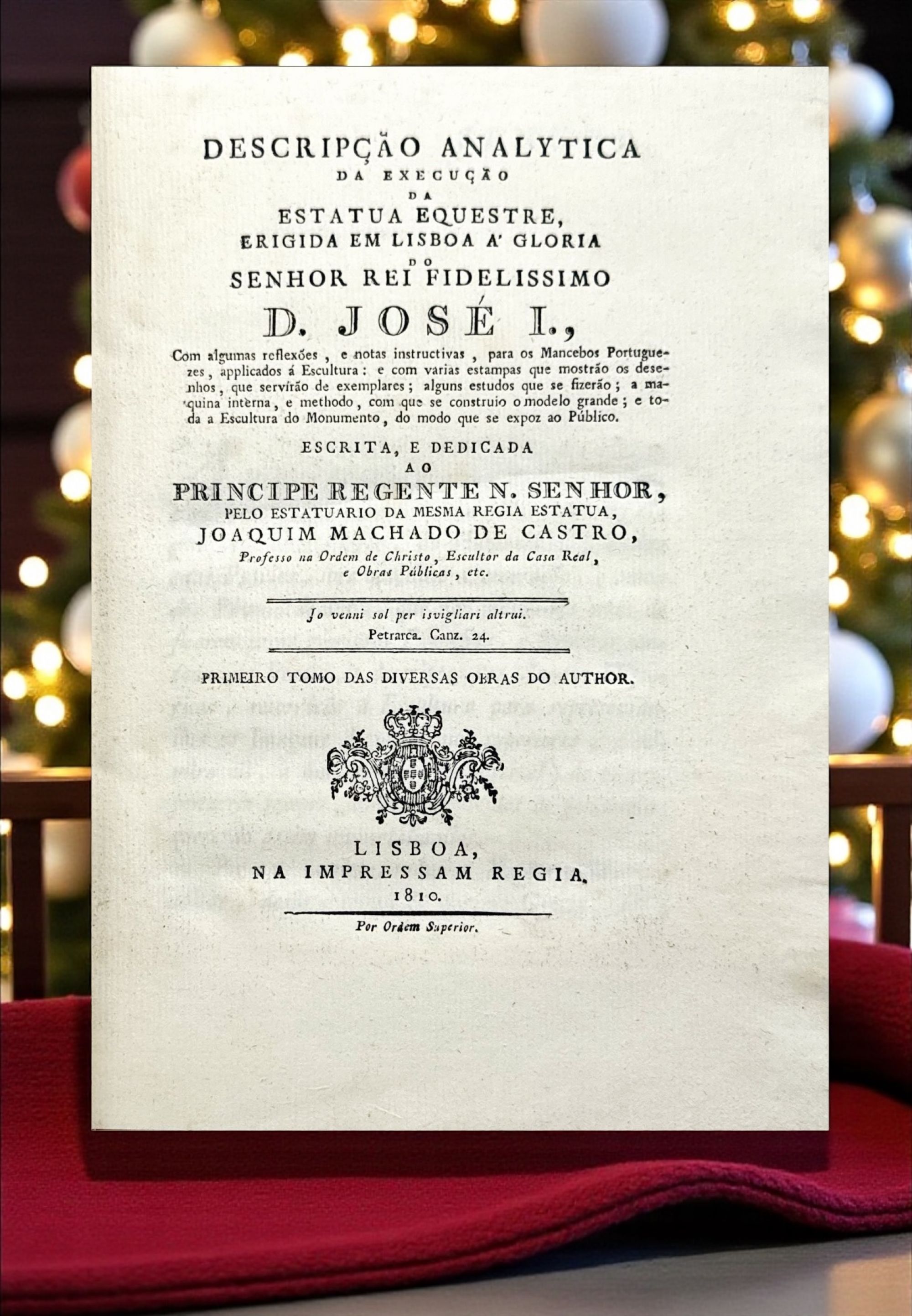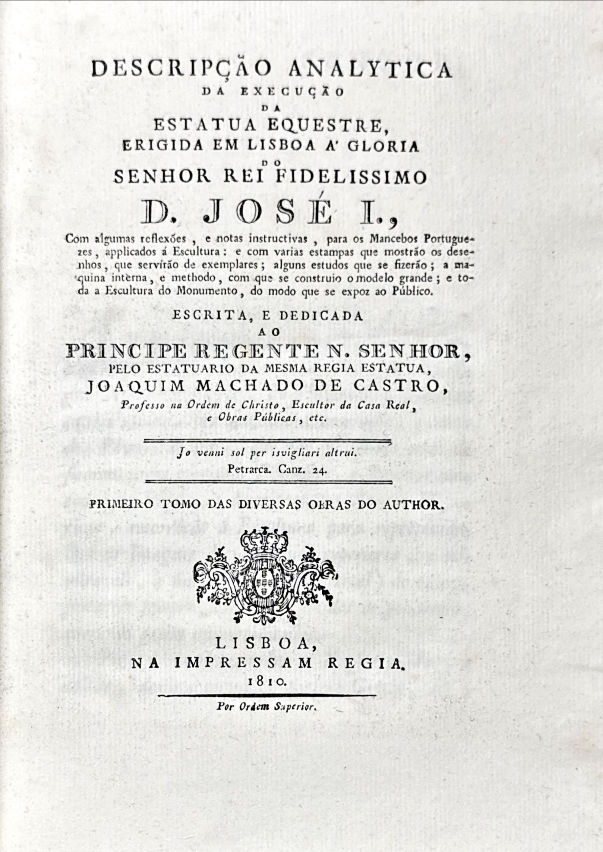 CASTRO, Joaquim Machado de. - DESCRIÇÃO ANALYTICA DA EXECUÇÃO DA ESTATUA EQUESTRE, ERIGIDA EM LISBOA Á GLORIA DO SENHOR REI D. JOSÉ I. Com algumas Reflexões, e notas instructivas, para os Mancebos Portuguezes, applicados á Escultura; e com varias estampas que mostrão os desenhos, que servirão de exemplares; alguns estudos que se fizerão; a maquina interna, e methodo, com que se construio o modelo grande; e toda a Escultura do Monumento, do modo que se expoz ao Público. Escrita, e dedicada ao Principe Regente N.Senhor, pelo Estatuario da Mesma Regia Estatua, Joaquim Machado de Castro. LISBOA: Na Impressão Regia. 1810. In-8º de [16], XXVI, 328, VI págs. Enc.