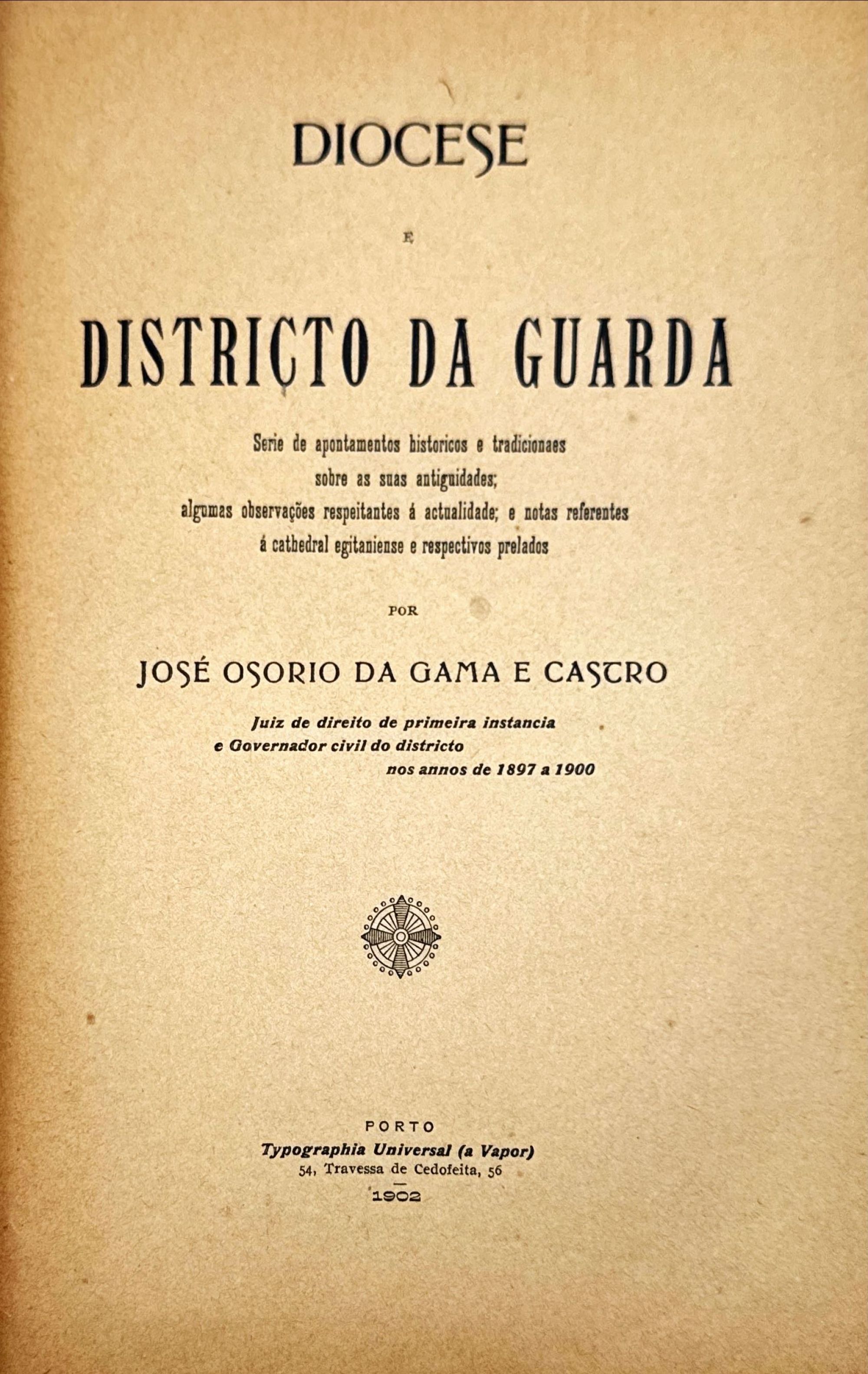 CASTRO, José Osorio da Gama e. - DIOCESE E DISTRICTO DA GUARDA. Serie de apontamentos historicos e tradicionaes sobre as suas antiguidades; algumas observações respeitantes á actualidade; e notas referentes á cathedral egitaniense e respectivos prelados. Porto. 1902. In-8º de XXVIII, 521, [3] págs. Enc.