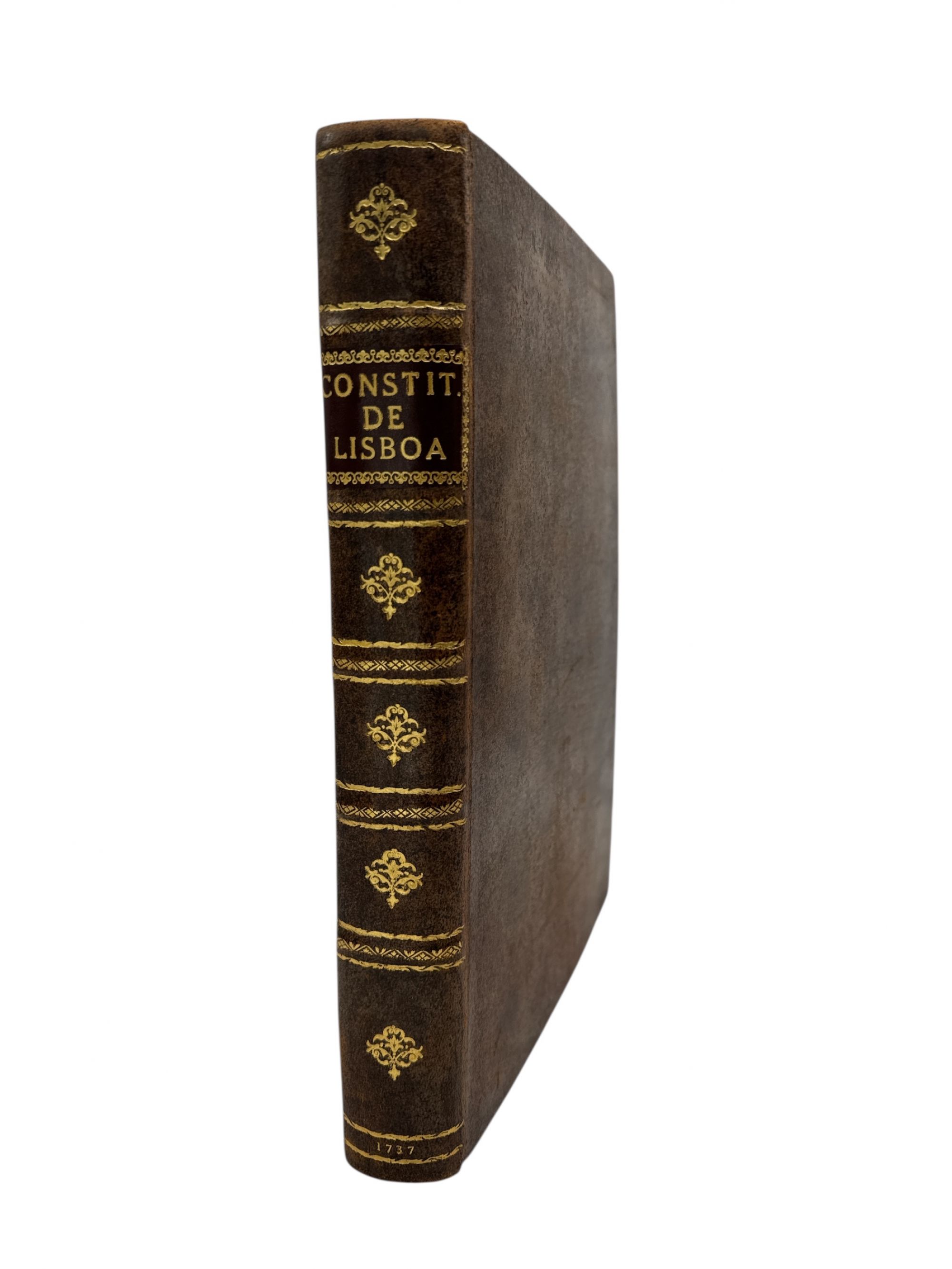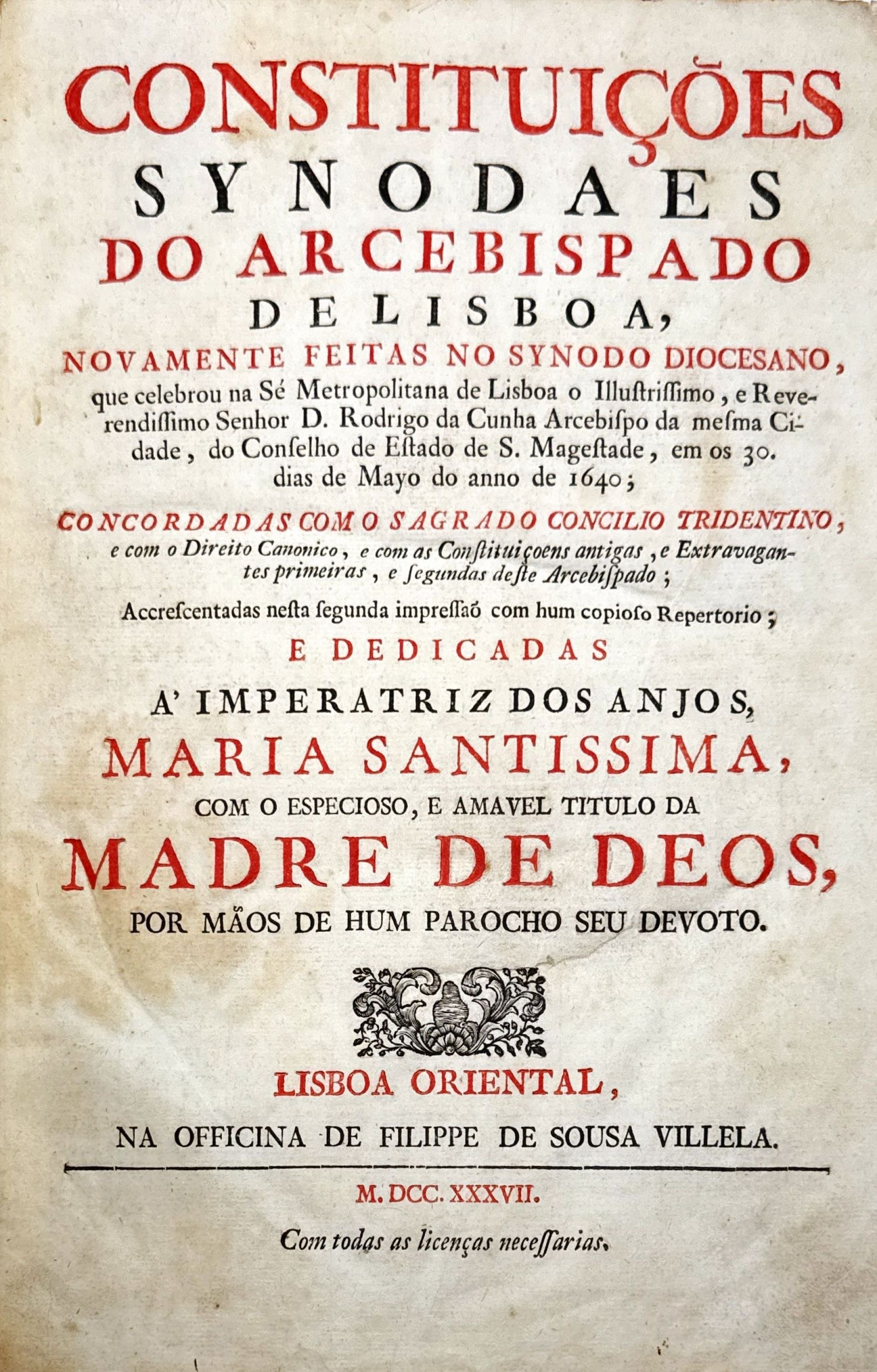 CONSTITUIÇÕES SYNODAES DO ARCEBISPADO DE LISBOA, novamente feitas no synodo diocesano, que celebrou na Sé Metropolitana de Lisboa o Illustrissimo, e Revarendissimo Senhor D. Rodrigo da Cunha Arcebispo da mesma Cidade, do Conselho de Estado de S. Magestade, em os 30 dias de Mayo do anno de 1640... Accrecentadas nesta segunda impressão com hum copioso repertorio. Lisboa. Na Officina de Filipe de Sousa Villela. 1737. In-4º de [6], 666 págs. Enc.