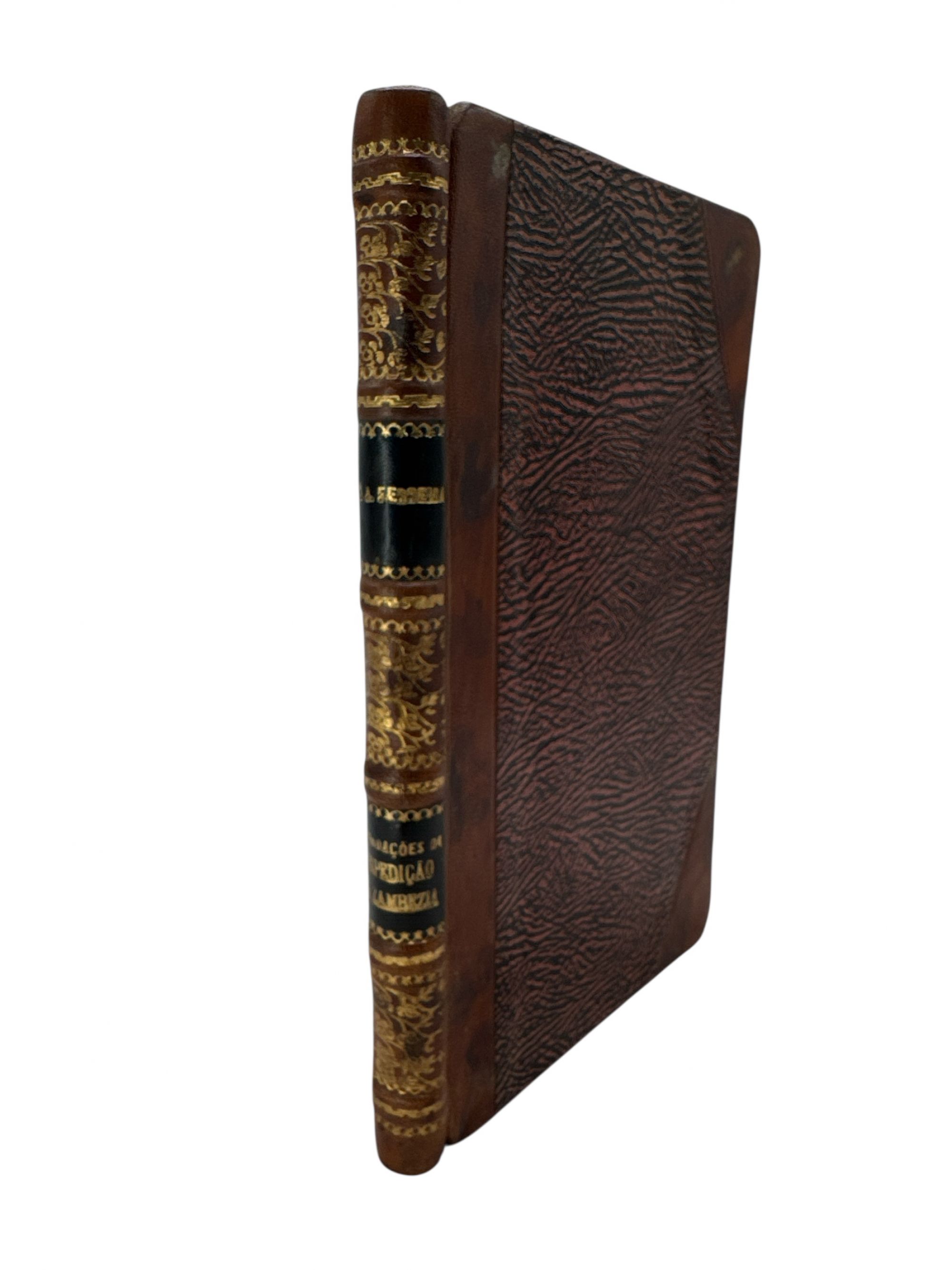 Rara. Carimbo do ex-libris de “Vasconcellos” no frontispício. Encadernação em meia de pele. Com capas.