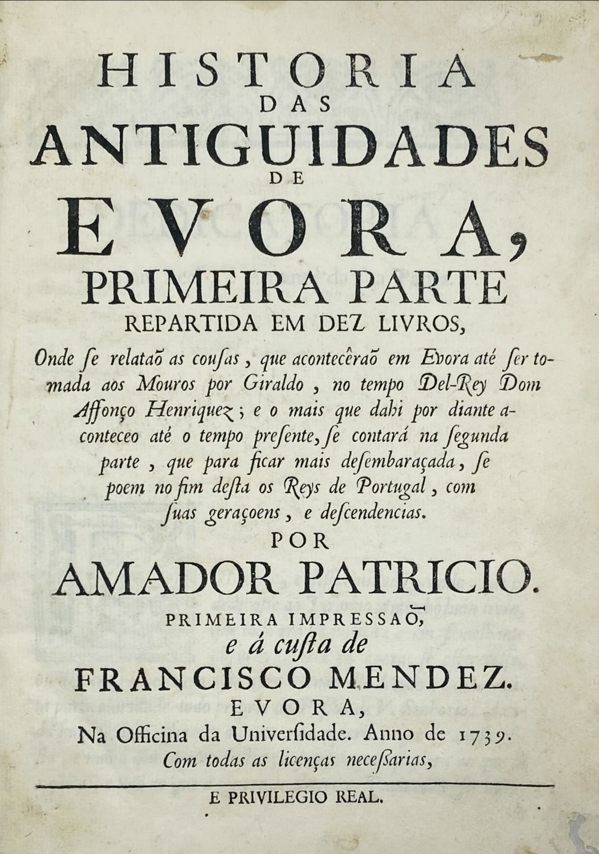 HISTORIA DAS ANTIGUIDADES DE EVORA PRIMEIRA PARTE REPARTIDA EM DEZ LIVROS... por Amador Patricio.