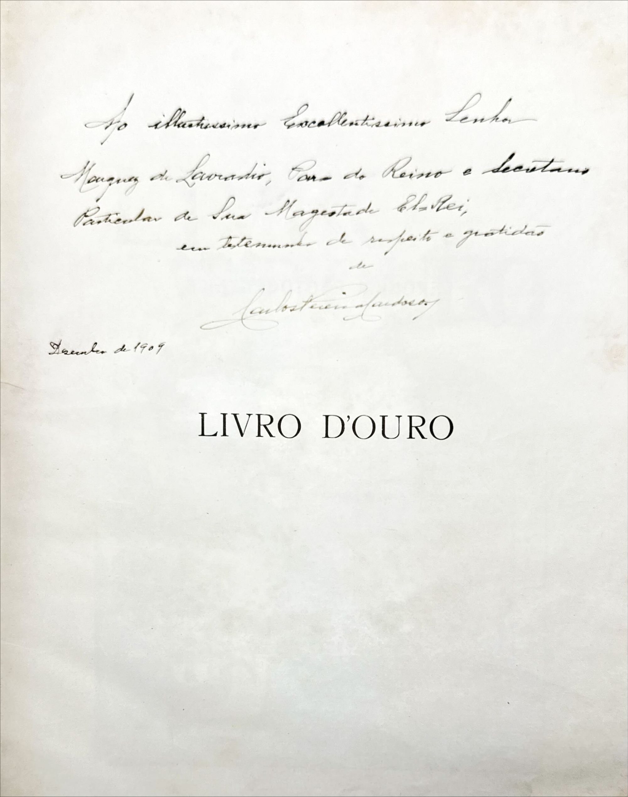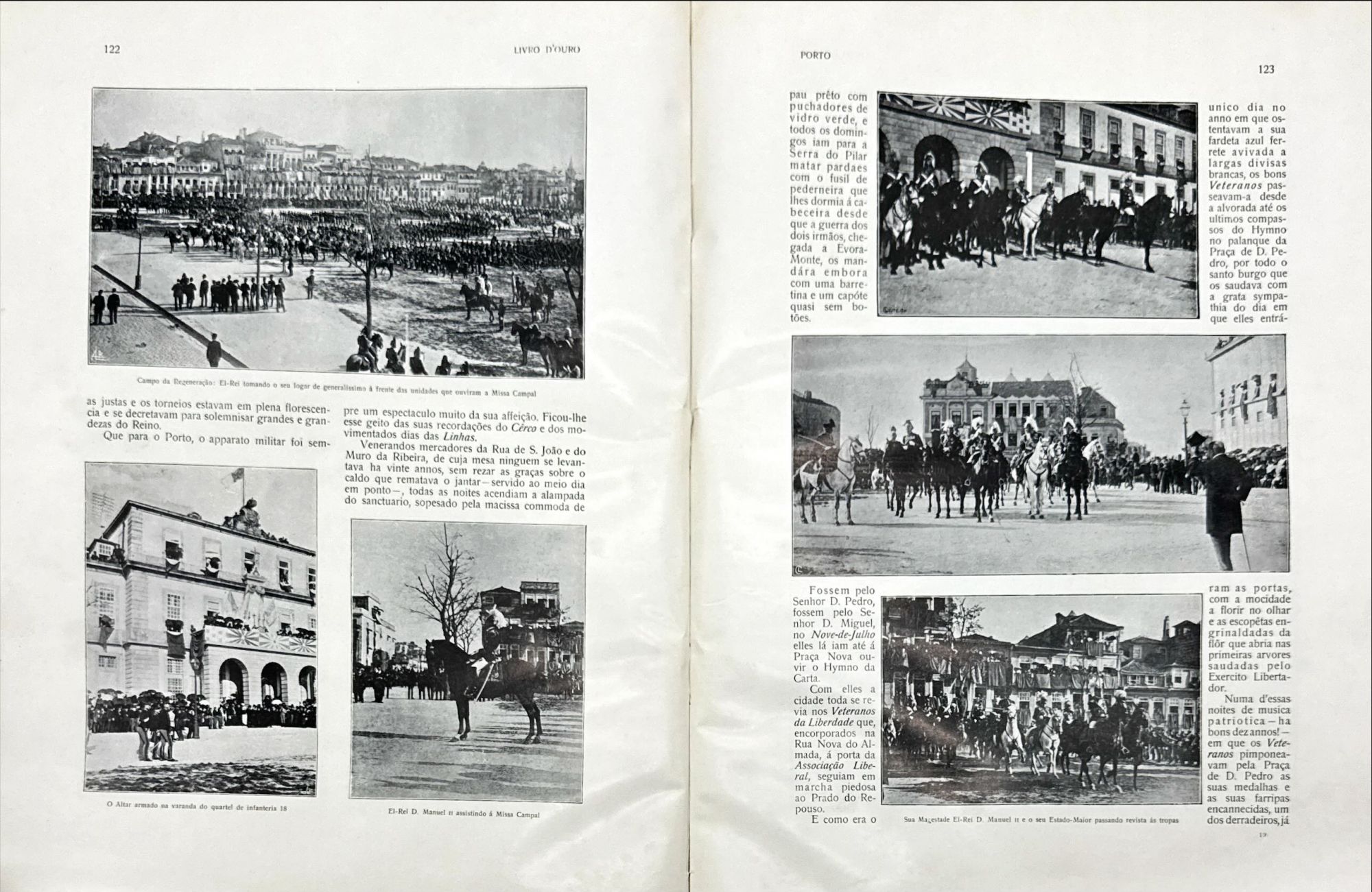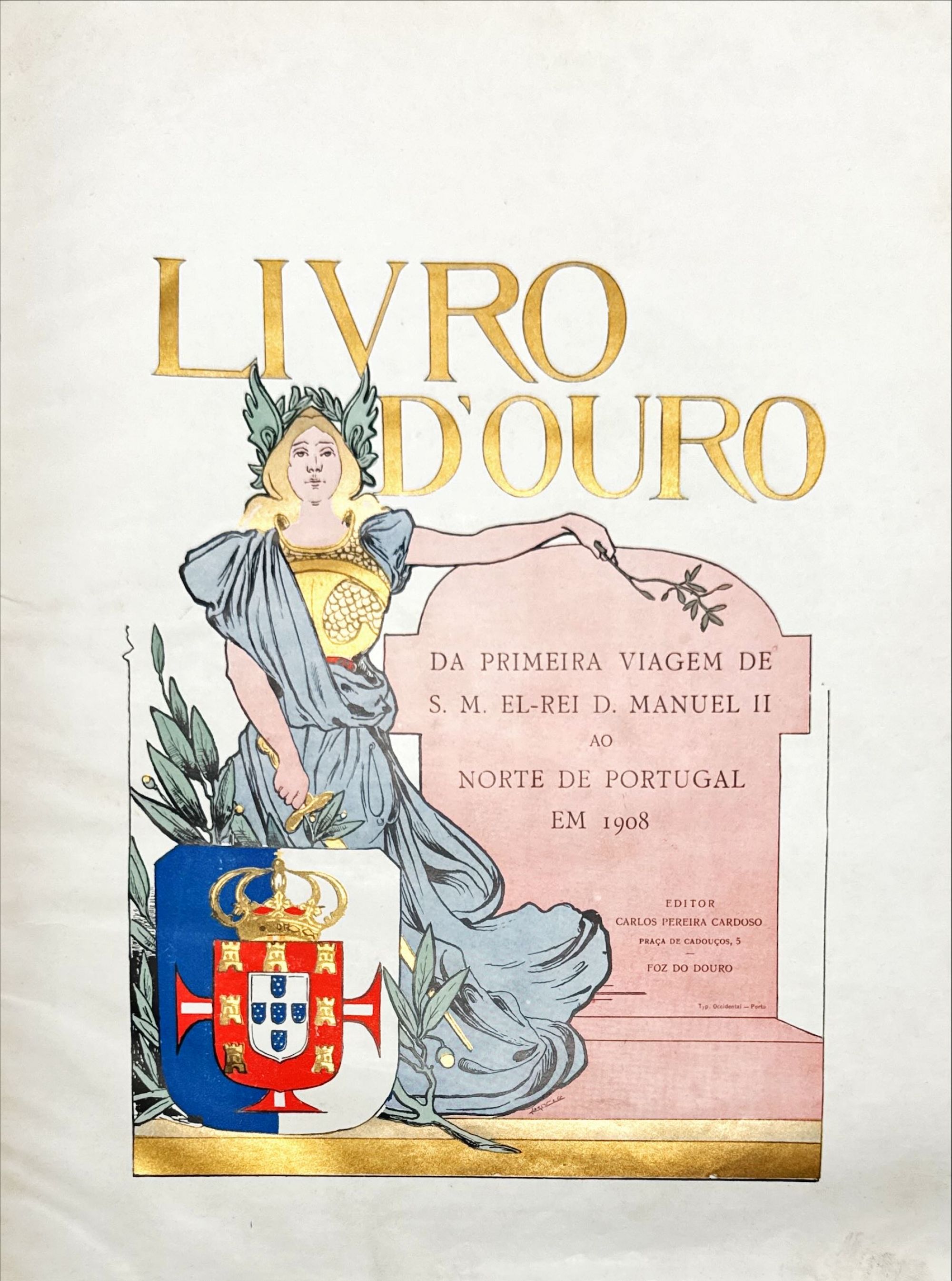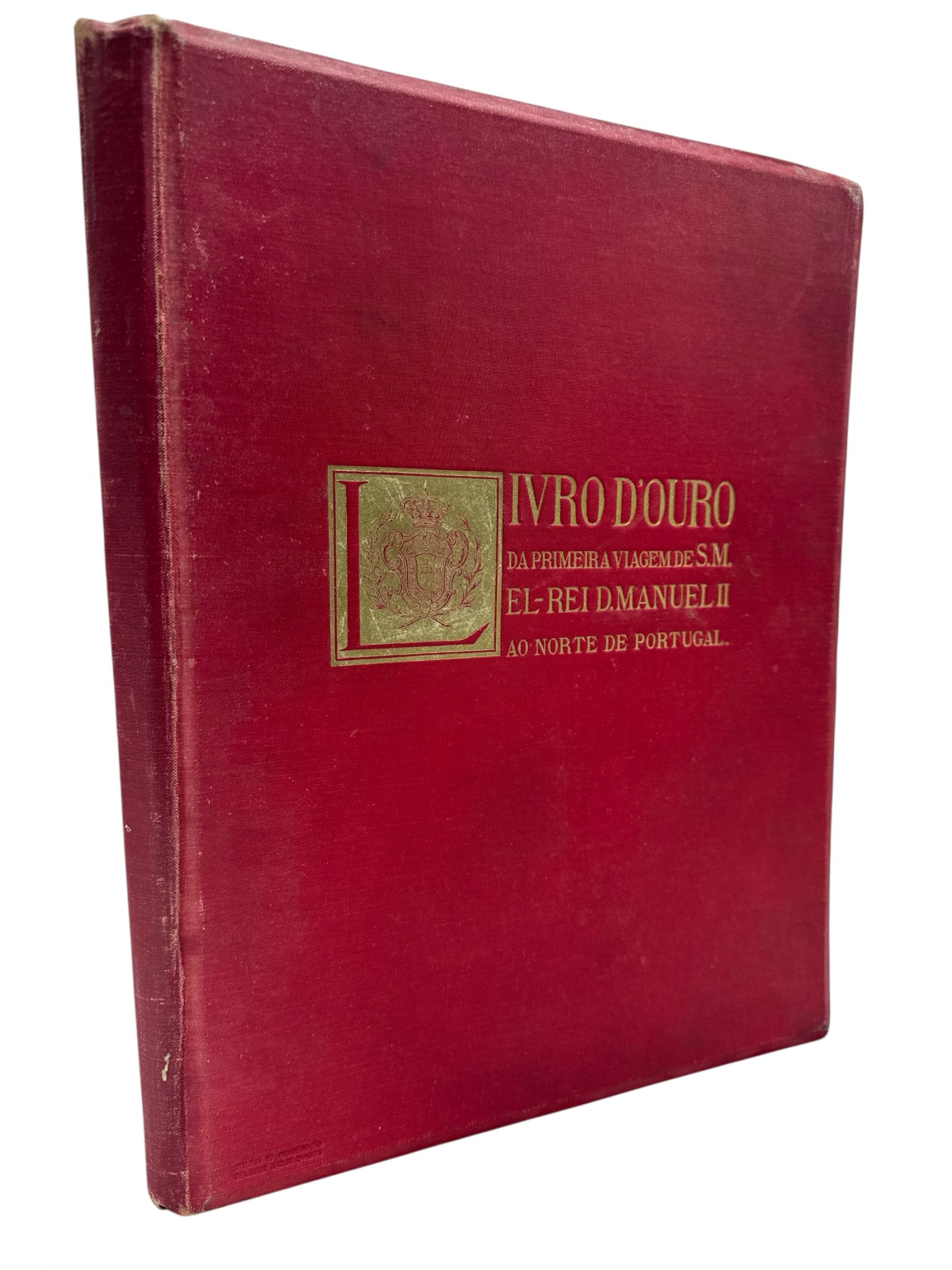 LIVRO D'OURO DA PRIMEIRA VIAGEM DE S. M. EL-REI D. MANUEL II AO NORTE DE PORTUGAL EM 1908. Chronica photographica por Carlos Pereira de Castro. Commentada por os Excellentissimos Senhores Joaquim Leitão, Marques Gomes e António de Azevedo. Foz do Douro. 1909. In-4º de 194, [1] págs. Enc.