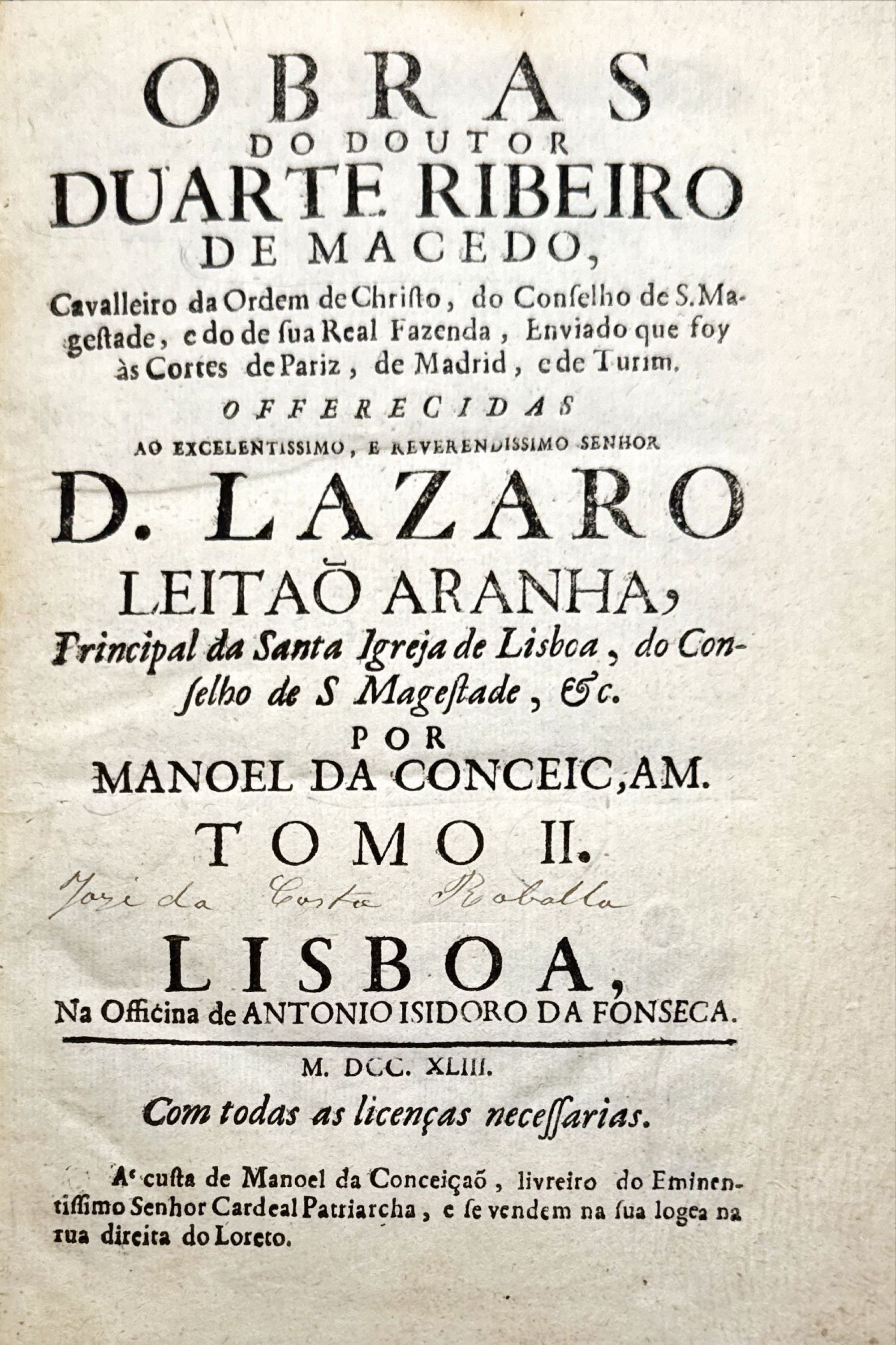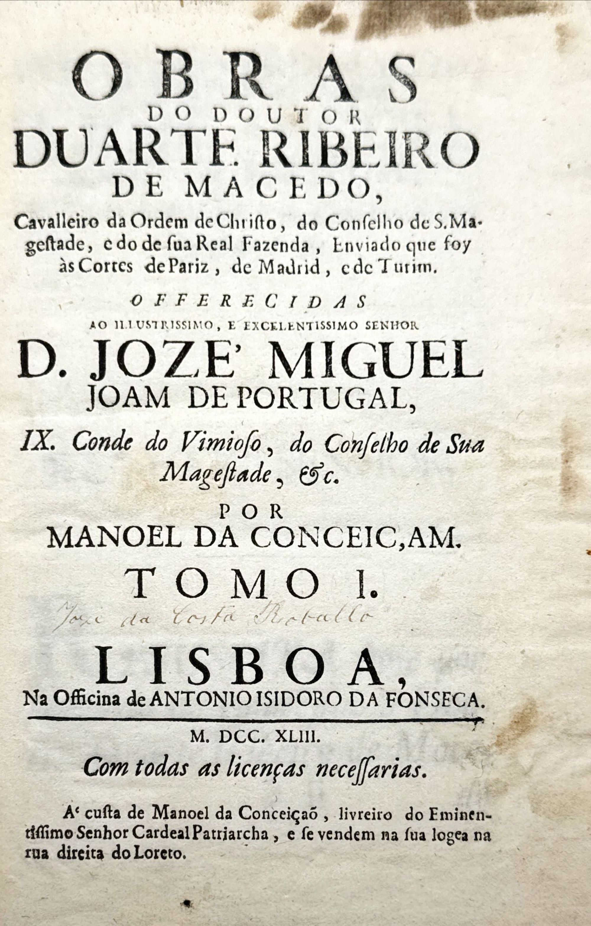 MACEDO, Duarte Ribeiro de. - OBRAS DO DOUTOR DUARTE RIBEIRO DE MACEDO, cavalleiro da ordem de christo, do conselho de s. magestade, e do de sua real fazenda, enviado que foi às cortes de Pariz, de Madrid, e de Turim. Tomo I (e II). Lisboa. Na Officina de Antonio Isidoro da Fonseca. 1743. 2Vols. In-8º. Encs.