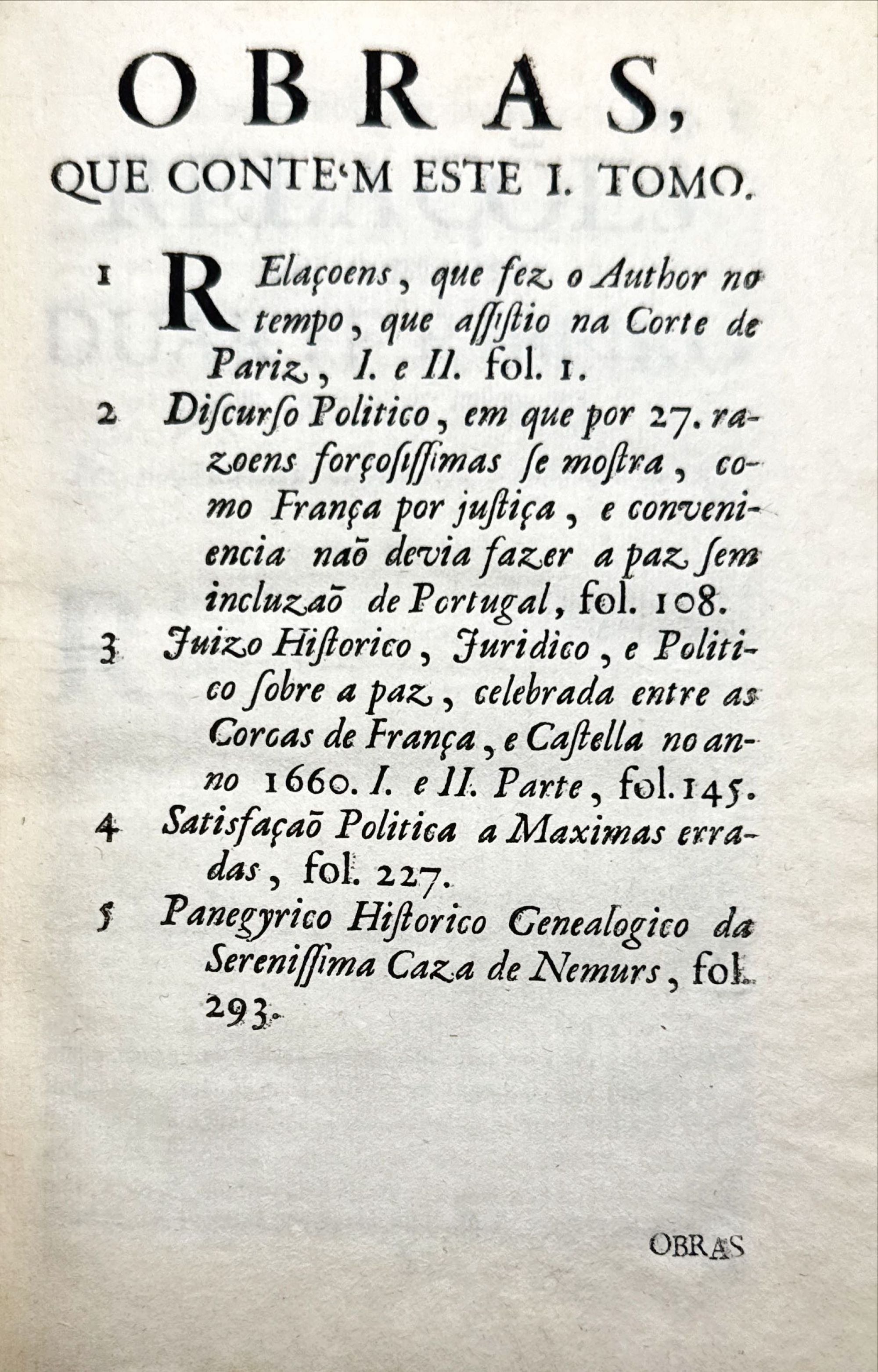 MACEDO, Duarte Ribeiro de. - OBRAS DO DOUTOR DUARTE RIBEIRO DE MACEDO, cavalleiro da ordem de christo, do conselho de s. magestade, e do de sua real fazenda, enviado que foi às cortes de Pariz, de Madrid, e de Turim. Tomo I (e II).
