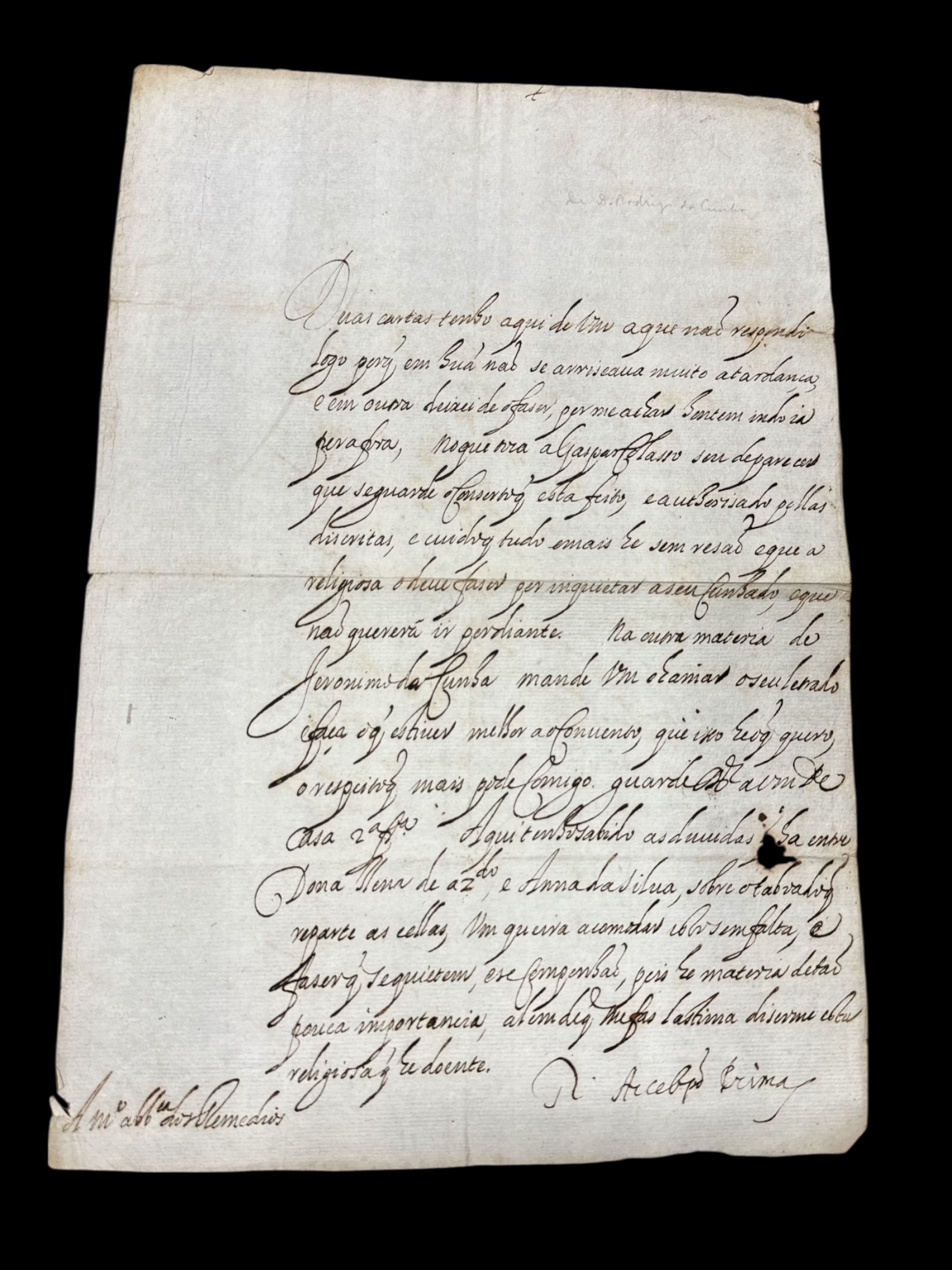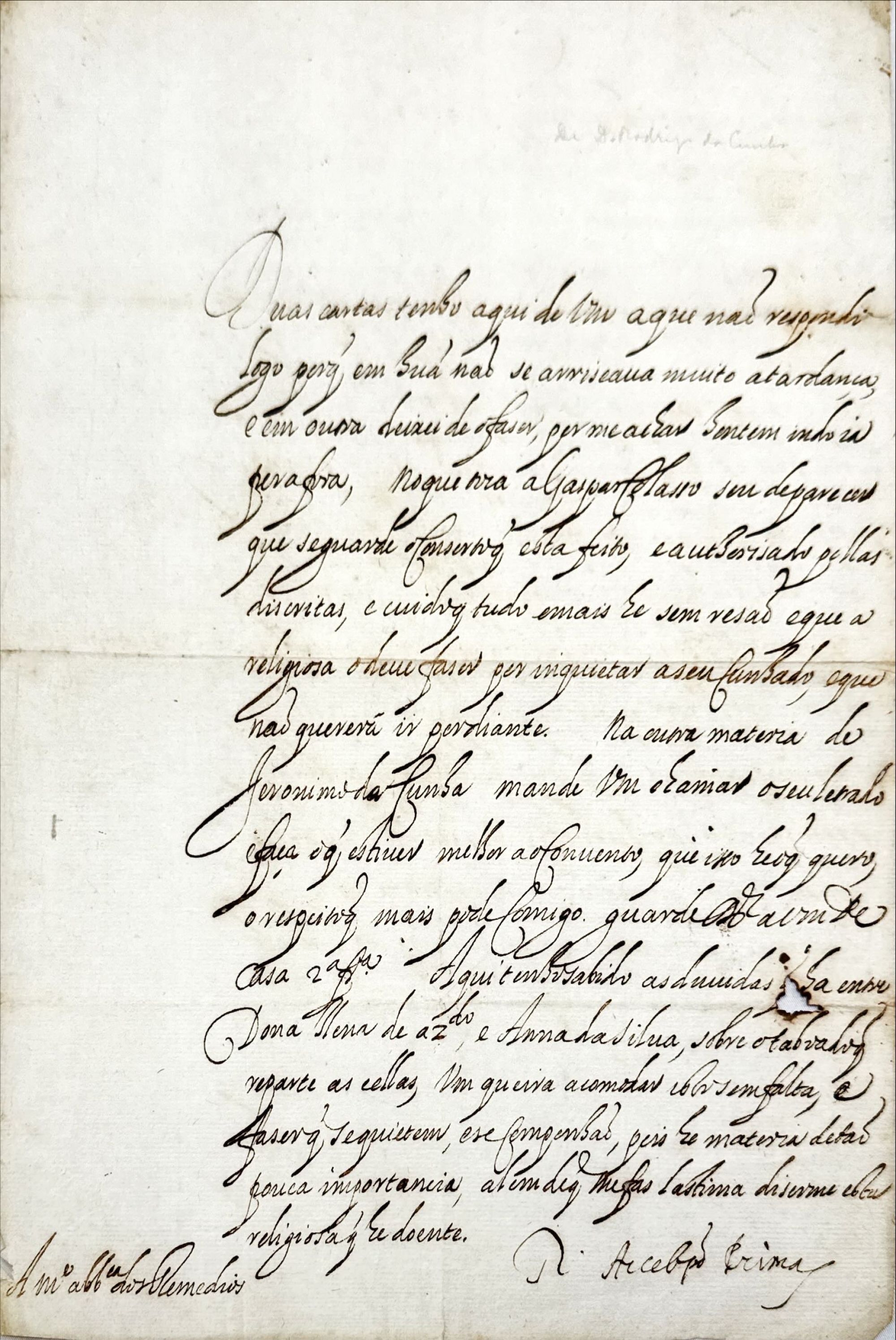 Carta com assinatura autografa de D. Rodrigo da Cunha enquanto arcebispo de Braga à abadessa do Mosteiro Nossa Senhora dos Remédios de Braga, dando conselhos e ordens no que diz respeito aos casos de Gaspar Colasso (Meirinho dos Clérigos em geral, da Corte de Braga?), Jerónimo da Cunha, Elena de Azevedo e Ana da Silva. O documento não tem data nem lugar, está assinado "R[odrigo] Arceb[is]po Primaz", referindo-se a posição primacial do arcebispo de Braga. A destinatária da carta era sujeita ao arcebispo de Braga. De tudo isto se infere que o documento data do pontificado de D. Rodrigo da Cunha que decorreu entre 1627-1635.