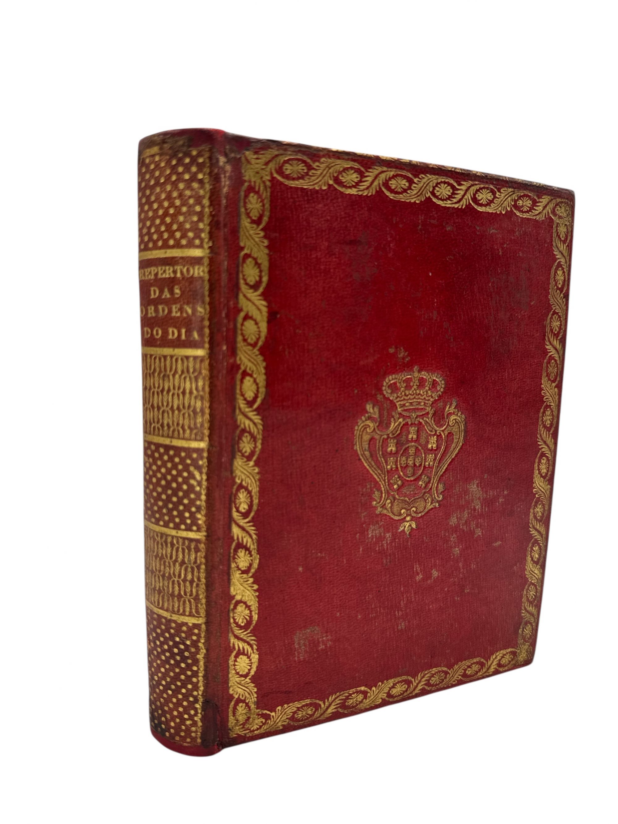 Raro. Trata-se de uma coleção de todas ordens do dia referente ao exército de sua Majestade El-Rei D. Miguel I relativamente ao ano de 1830. Obra deveras importante para a história do exército português durante a chamada guerra civil entre liberais e miguelistas, que só veio a terminar em 1834. Estas ordens do dia contêm ainda toda a principal legislação respeitante à administração corrente do reino como, por exemplo, a criação da primeira escola veterinária com todos os seus institutos, regulamentos e funcionamento interno diário. Exemplar bem conservado e limpo. Encadernação da inteira de pele com ferros a ouro na lombada e pastas com o brasão de armas de Portugal ao centro. Dourado por folhas.