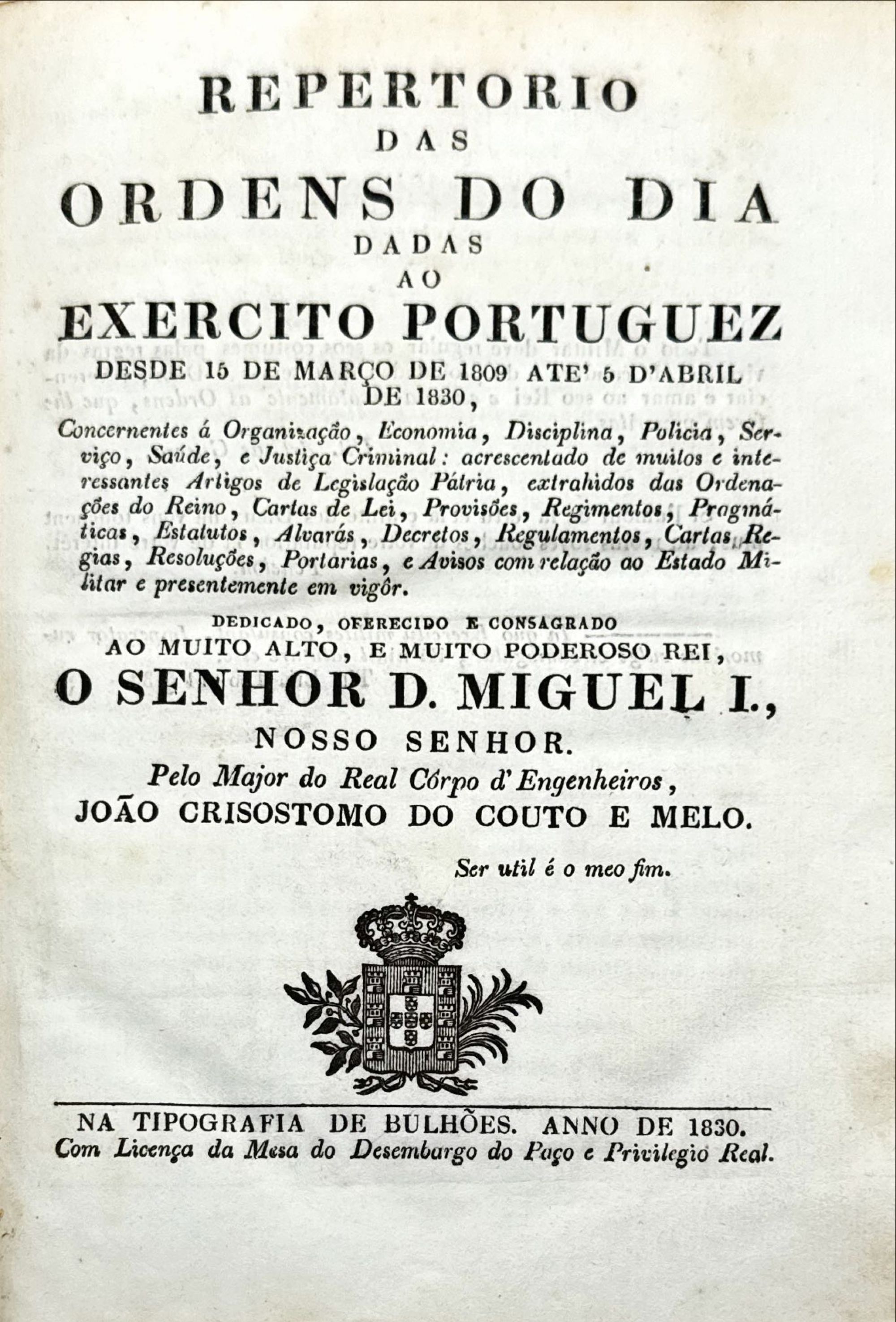 MELO, João Crisostomo do Couto e. - REPERTORIO DAS ORDENS DO DIA DADAS AO EXERCITO PORTUGUEZ DESDE 15 DE MARÇO DE 1809 ATÉ 5 D'ABRIL DE 1830.