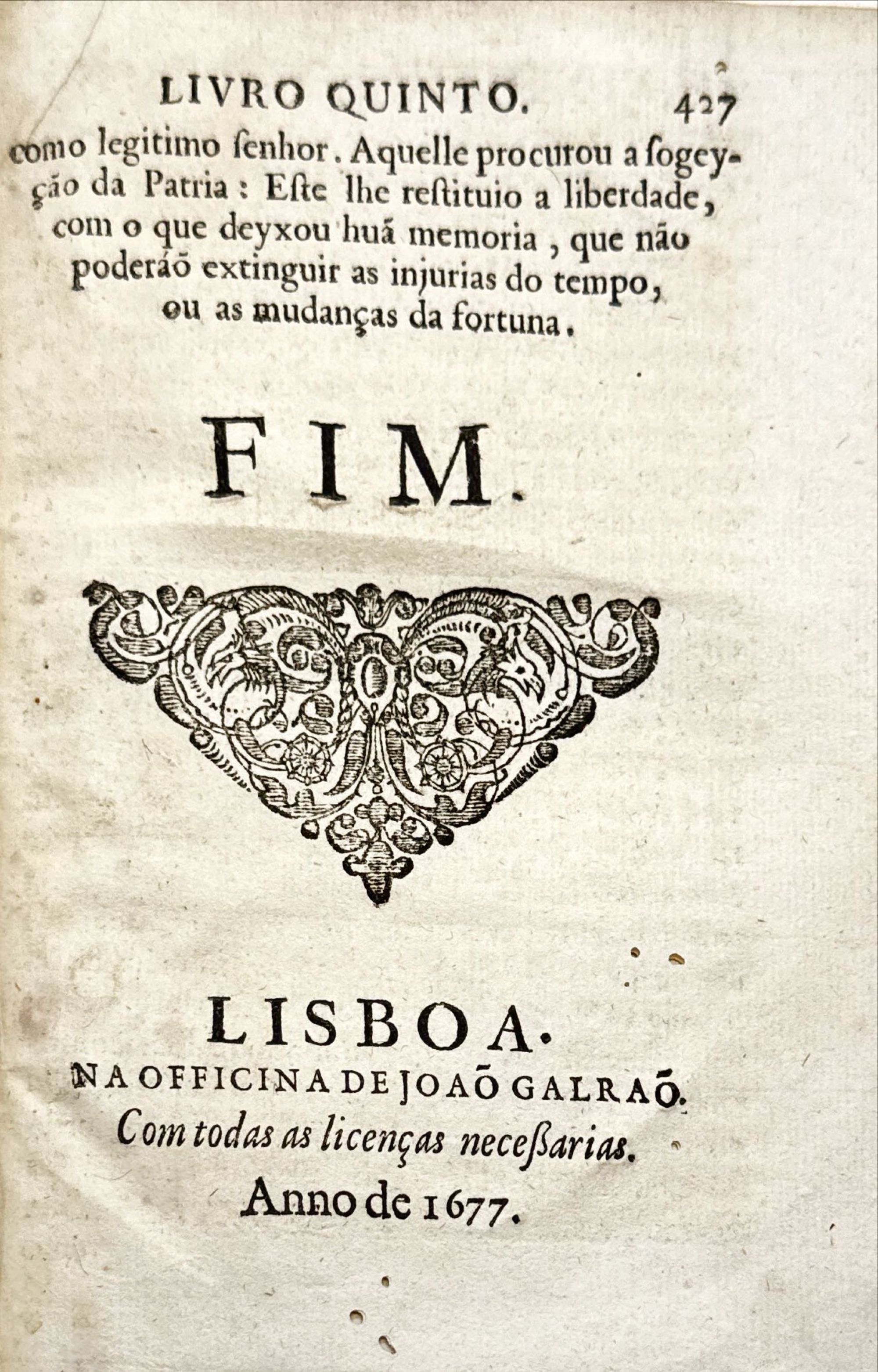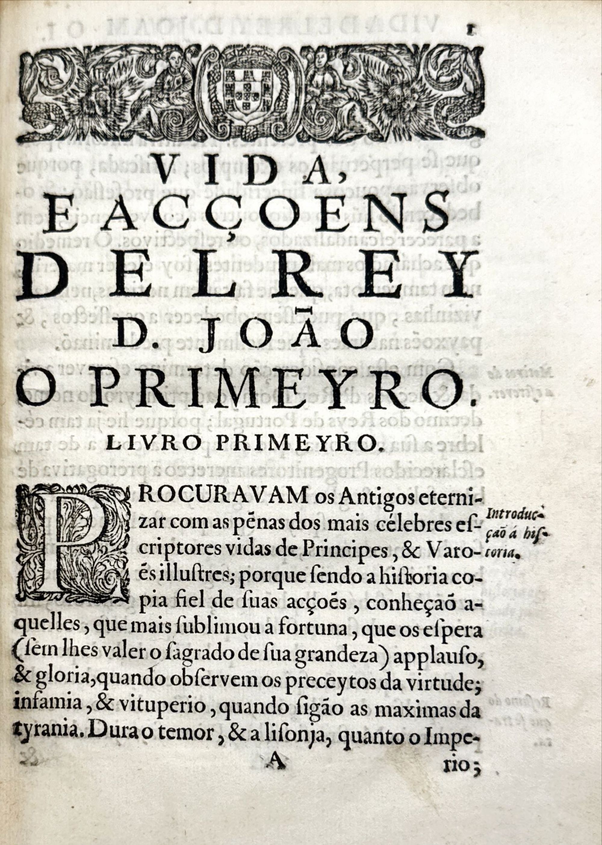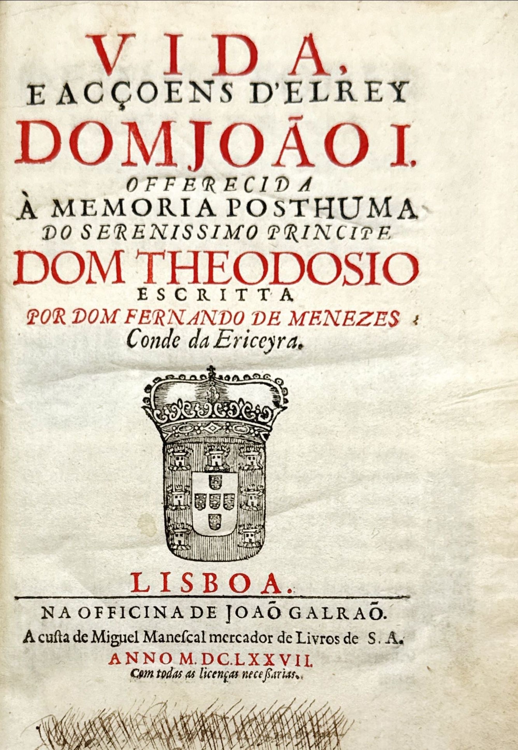 MENESES, D. Fernando de. - VIDA, E ACÇOENS D'ELREY DOM JOÃO I. Offerecida à memoria posthuma do serenissimo principe dom theodosio escritta por dom fernando de meneses. Conde da Ericeyra. [Gravura]. A custa de Miguel Manescal mercador de Libros de S. A. Com todas as licenças necessarias. Lisboa. Officina de João Galraõ. 1677. In-8º de [66], 427, [1] págs. Enc.