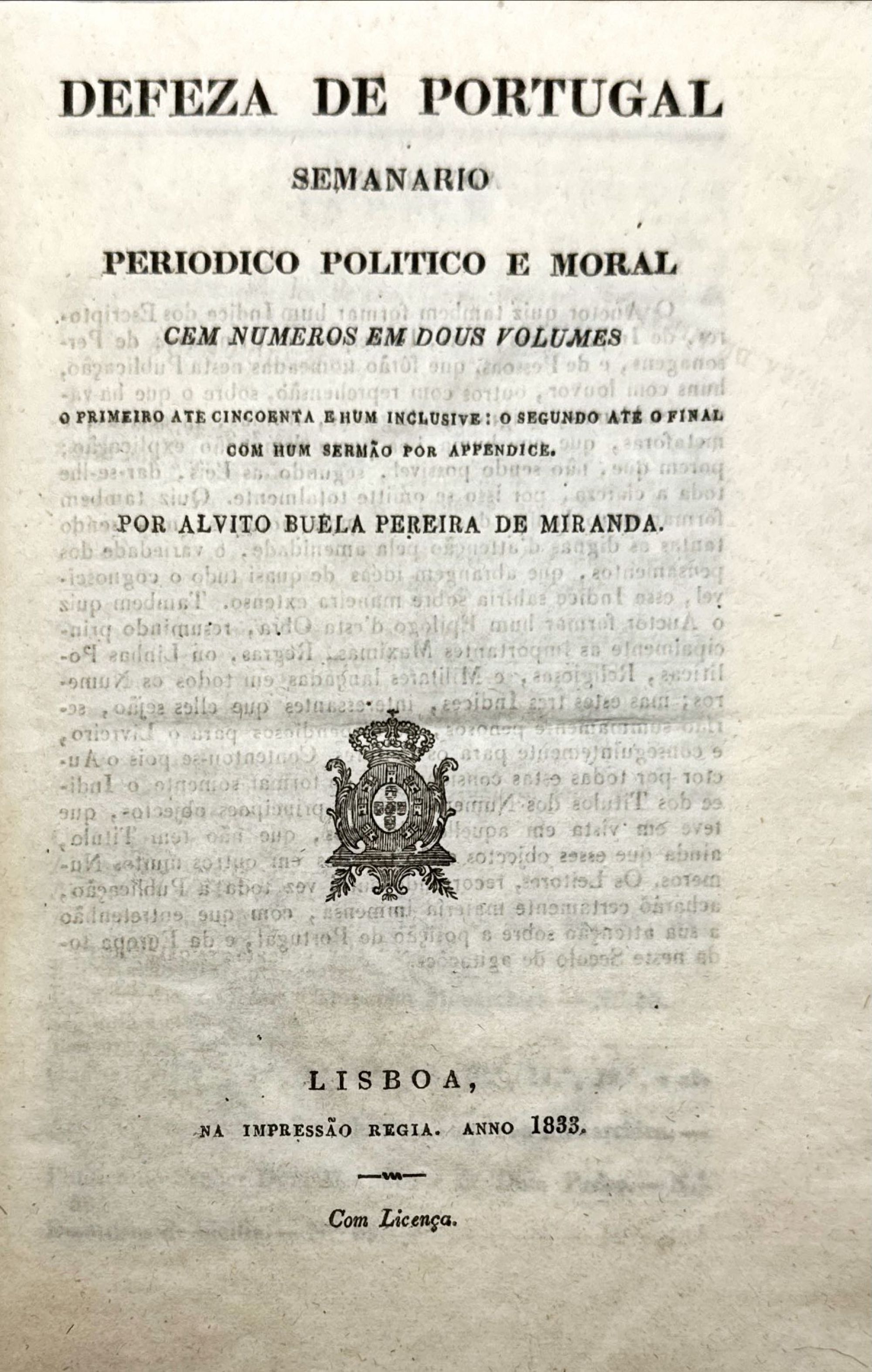 MIRANDA, Pe. Alvito Buela Pereira de. - DEFEZA DE PORTUGAL. Semanário periódico político e moral. Nº1 (ao 100). Lisboa. Na Impressão Regia. 1831 (a 1833). 2 Vols. In-8º Encs.