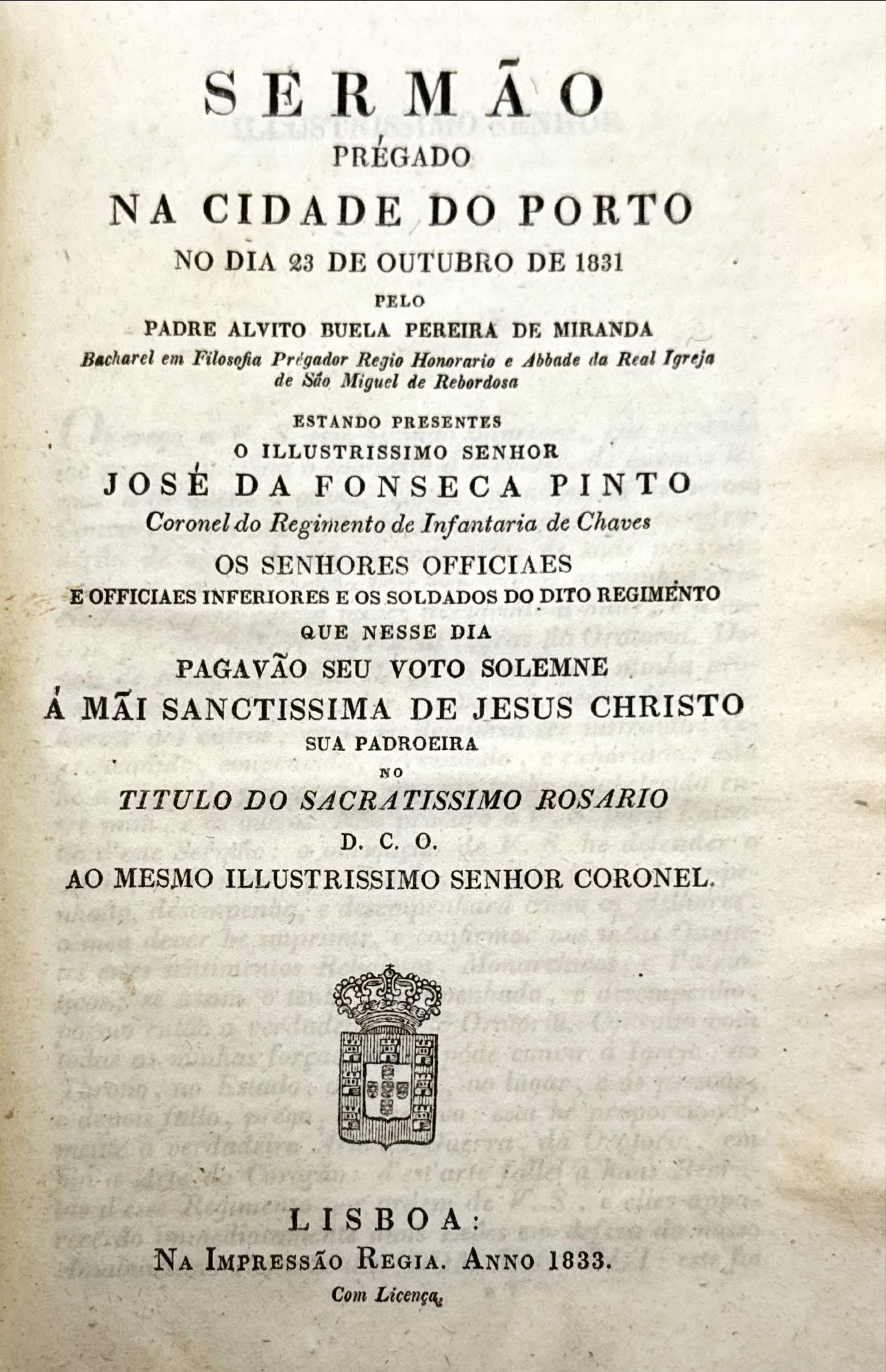 Raro e importante periódico de propaganda Miguelista e Antimaçónica, que se compõe de 100 números publicados entre 16 de julho de 1831 e 7 de março de 1833. No final do 2º volume, encontra-se um folheto relativo ao Sermão pregado na cidade do Porto pelo Padre Alvito Buela Pereira de Miranda, Abade da Real Igreja de São Miguel da Rebordosa, estando presente o Coronel José da Fonseca Pinto, comandante do Regimento de Infantaria de Chaves. Encadernações da época meia de pele com alguns defeitos nas lombadas.
