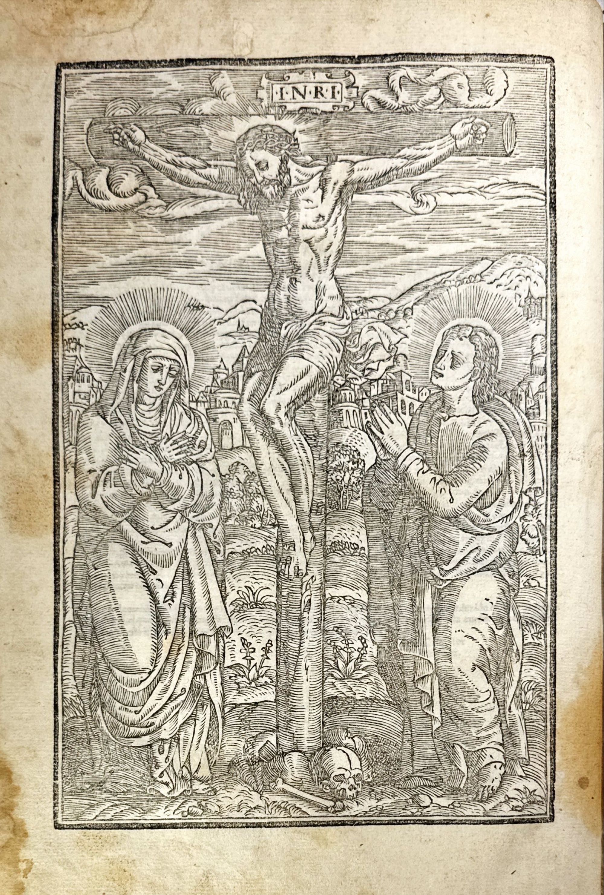 Muito rara. Publicaram-se no século XVI várias edições desta obra, em virtude de a mesma estar incluída no Índice Expurgatório de Valdés e se terem inutilizado a maioria dos exemplares. A edição original publicou-se em 1512 e não se conhece nenhum exemplar completo. Ilustrado com uma gravura de plena página, representando o calvário e pequenas xilogravuras no texto. O frontispício enquadrado numa portada gravada. Exemplar manuseado, com manchas de humidade, pequenos defeitos, restauro no frontispício e anotações a tinta. Encadernação inteira de pele, com a lombada mais recente. Palau, Tomo X, págs. 129/130.