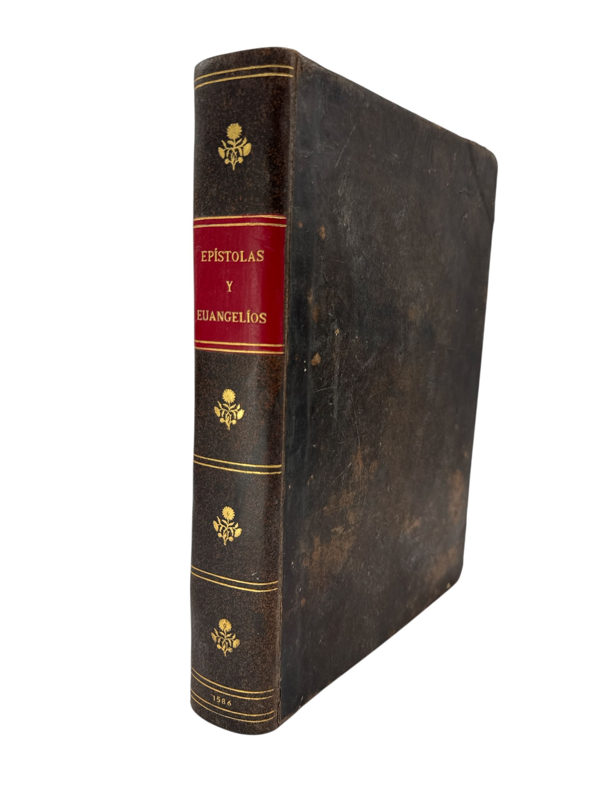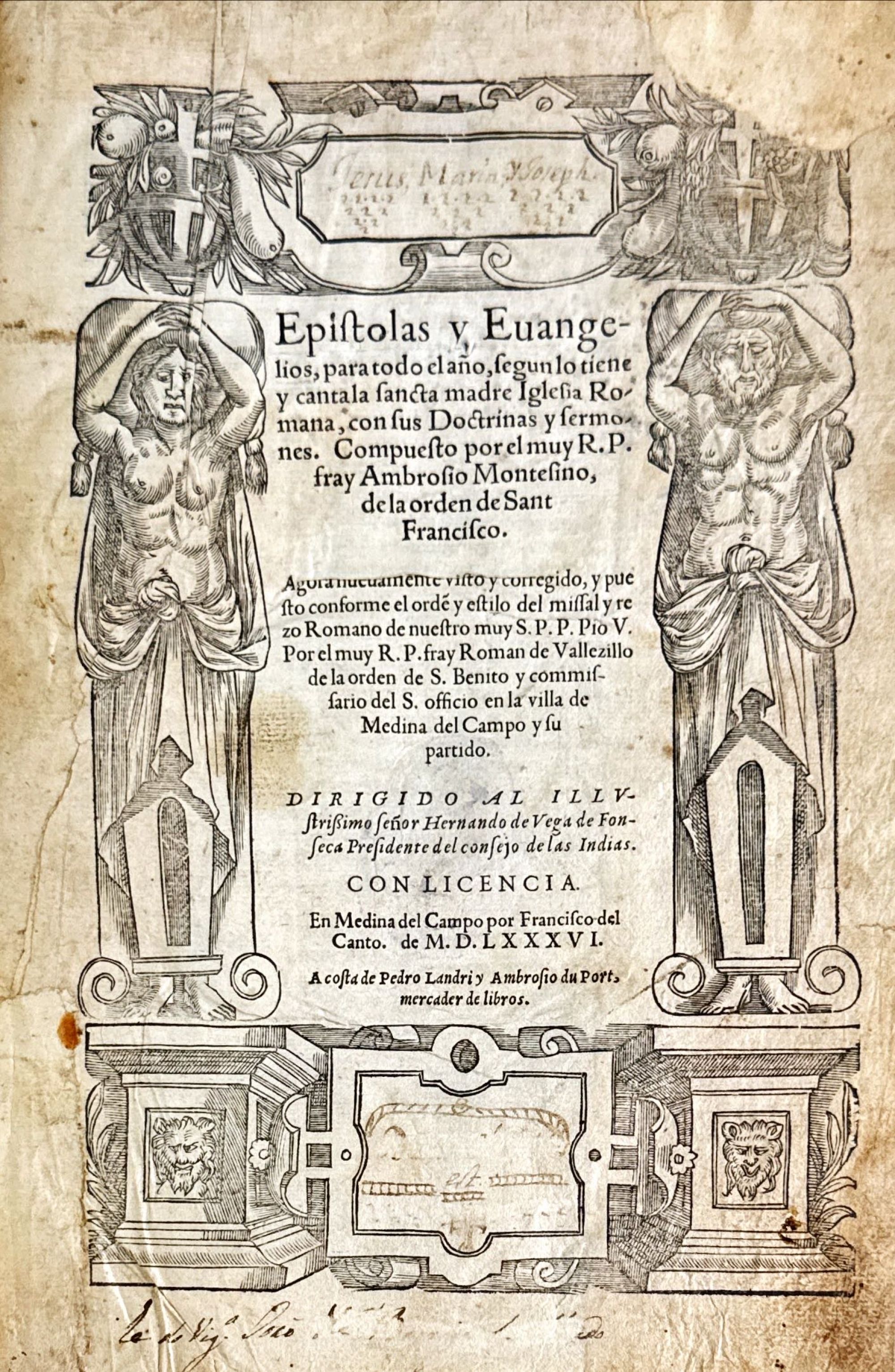 MONTESINO, Fr. Ambrosio. - EPISTOLAS Y EVANGELIOS, para todo el año, segun lo tiene y canta la sancta madre iglesia romana, con sus doctrinas y sermones. Compuesto poel el muy R. P. fray Ambrosio Montesino, de la orden de Santg Francisco // Agora nueuament visto y corrigido, y puesto conforme el orde y estilo del missal y rezo Romano de nuestrol muy S. P. P. Pio V. Por el muy R. P. fray Roman de Vallezillo de la orden de S. Benito y commissario del S. officio en la villa de Medina del Campo y su partido. En Medina del Campo por Francisco del Canto. 1616. In-4º de [26], 574 págs. Enc.